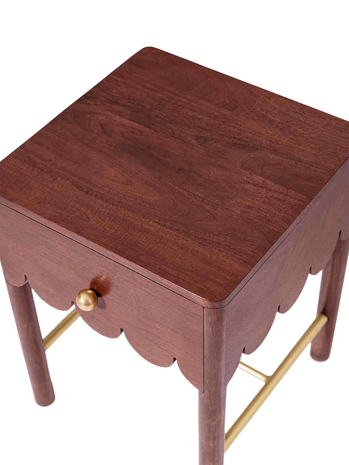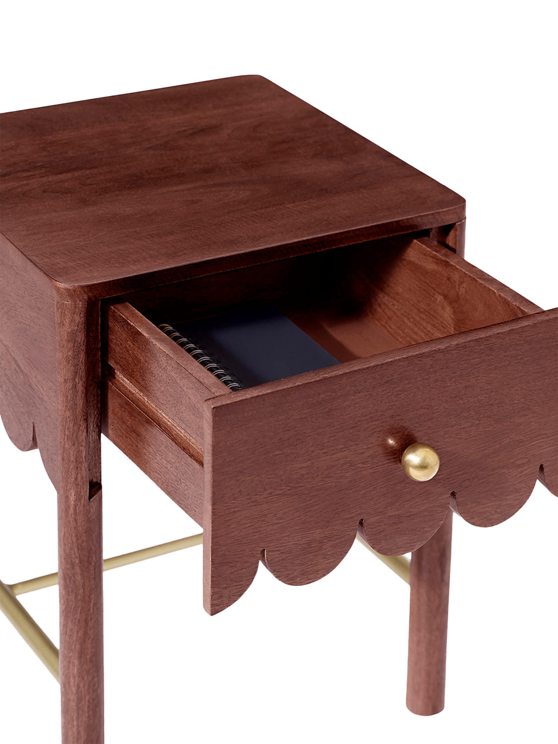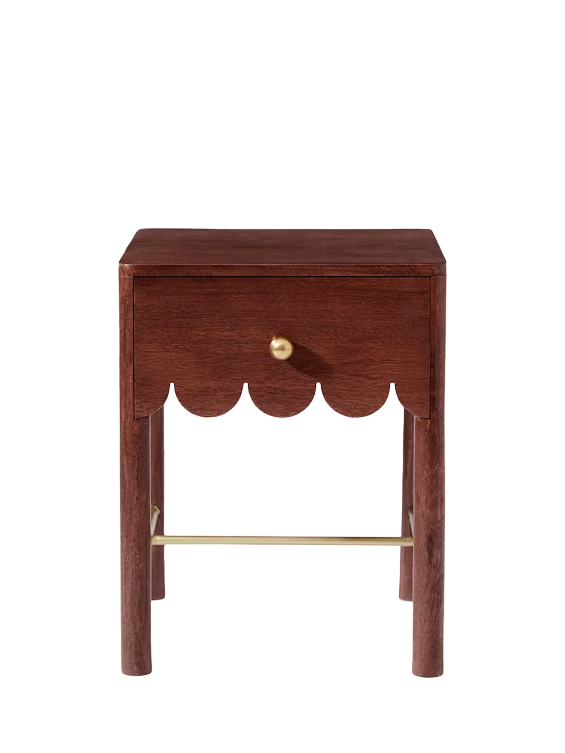 Playful, poised and perfectly formed – Swoon's Lula bedside table is crafted from rich mango wood. Its scalloped drawer edge brings a soft, whimsical charm to an otherwise simple silhouette. The single drawer, punctuated with a neat brass knob, is practical without losing elegance. Designed to slip easily into bedrooms or living spaces, it’s a compact accent that balances function with a wink of character.