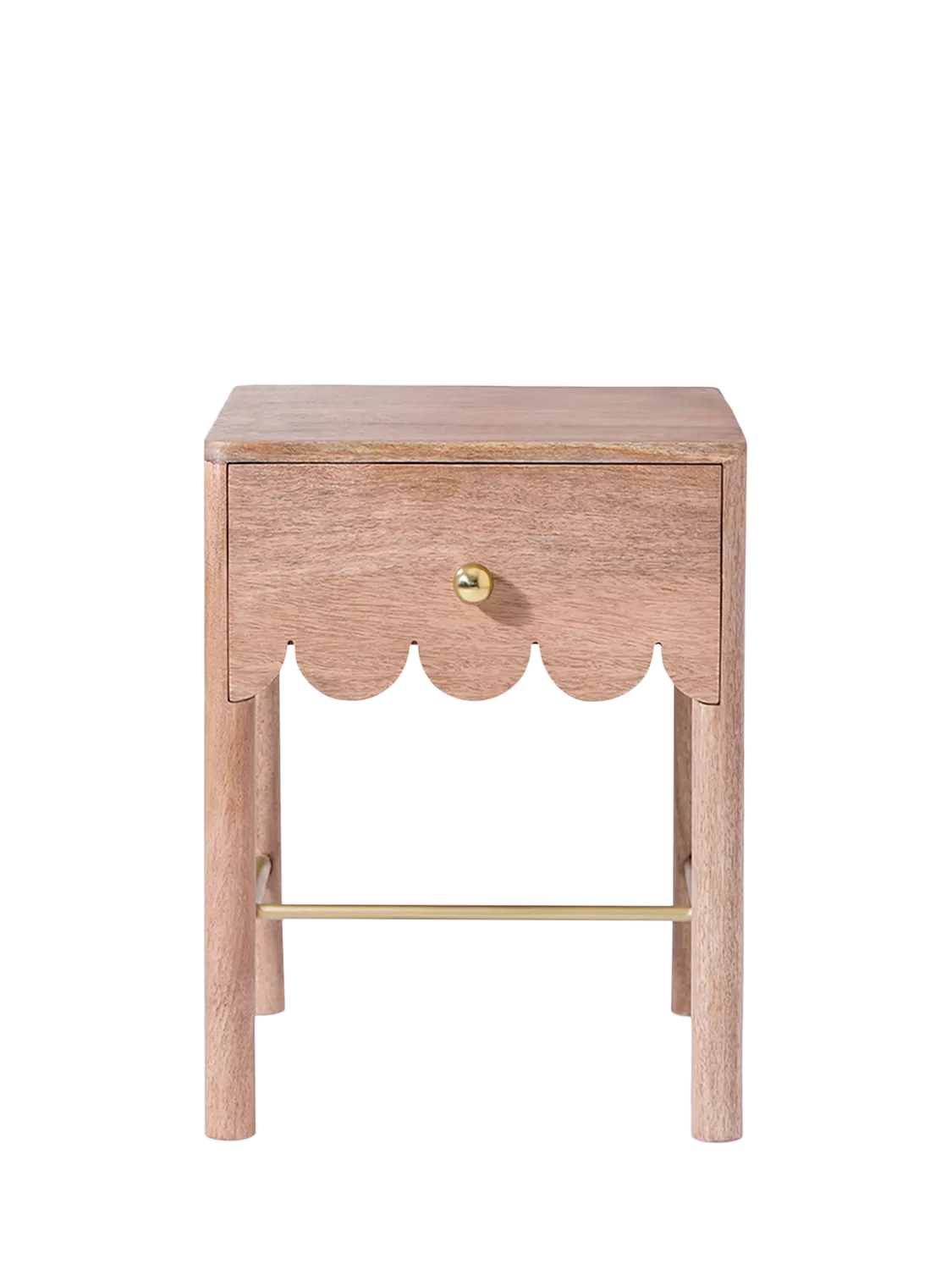 Playful, poised and perfectly formed – Swoon's Lula bedside table is crafted from rich mango wood. Its scalloped drawer edge brings a soft, whimsical charm to an otherwise simple silhouette. The single drawer, punctuated with a neat brass knob, is practical without losing elegance. Designed to slip easily into bedrooms or living spaces, it’s a compact accent that balances function with a wink of character.