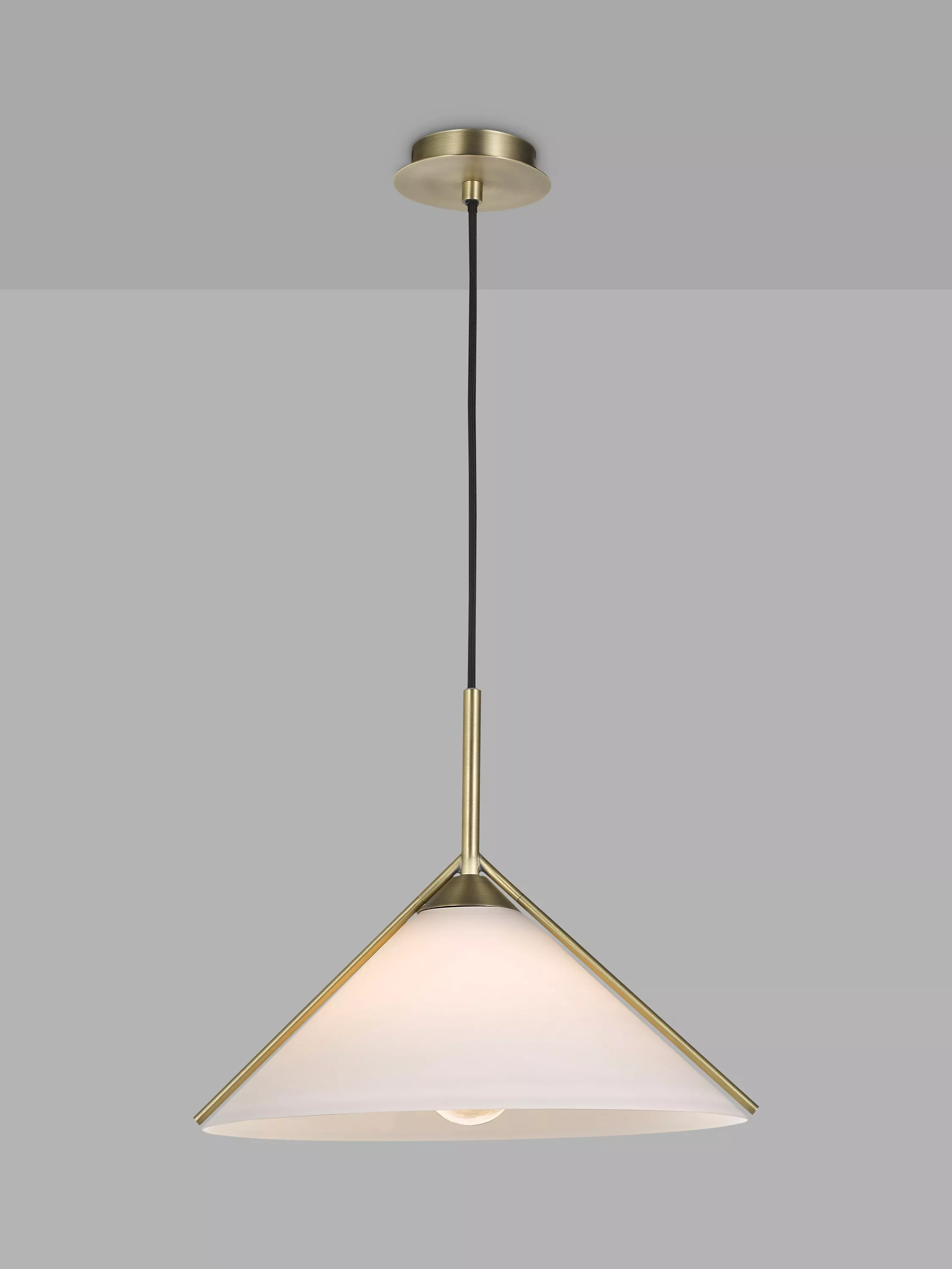 Swoon Mendel has a contemporary shallow cone shape, in beautiful matt opal white glass, with soft, matt gold metal accents and a smart black fabric cable. It would work well over a kitchen bar or dining table.