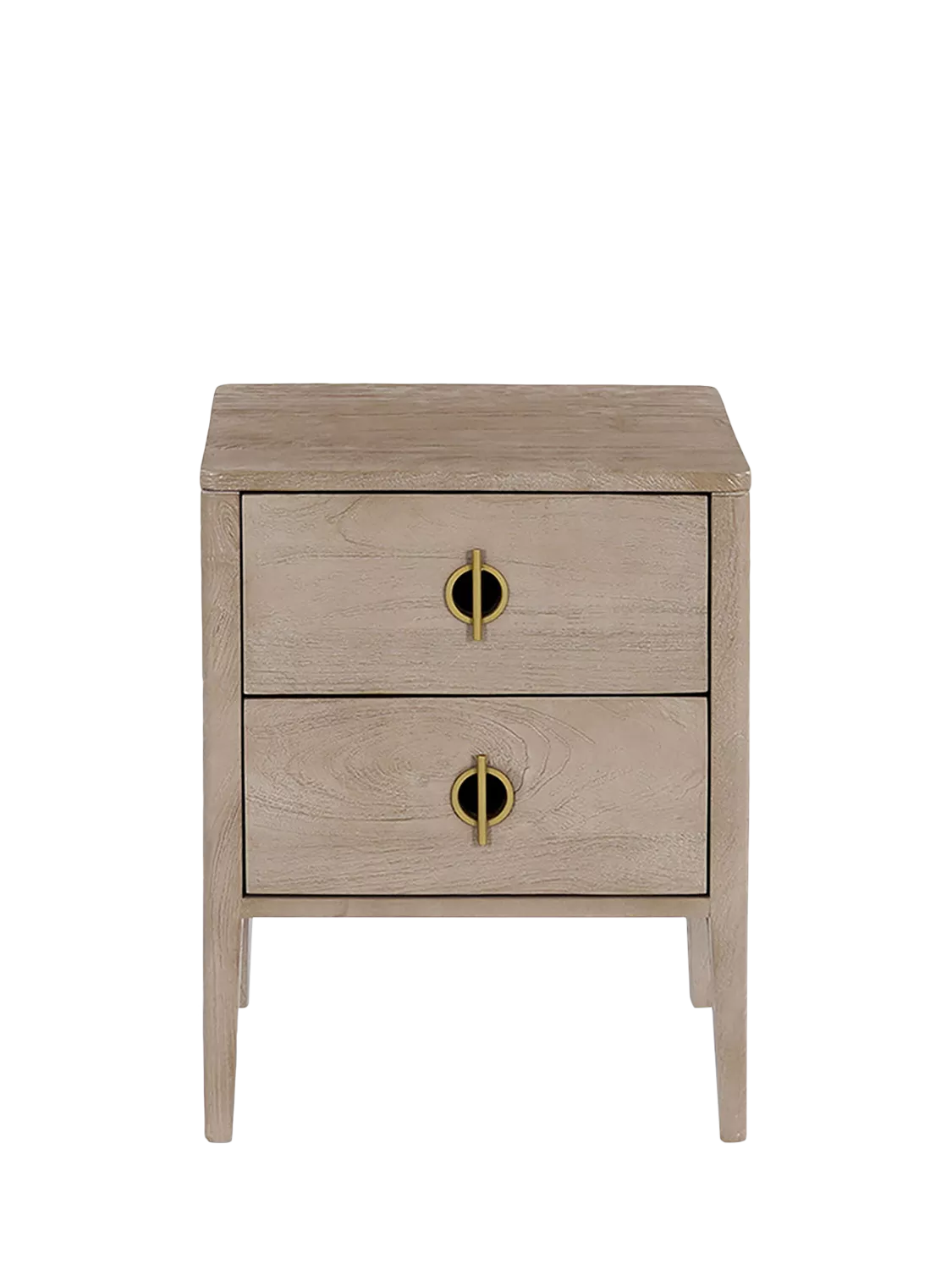 Make a bold yet refined statement in your bedroom with the Morse Bedside Table. Expertly crafted from sandblasted mango wood, its striking natural grain bring a sense of depth and warmth to any space. The standout circular brass handles add an elegant, contemporary edge, while two spacious drawers provide practical storage for your nightly essentials. Elevated on slender, tapered legs, the Morse combines timeless craftsmanship with modern sophistication, creating a versatile piece that enhances both classic and modern interiors.