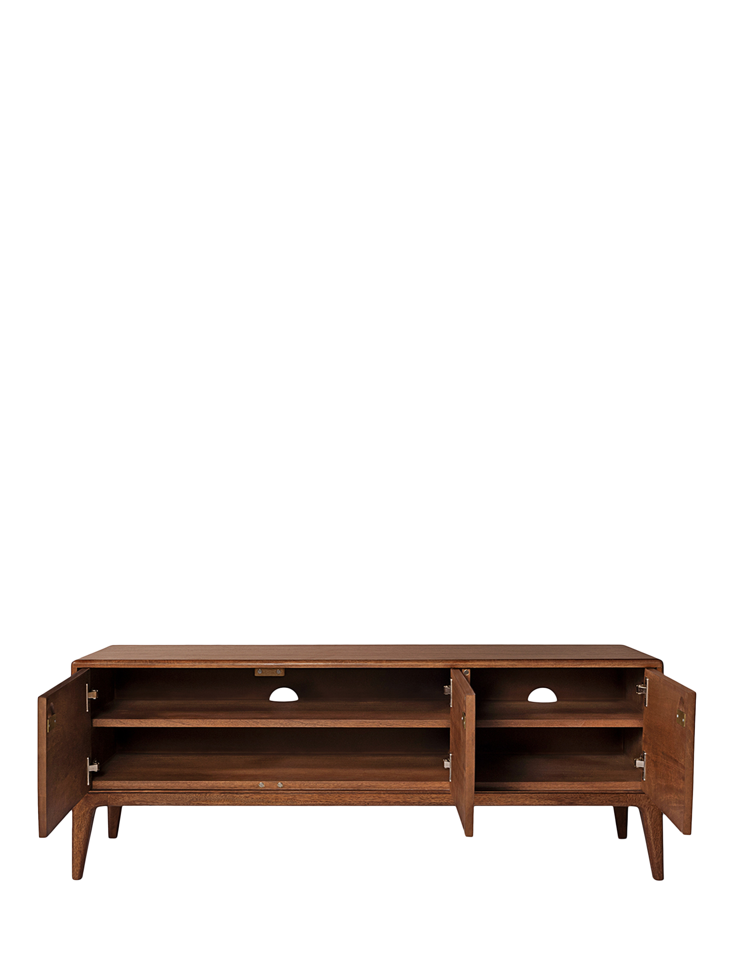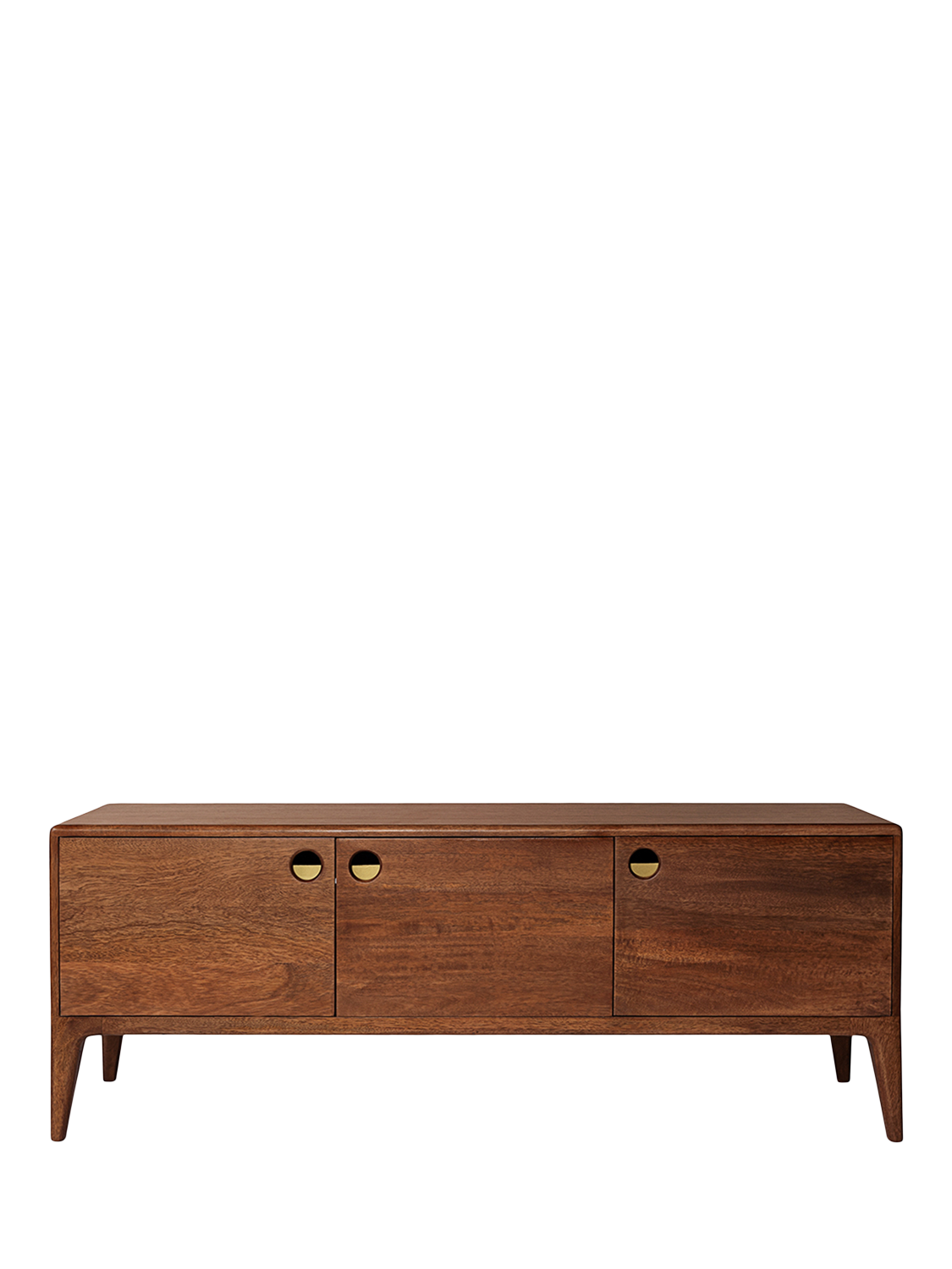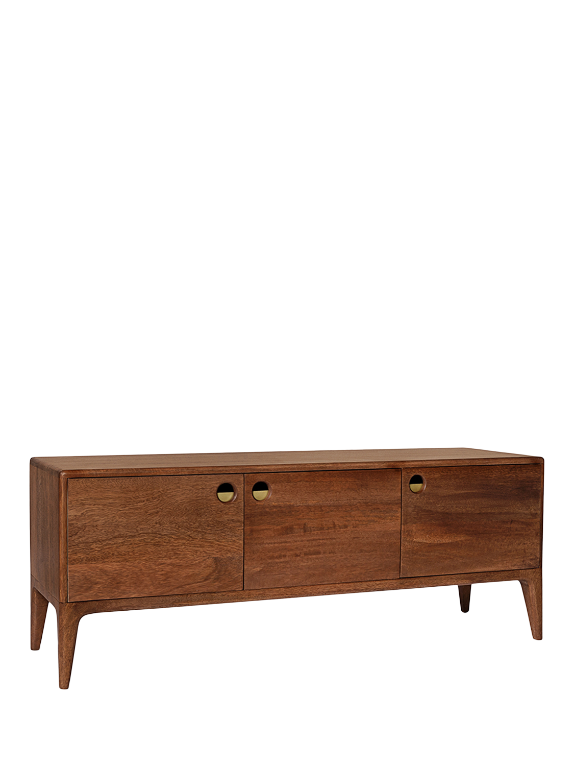 We're taking you back in time to 1970s Scandinavia, and it's one hell of an adventure! Named after a Swoon designer's favourite street in Copenhagen, this light brown mango wood media unit epitomises everything we love about late Mid-Century Modern style fused with Scandi design. Tapered legs, warm tones, smoothly shaped angles, a flash of brass, asymmetrical doors - the Nyhavn has it all.