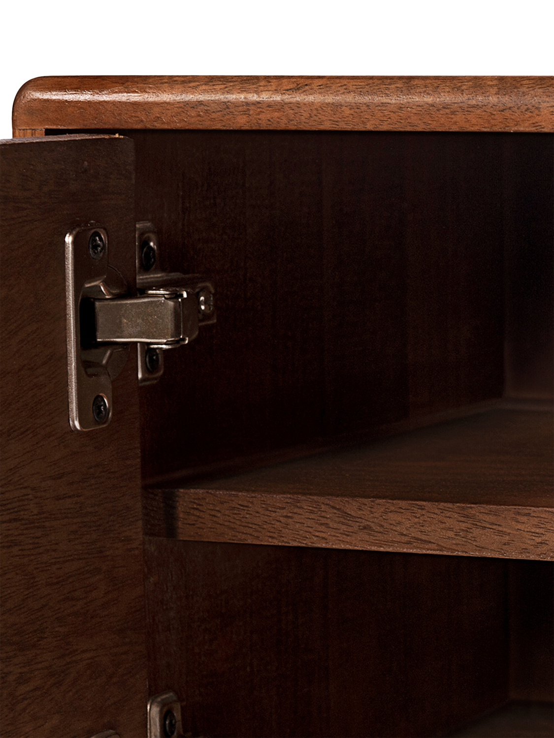 - Materials: mango wood body, legs, skirt, doors and shelves, solid brass handles. Finish: wood stained in light brown and sealed, polished brass.