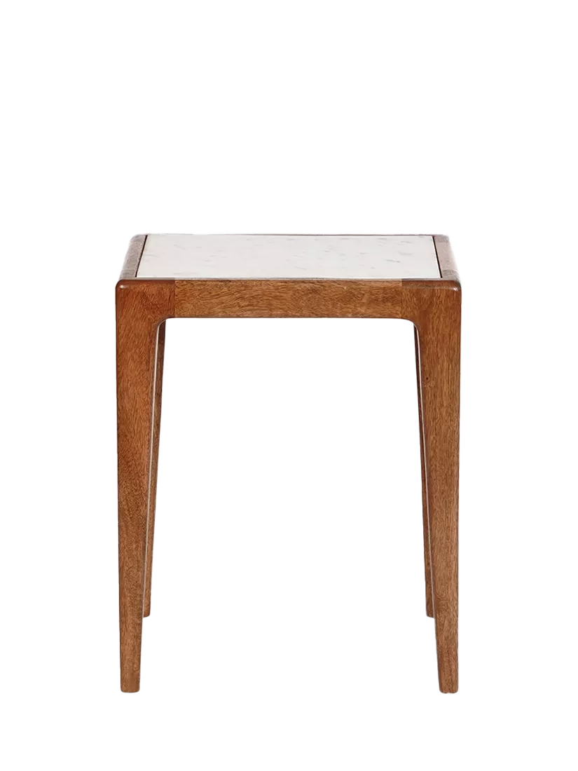 - Materials: mango wood framework and legs, white marble table top, enigneered marble underlay. Finish: wood stained light brown and sealed, polished marble with underlay painted white.
