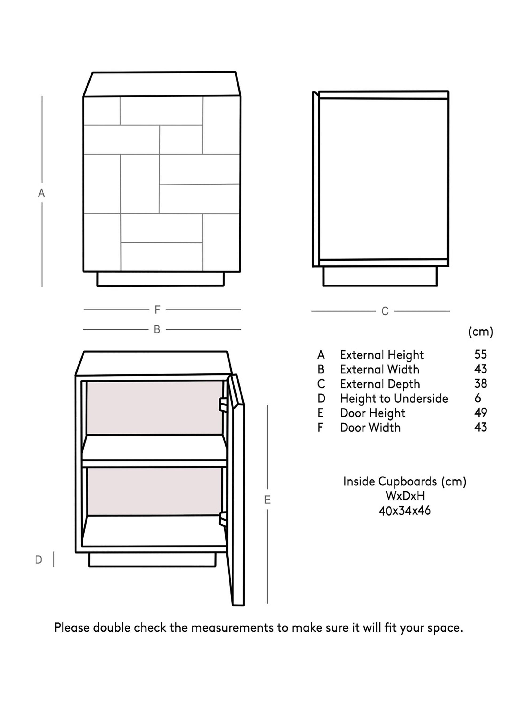 - Cupboards: H46cm x W40cm x D34cm.