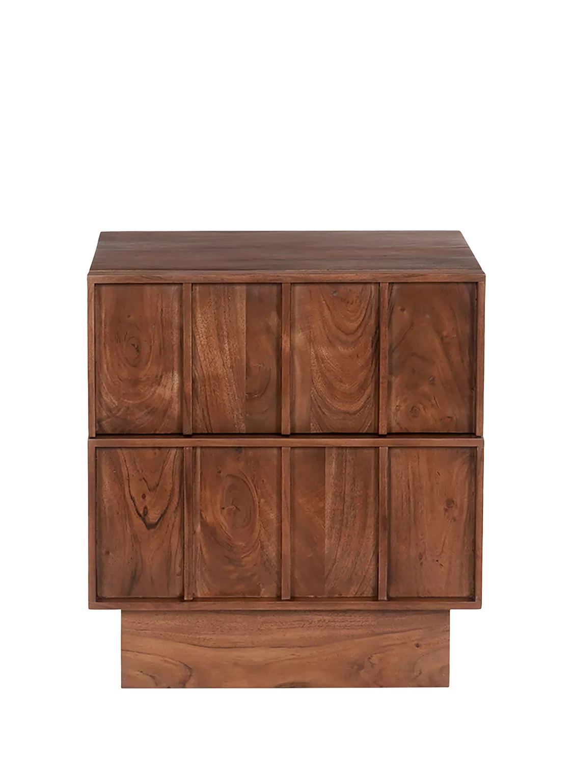 Bring timeless elegance and striking craftsmanship to your bedroom with the Sandon Bedside Table. Handcrafted from rich, solid wood, its bold geometric design and natural wood grain make it a statement piece that complements any interior, from contemporary minimalism to rustic chic. Two spacious drawers offer practical storage for your nighttime essentials, while the sturdy pedestal base ensures stability and durability for years to come. Elevate your space with a piece that marries modern sophistication with artisanal charm.