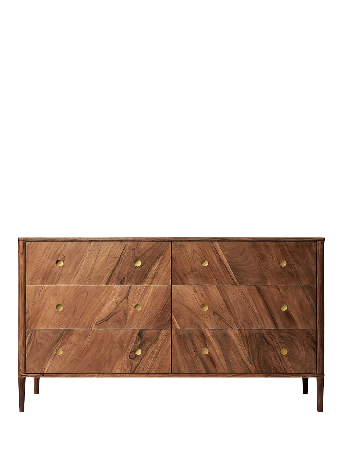 Crafted for those who appreciate natural beauty and clean lines, the Shale chest blends rich wood grain with soft brass accents. With six spacious drawers and timeless mid-century flair, it’s the perfect balance of form and function.