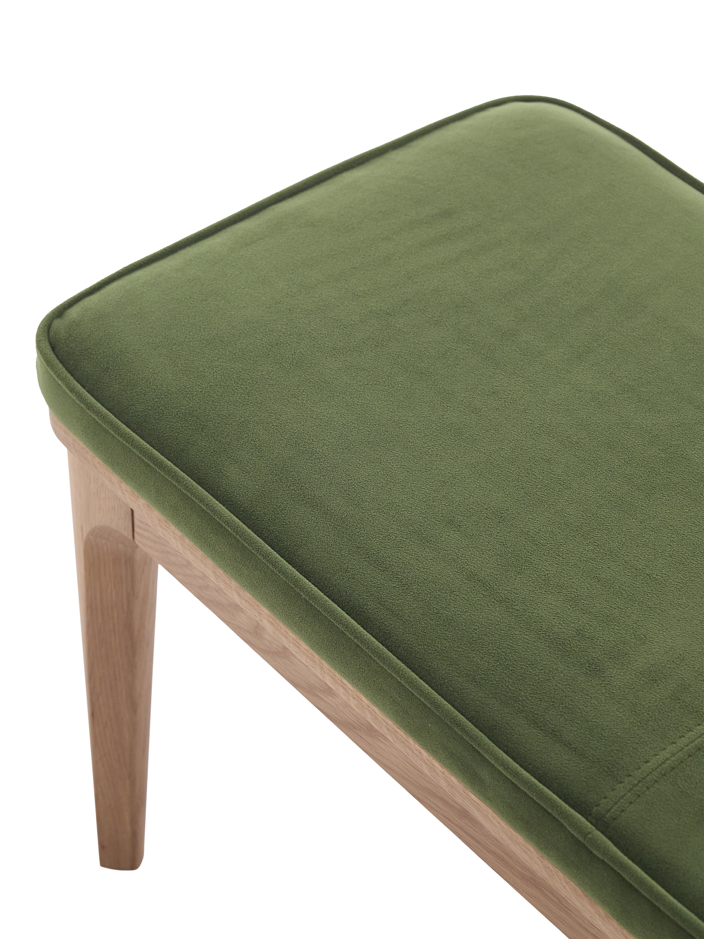The solid white oak legs echo the chamfer detailing on the dining table and the fixed upholstered seat cushion has piped detail edging.
