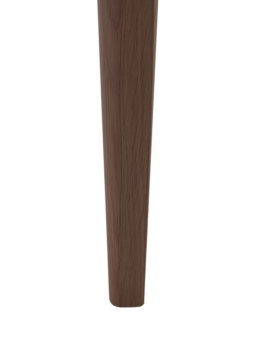 The solid white oak legs echo the chamfer detailing on the dining table and the fixed upholstered seat cushion has piped detail edging.