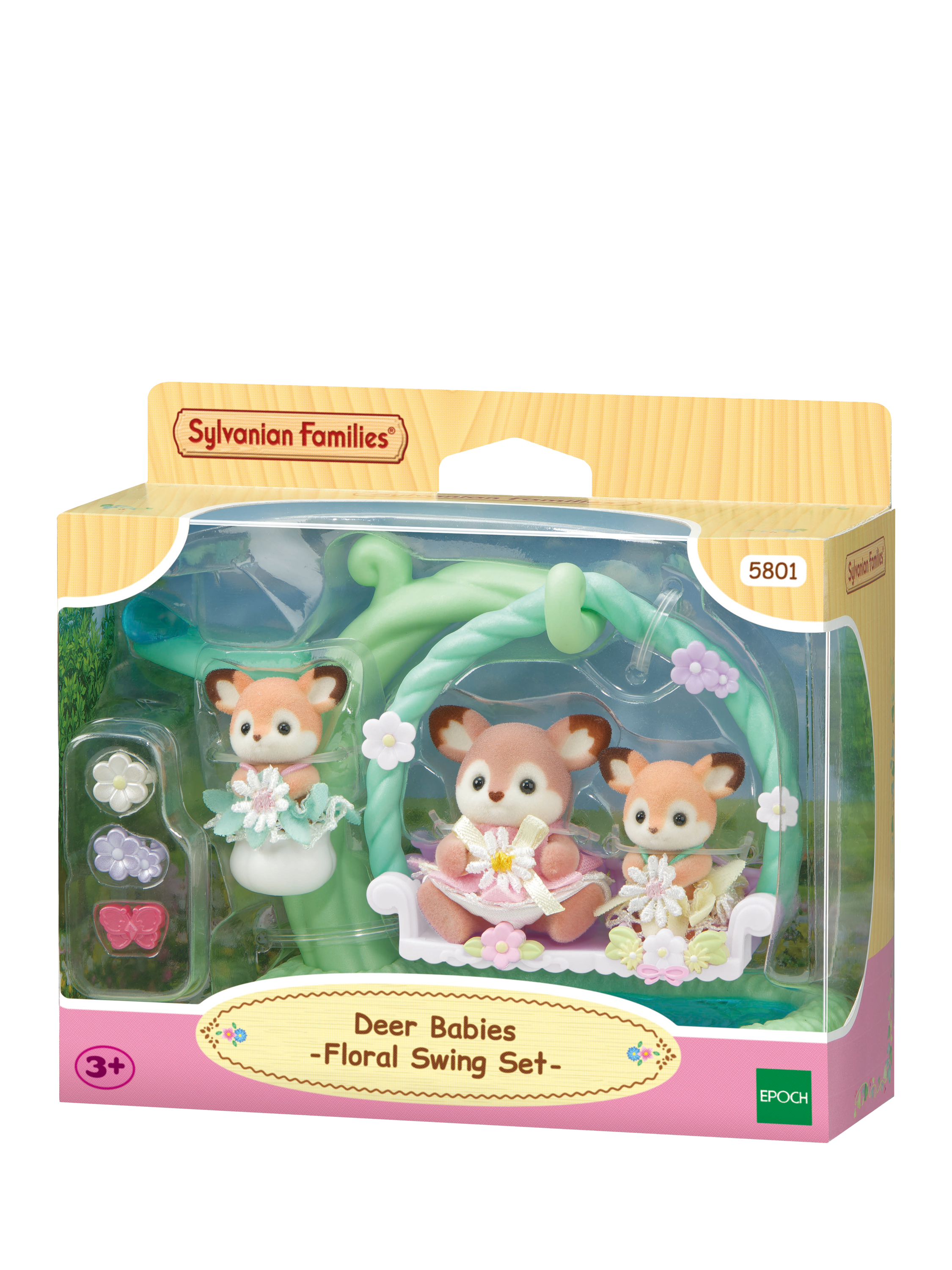 The Deer family have adorable big ears. This set contains the Deer baby and cradled babies in matching floral outfits with an ivy swing and lily of the valley cradle. The babies can sit in the swing by the water or in the lily of the valley cradle. The figures have different colours and ear patterns! The cradled babies are caramel-coloured, while the baby is cocoa-coloured with petal-patterned ears. There are flower and butterfly ear decorations for the babies to wear. The babies can also sit on the leaf, which has a clear drop of water on it.