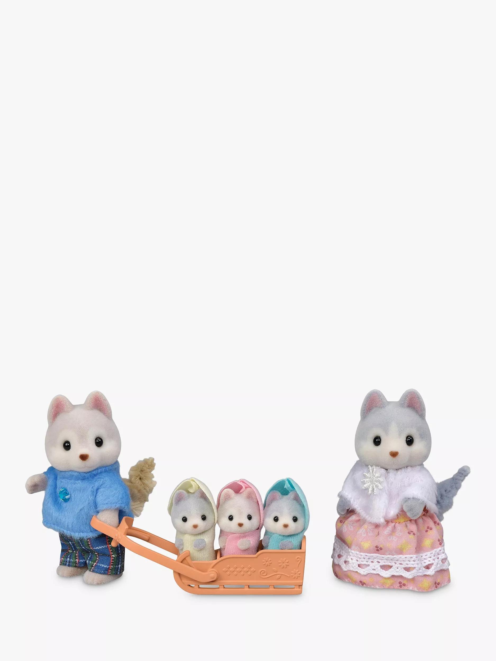Meet the Sylvanian Families Husky Family. The Huskies have beautiful grey and brown fur to keep them warm and the adorable triplets are wearing matching hooded outfits and they can ride in the sleigh! The mother and Father can also hold the sleigh and take them for a ride!