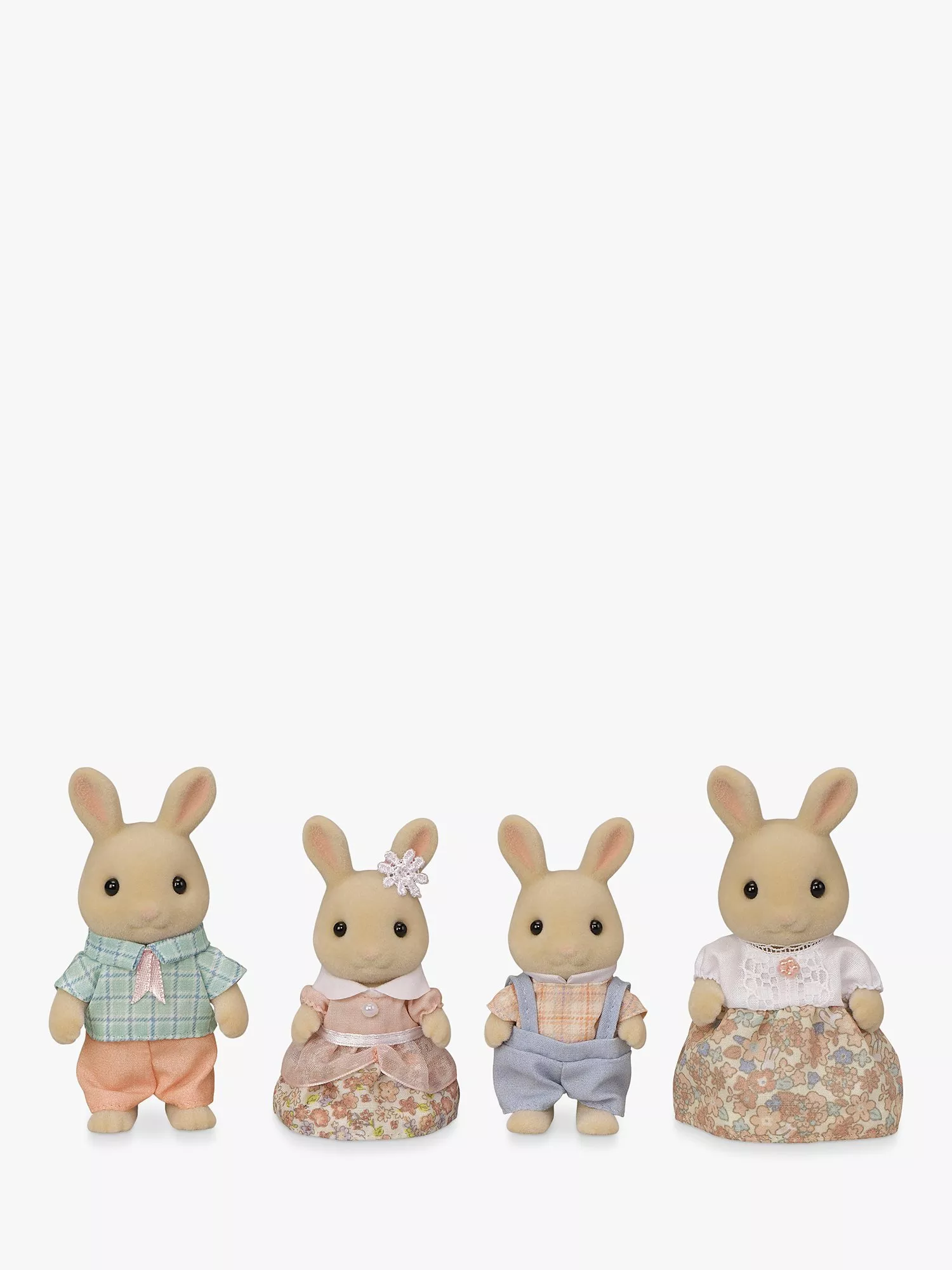Introducing the Milk Rabbit father Alex, mother Kate, and their children Rebecca and Oliver. The figures' arms and legs can be moved to put them in different poses. The mother and girl's dresses both have a charming floral pattern. The fabric clothing can be removed to change their outfits.