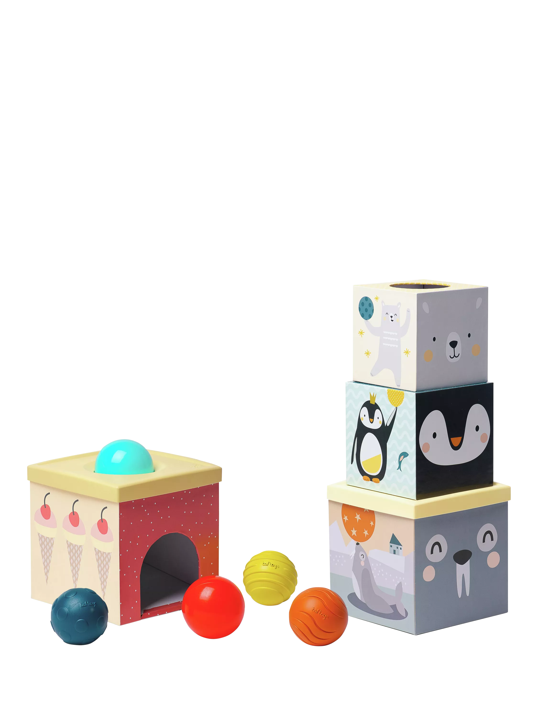 Easily stackable, the lightweight boxes all feature cute character designs and clever learning opportunities such as counting, while the balls are perfect for colour identification.