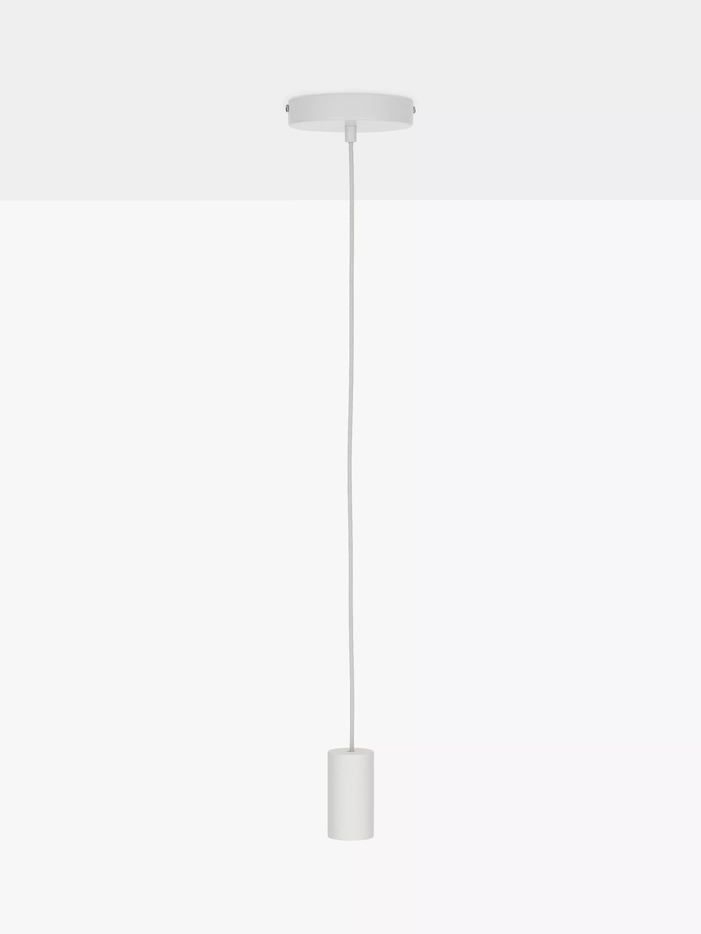 The Alumina single pendant by Tala is shaped from a solid cylinder of aluminium, the bold form is balanced by the modest, chalk-white finish. The concealed neck creates a subtle harmony between the bulb and fixtures, while the speckled grey and white braided cord unites the pendant with the similarly textured ceiling rose. Bulb not included.