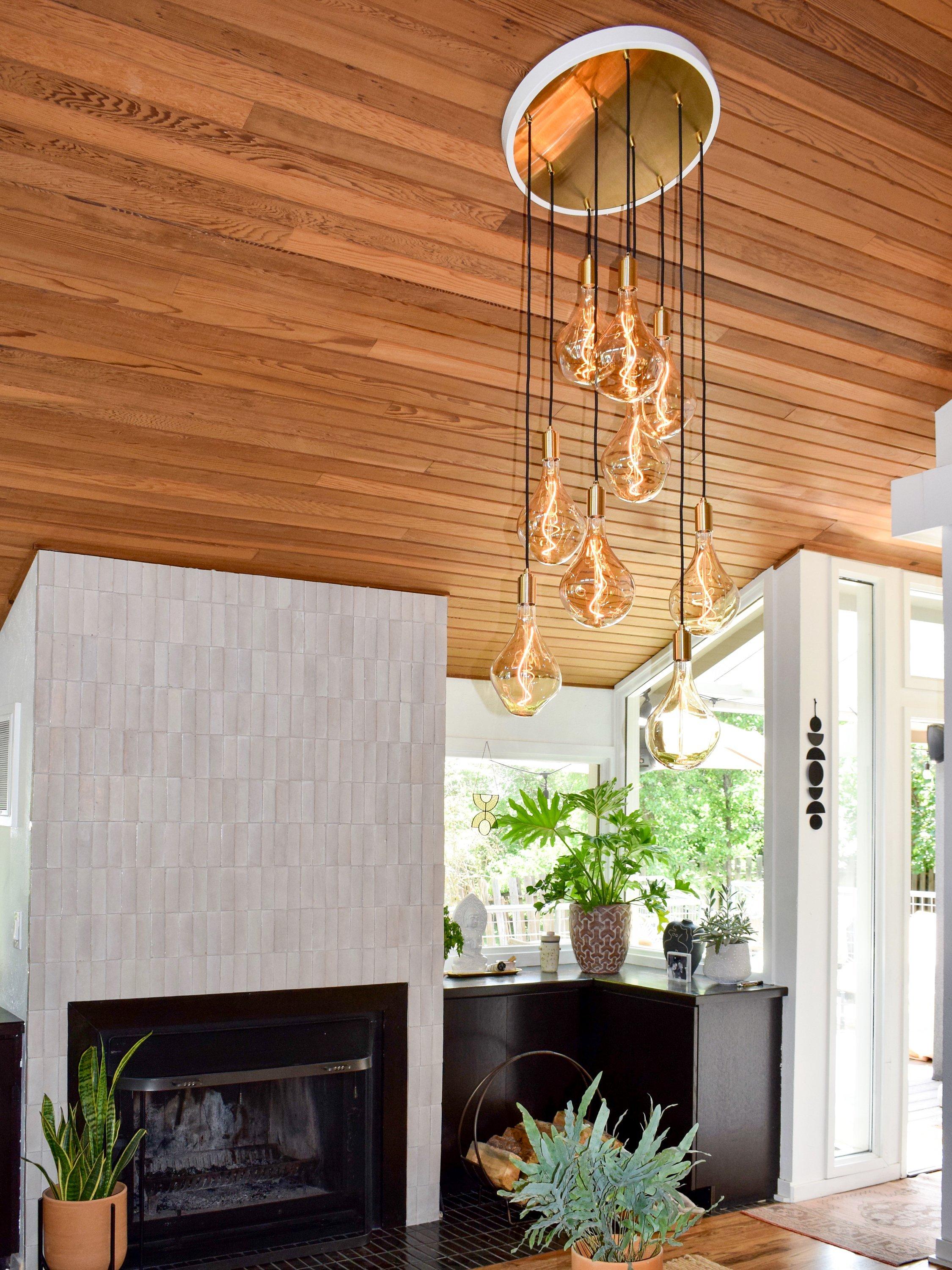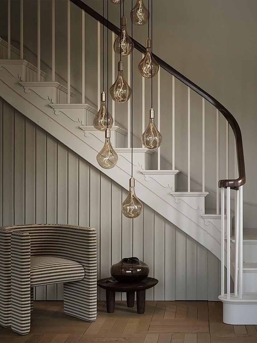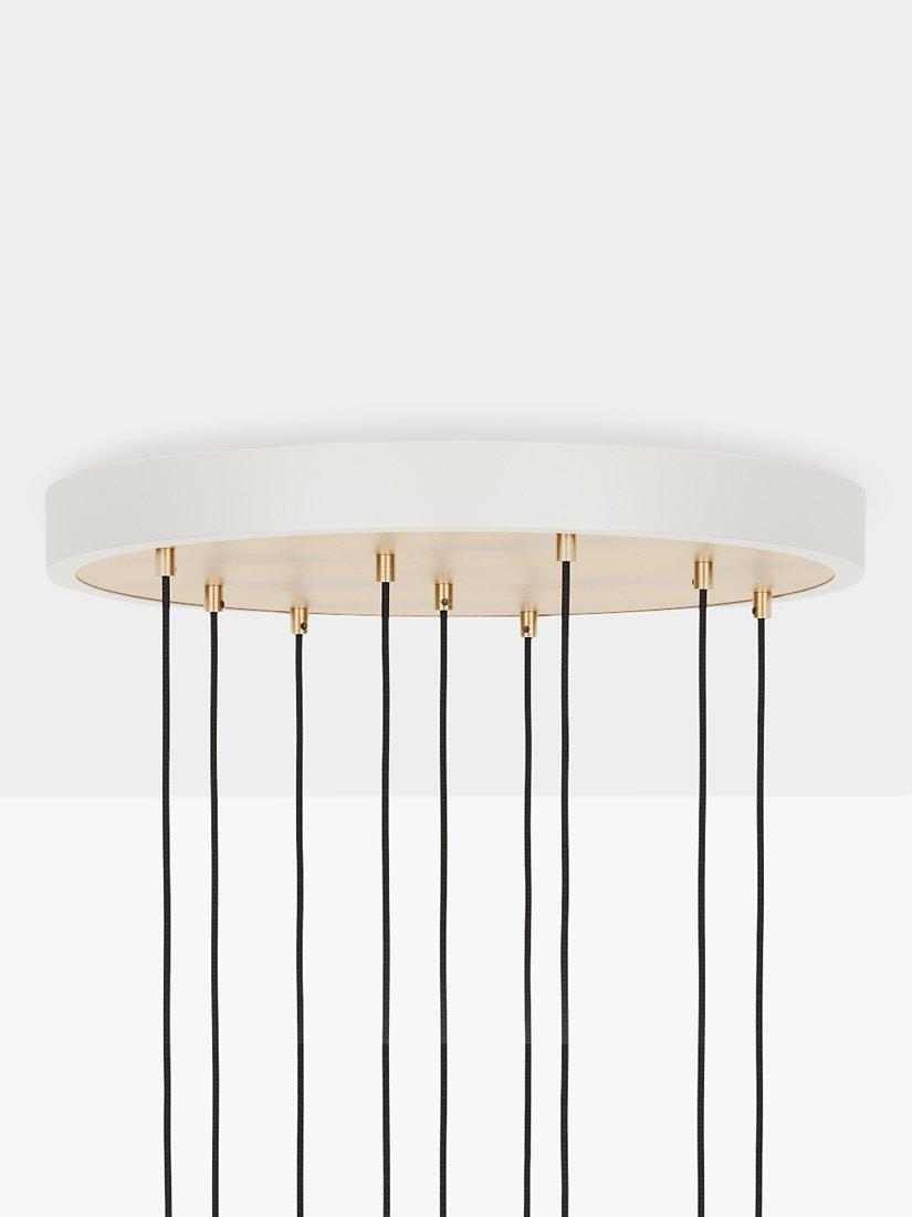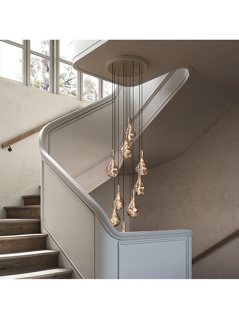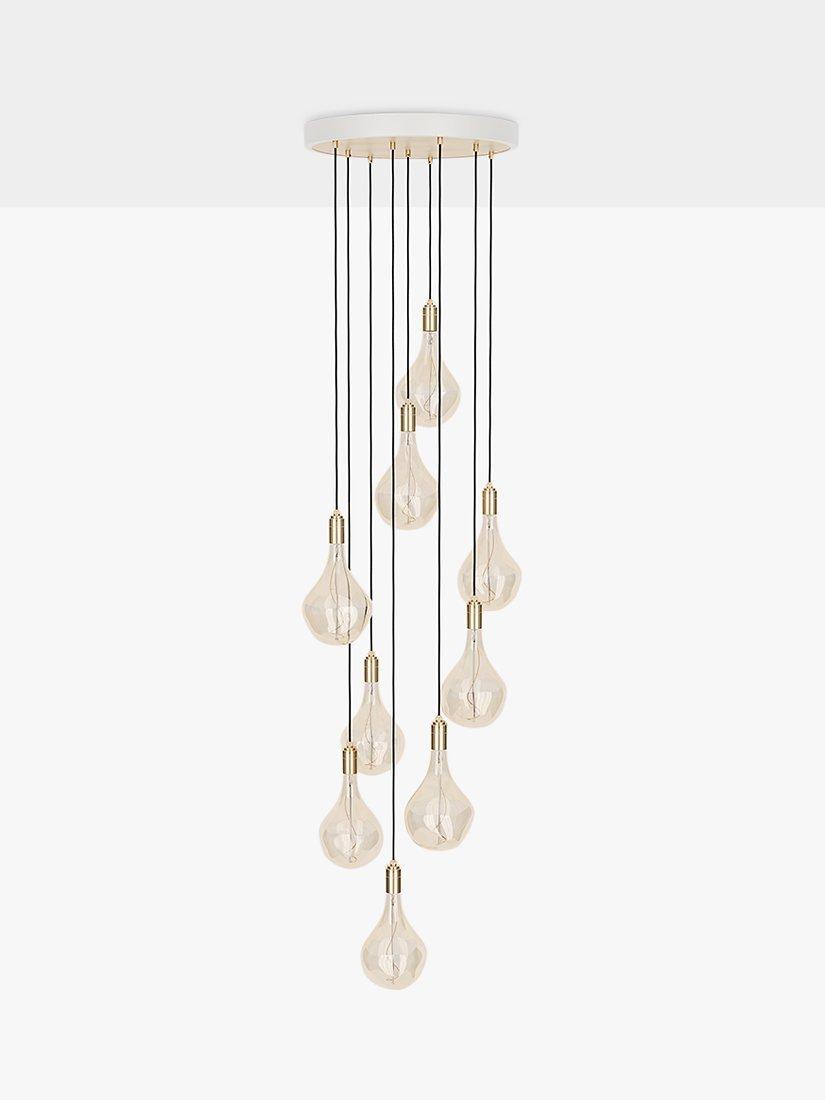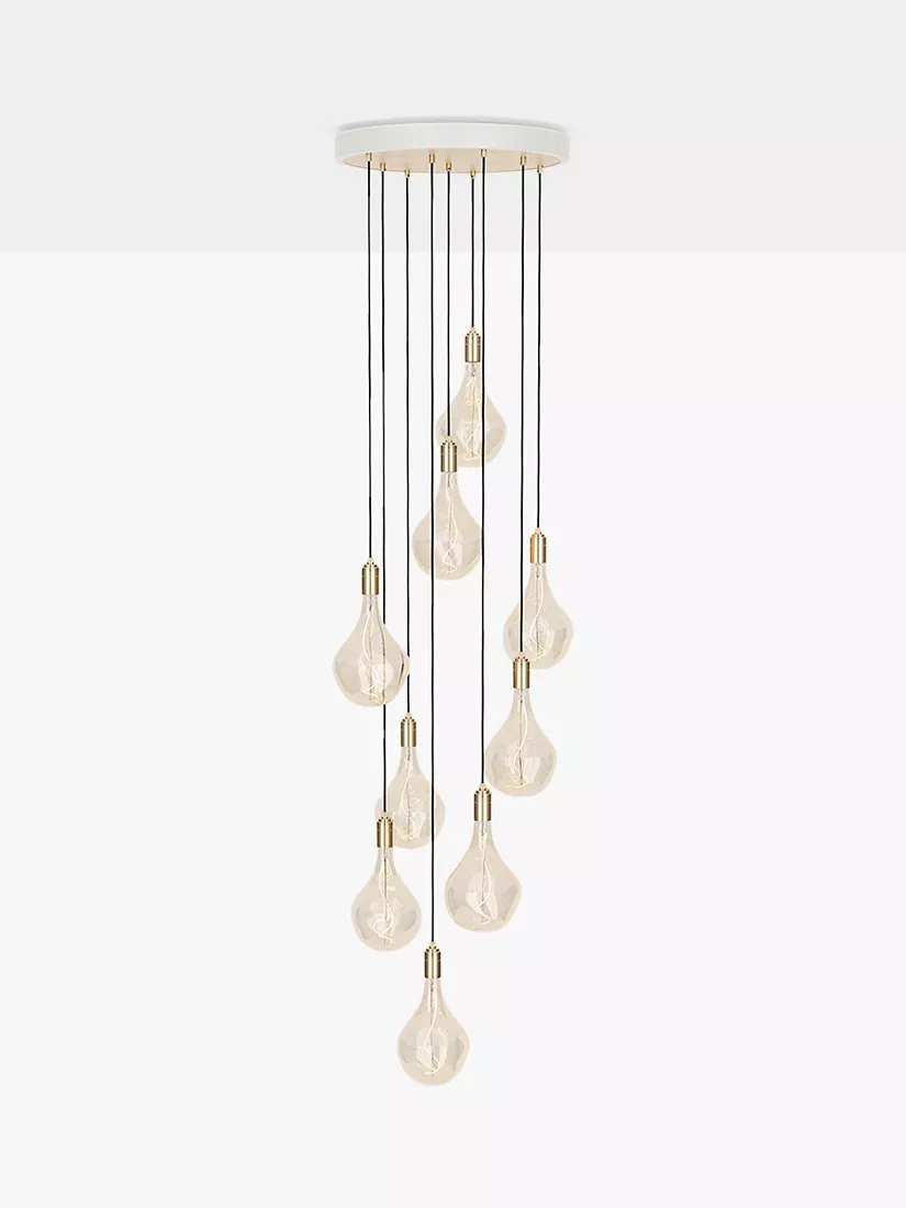 This nine pendant cluster by Tala is a statement lighting choice for modern homes. The pendants are height adjustable from a powder-coated steel ceiling rose and create a spectacular light feature when displayed at different lengths. Tala's Voronoii II bulbs are included, which have an elongated, droplet shape and eye-catching exposed filament. The glass surround is tinted for a more ambient light effect and the bulb cap is made from brass.