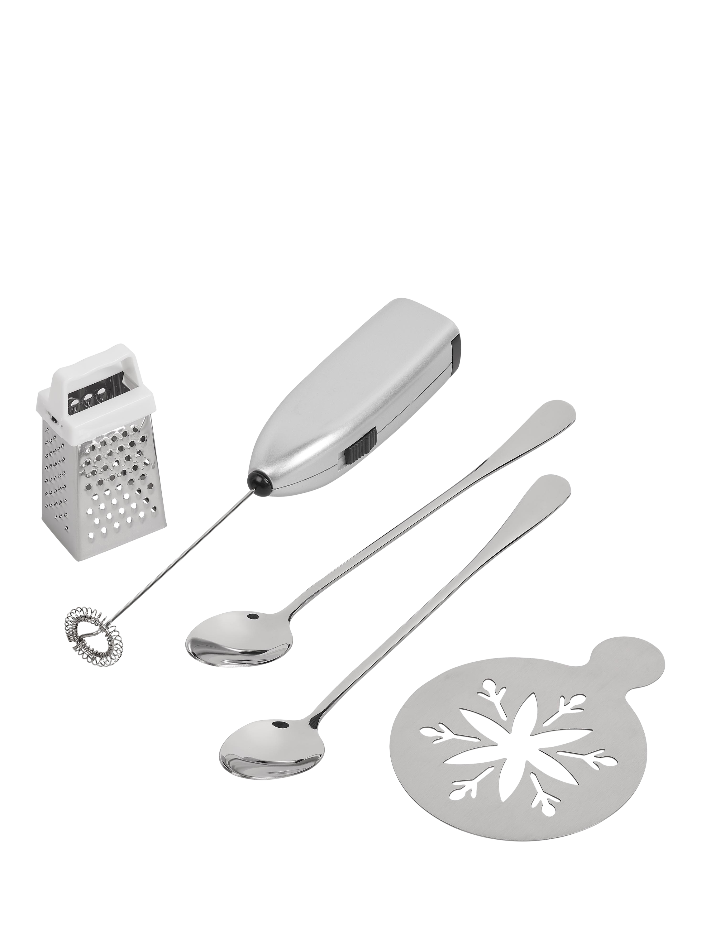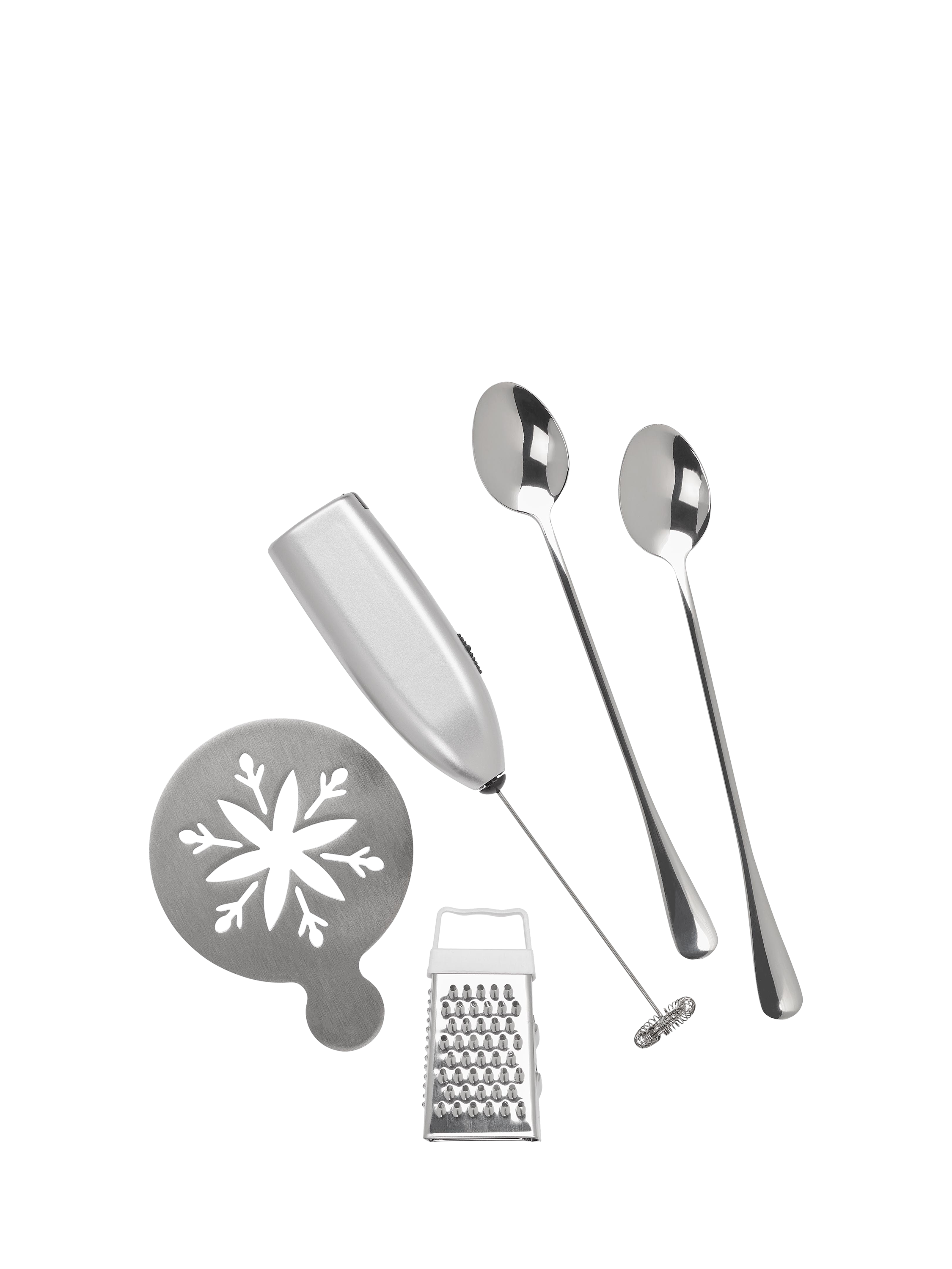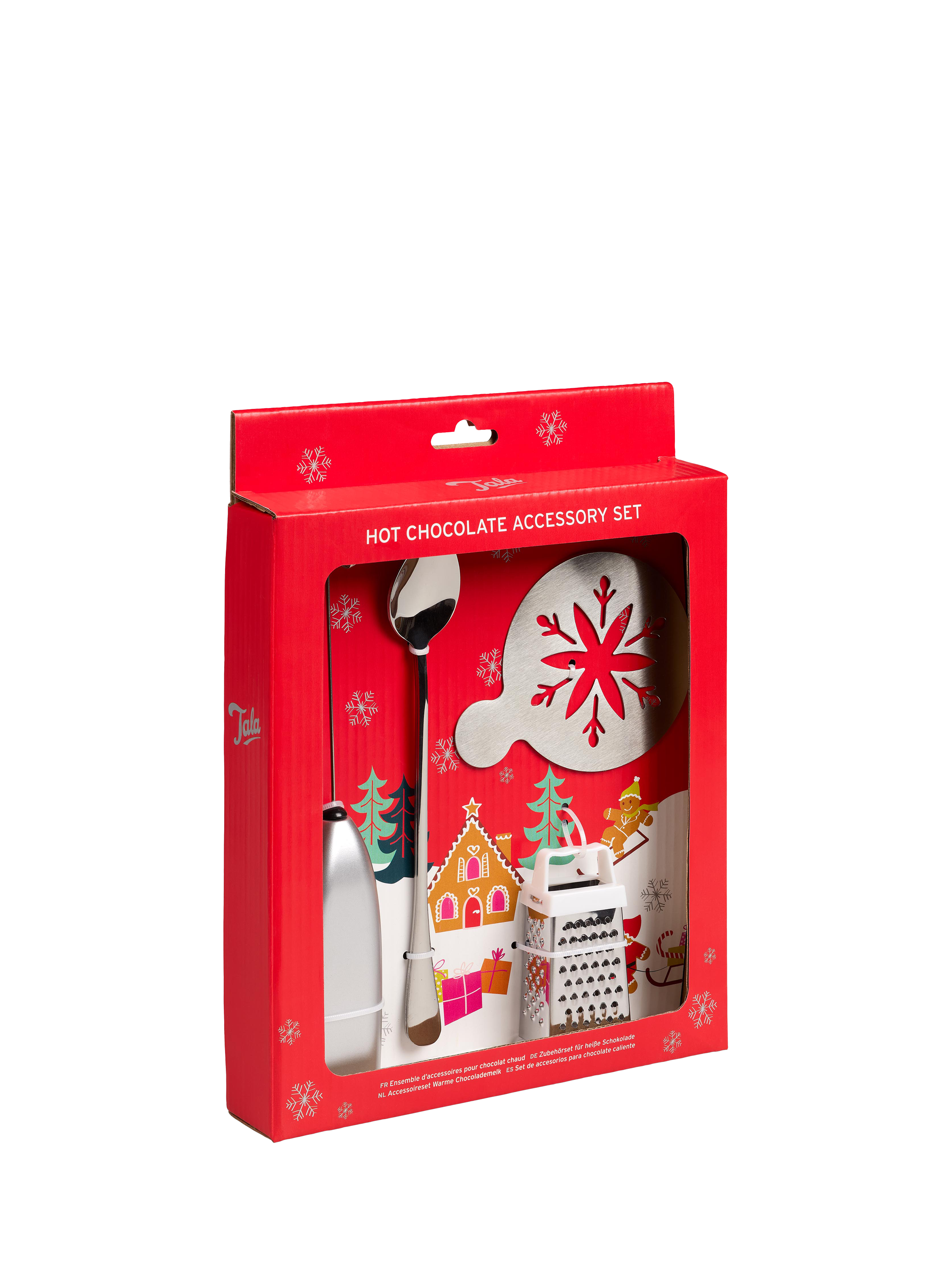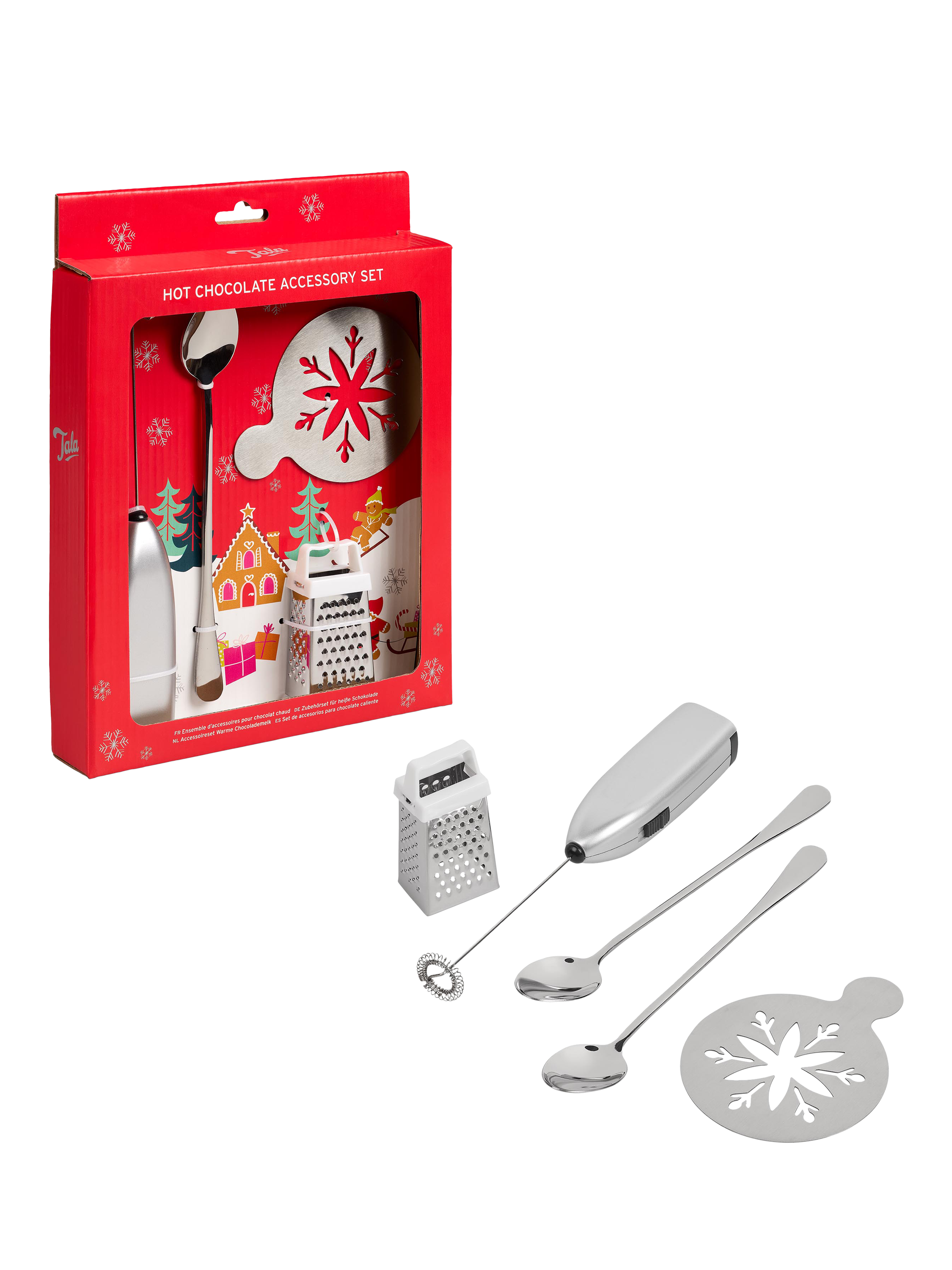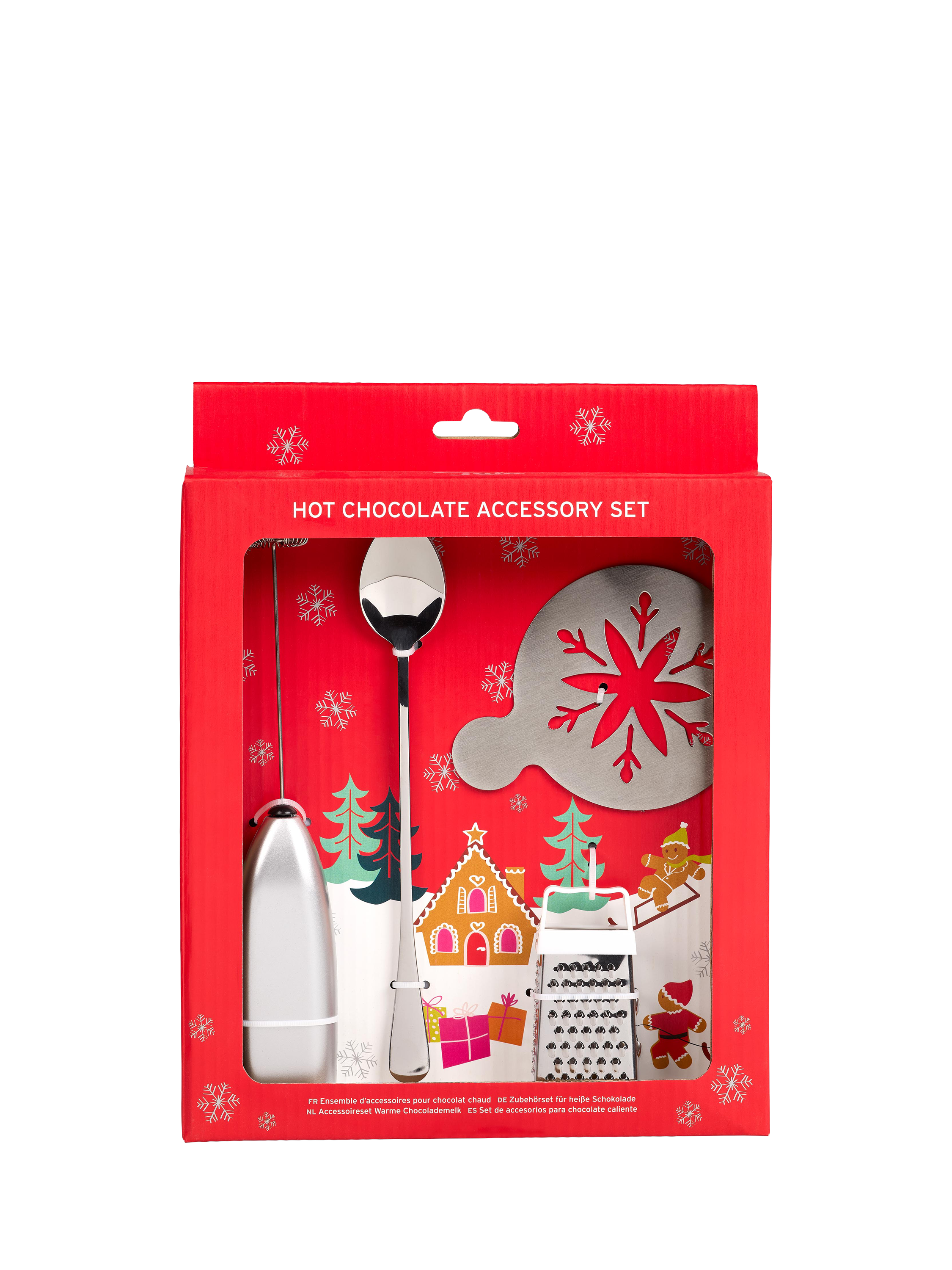Everything you need for hot chocolate, packaged in a festive print. The giftable set contains a frother, stencil, chocolate grater and long-handled teaspoon.