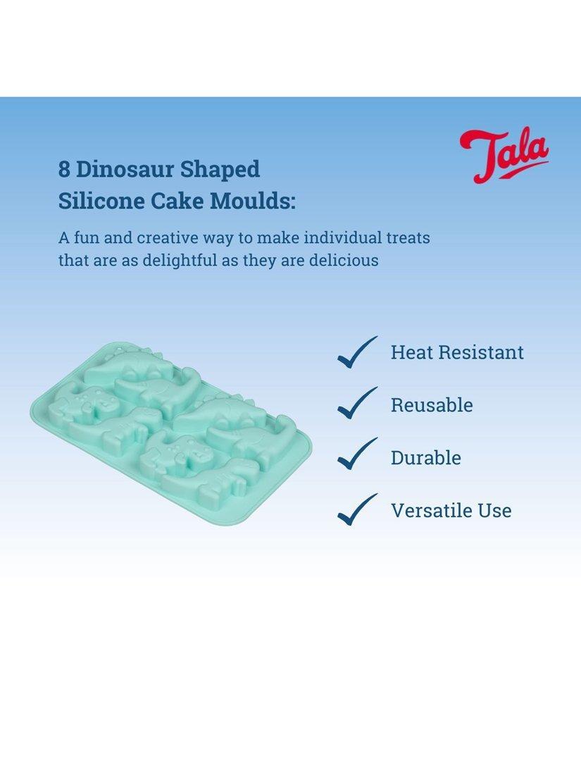 Reusable Tala silicone mould with eight dinosaur-shaped cups. Great for individual cakes and desserts. Can also be used for large ice cubes or frozen yoghurt. The flexible silicone is easy to remove. Suitable for use in the fridge or freezer, microwave, oven and air fryer. Dishwasher safe for easy cleaning.