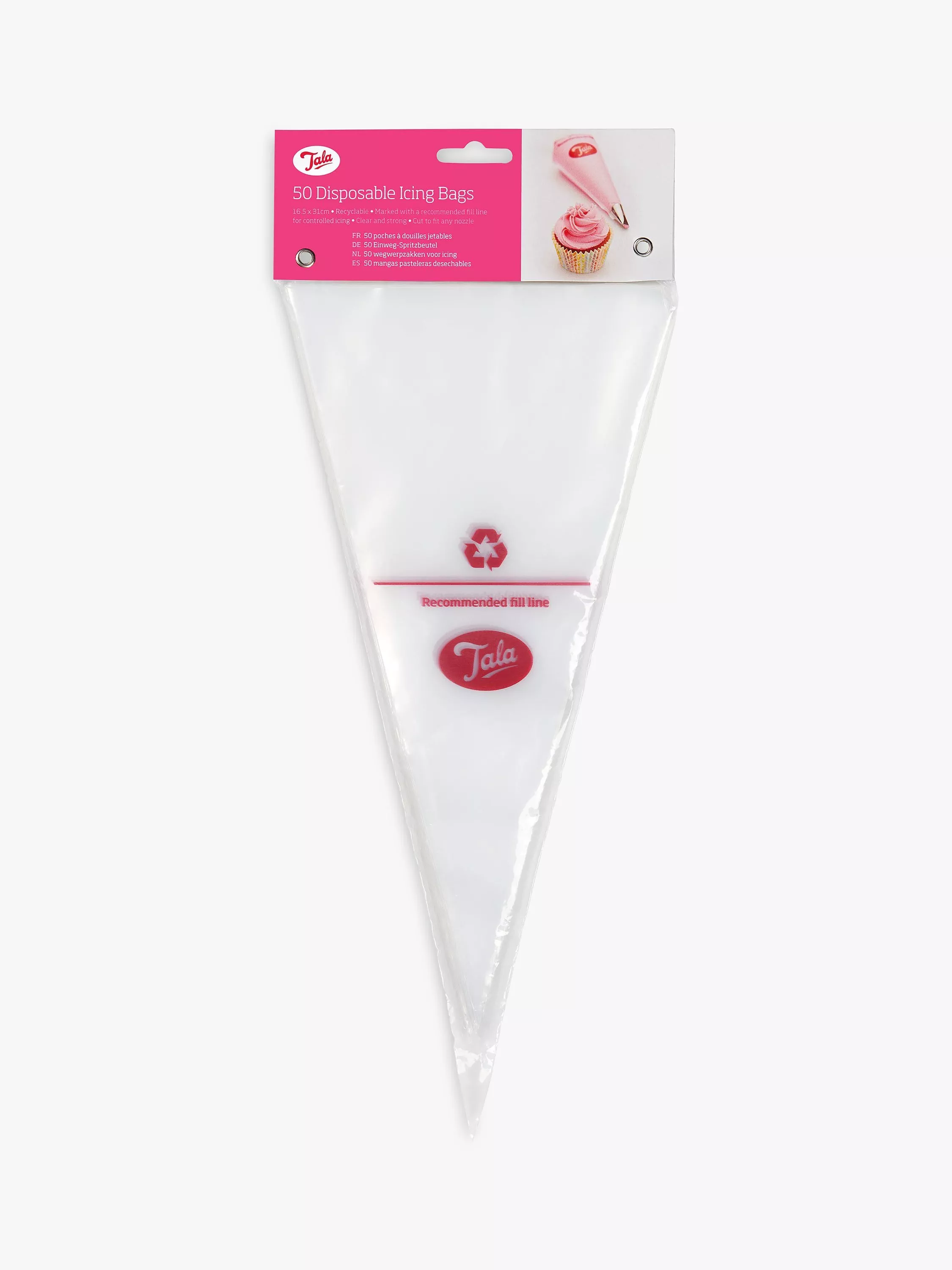 Marked with a recommended fill line for controlled icing, this pack of 50 Tala icing bags can be cut to fit any icing nozzle. The clear bags are made of recyclable plastic.