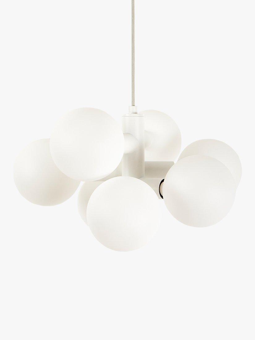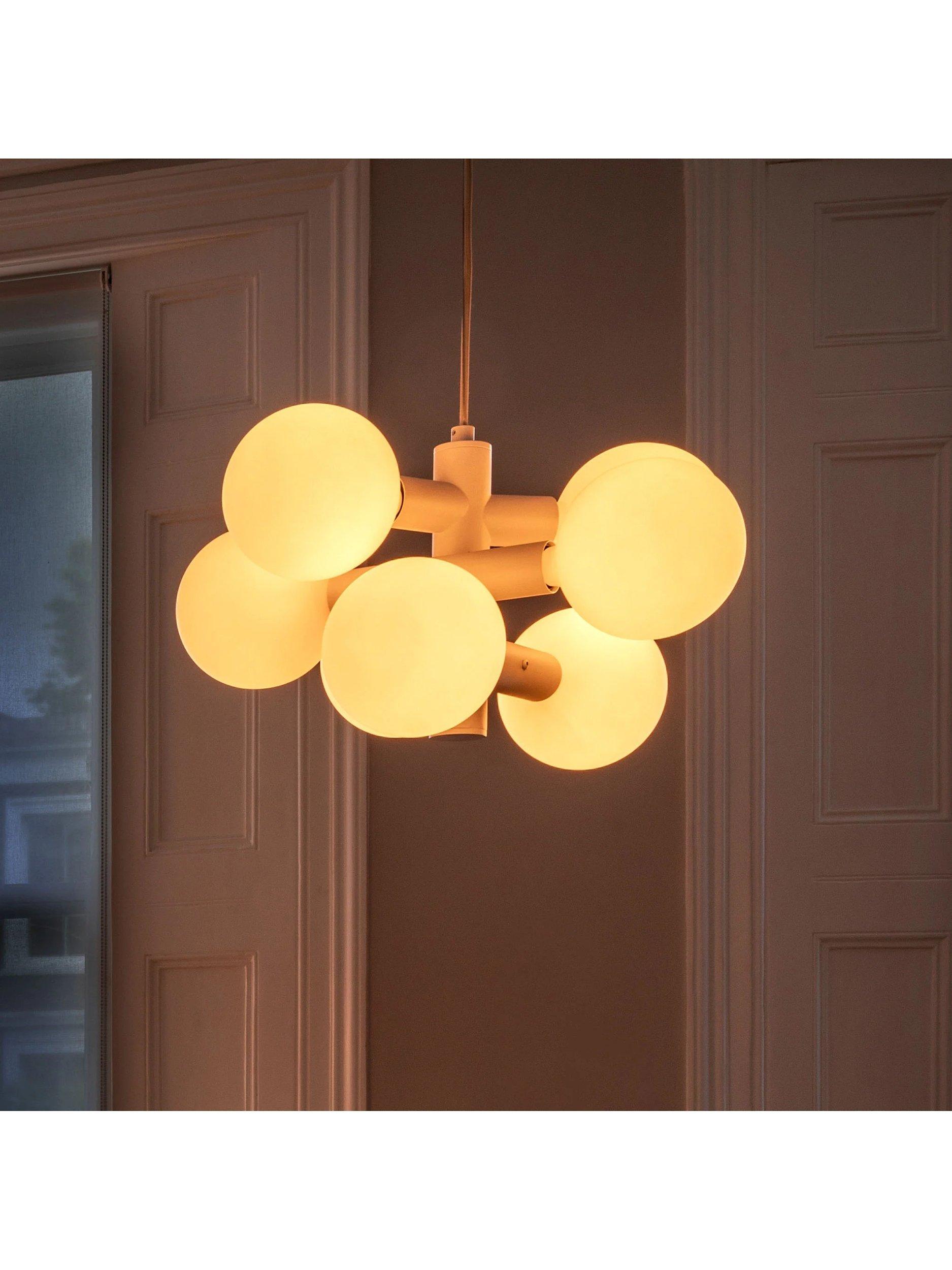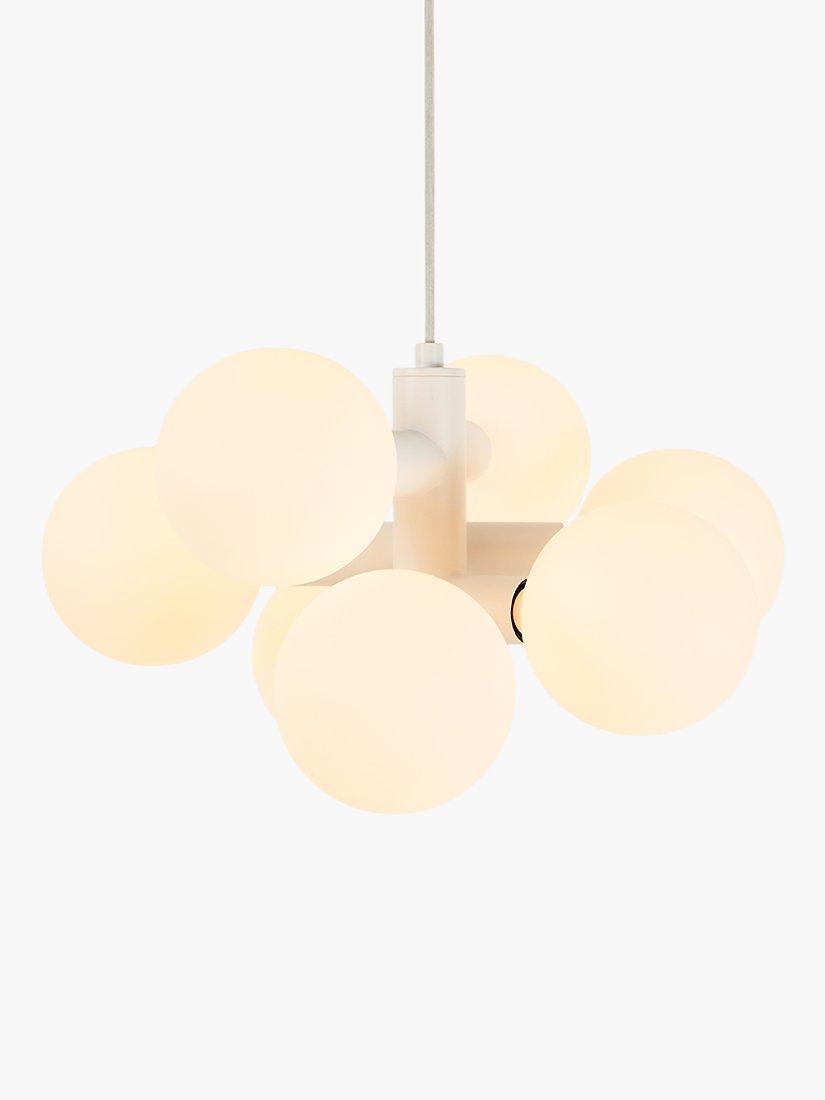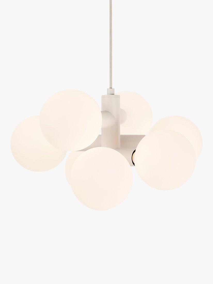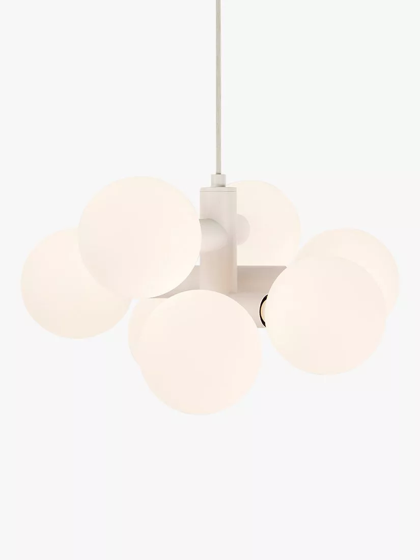 Designed exclusively for Tala by David Weeks, this bold and contemporary ceiling fitting will elevate any interior setting. It has an intersecting steel structure that incorporates seven matt white globe lampshades to cast light around your space. Tala's Sphere IV LED bulbs with dim-to-warm technology are included, which gives this light unrivalled dimming performance from a functional to decorative glow. The result is a cloud-like lighting display that can be set-up to match the mood in your space. Suspended from a height-adjustable cord for perfect positioning.