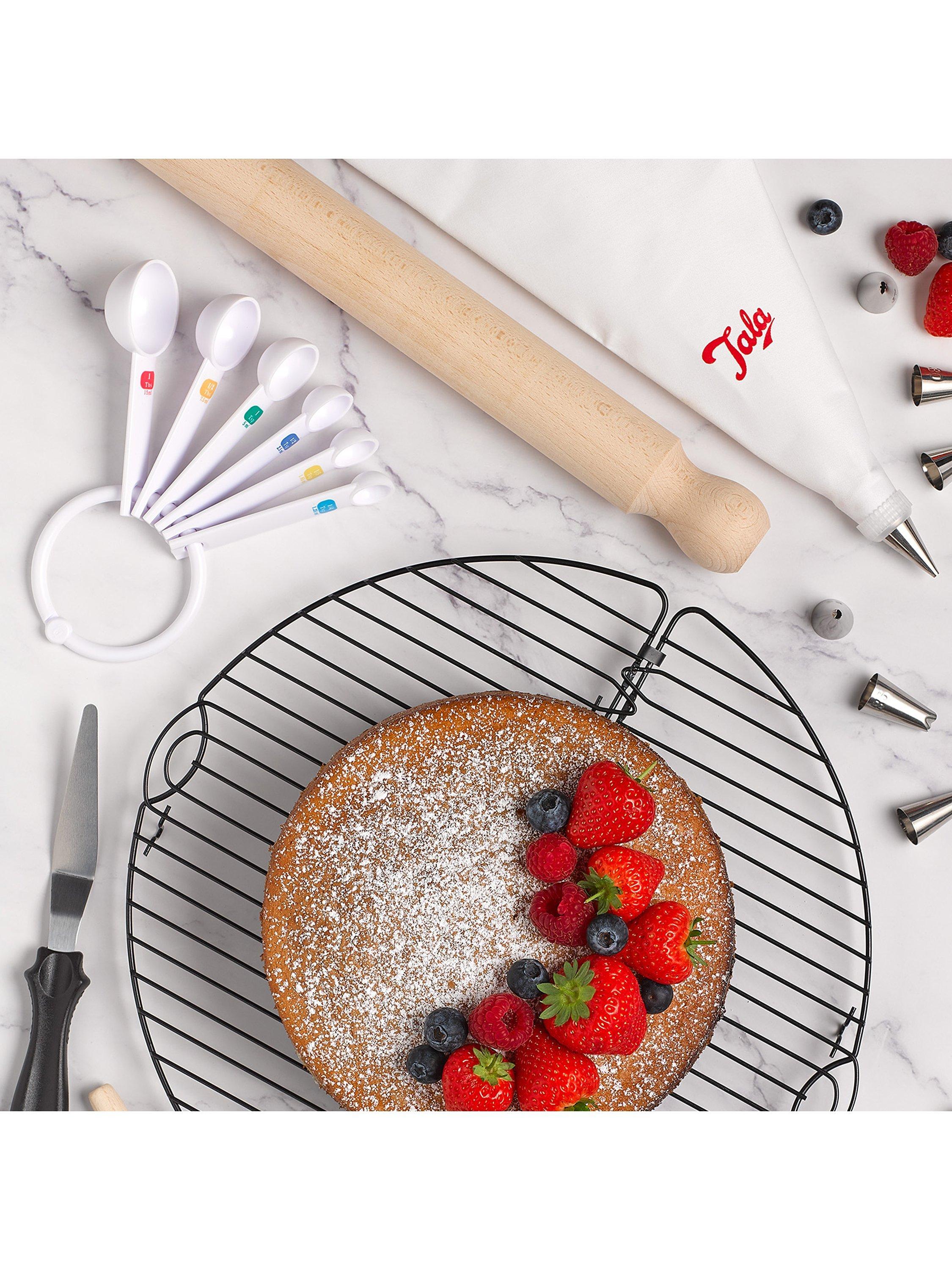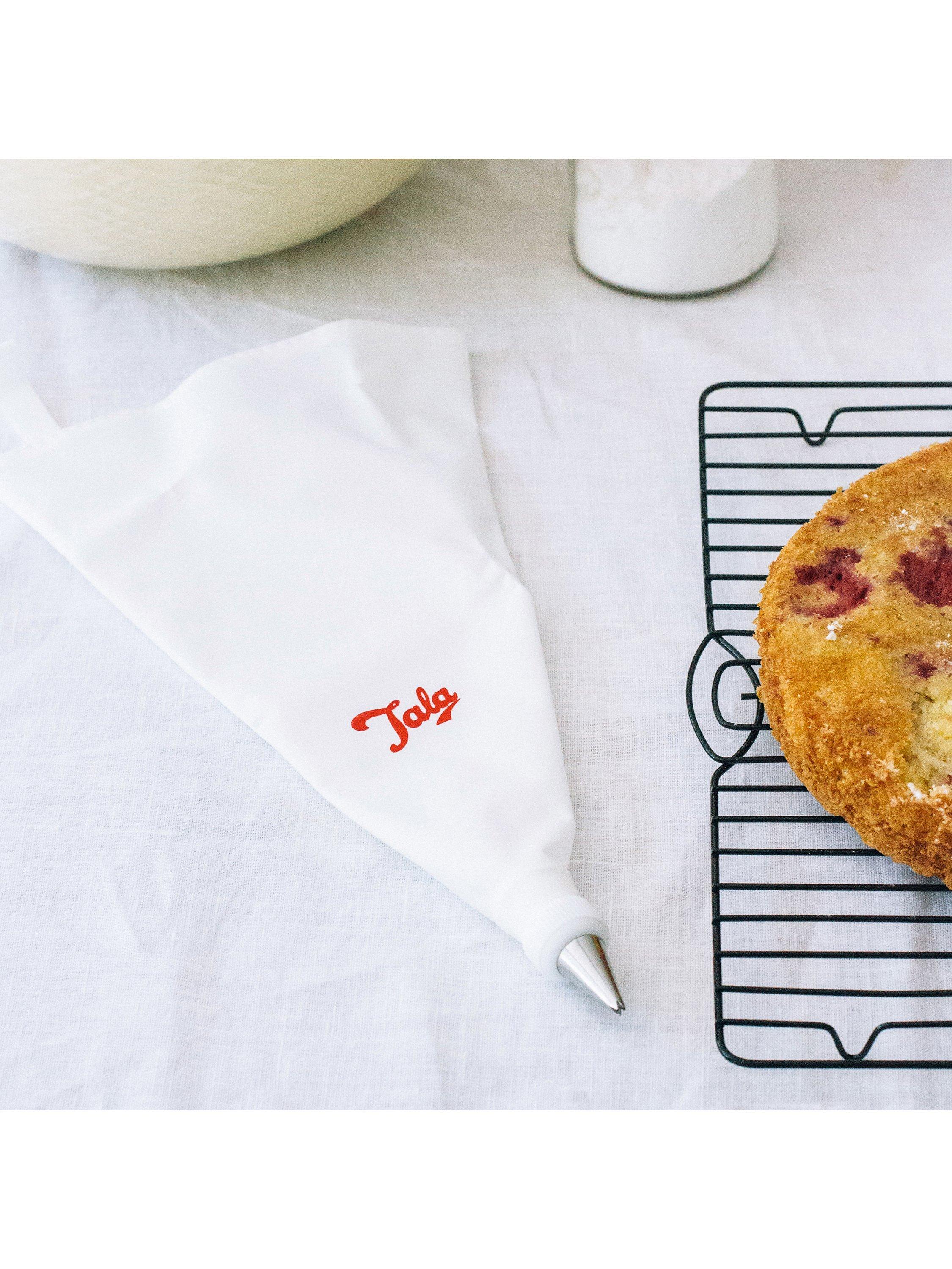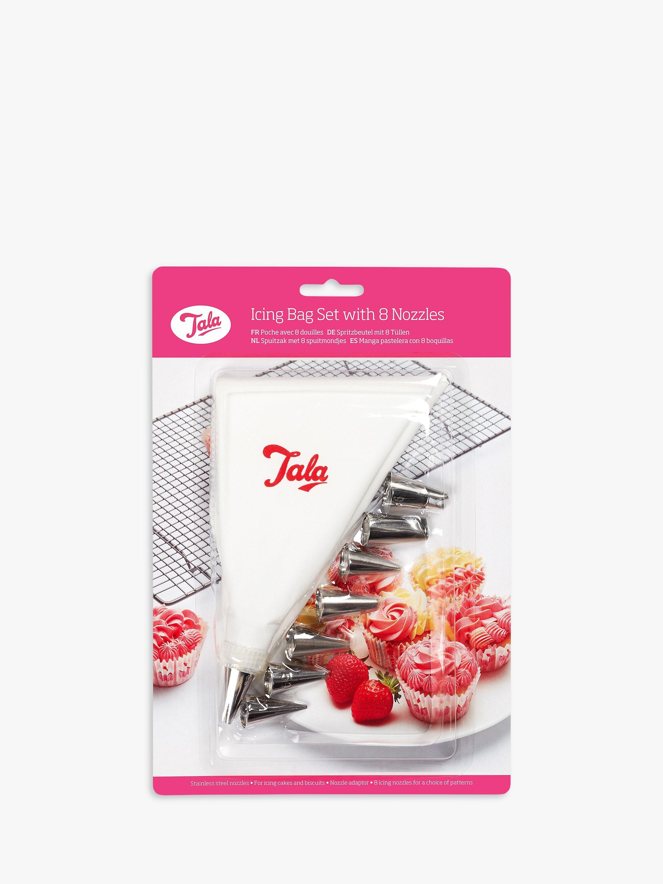 Create different piping patterns and decorative designs with these eight stainless steel nozzles from Tala. Ideal for icing biscuits, cakes, cupcakes and other baking creations. The nozzle adapter makes changing nozzles quicker and easier. This cake decorating set includes a 30cm reusable icing bag.