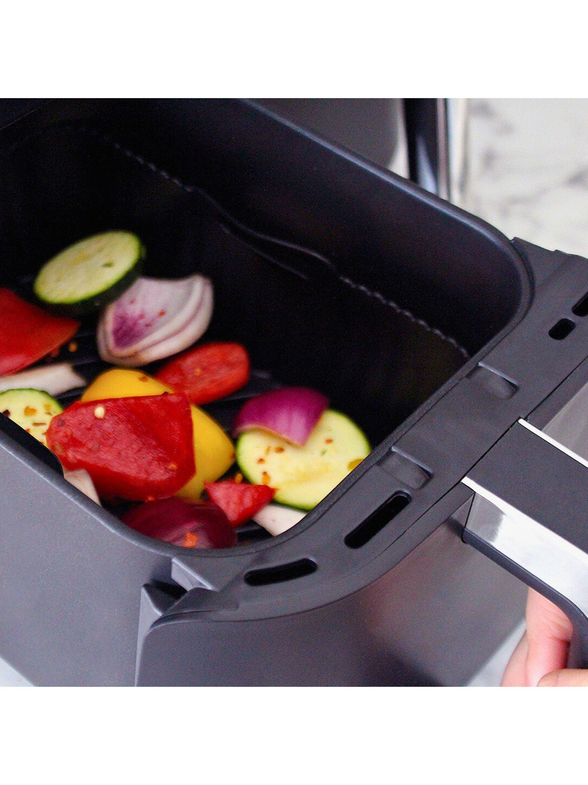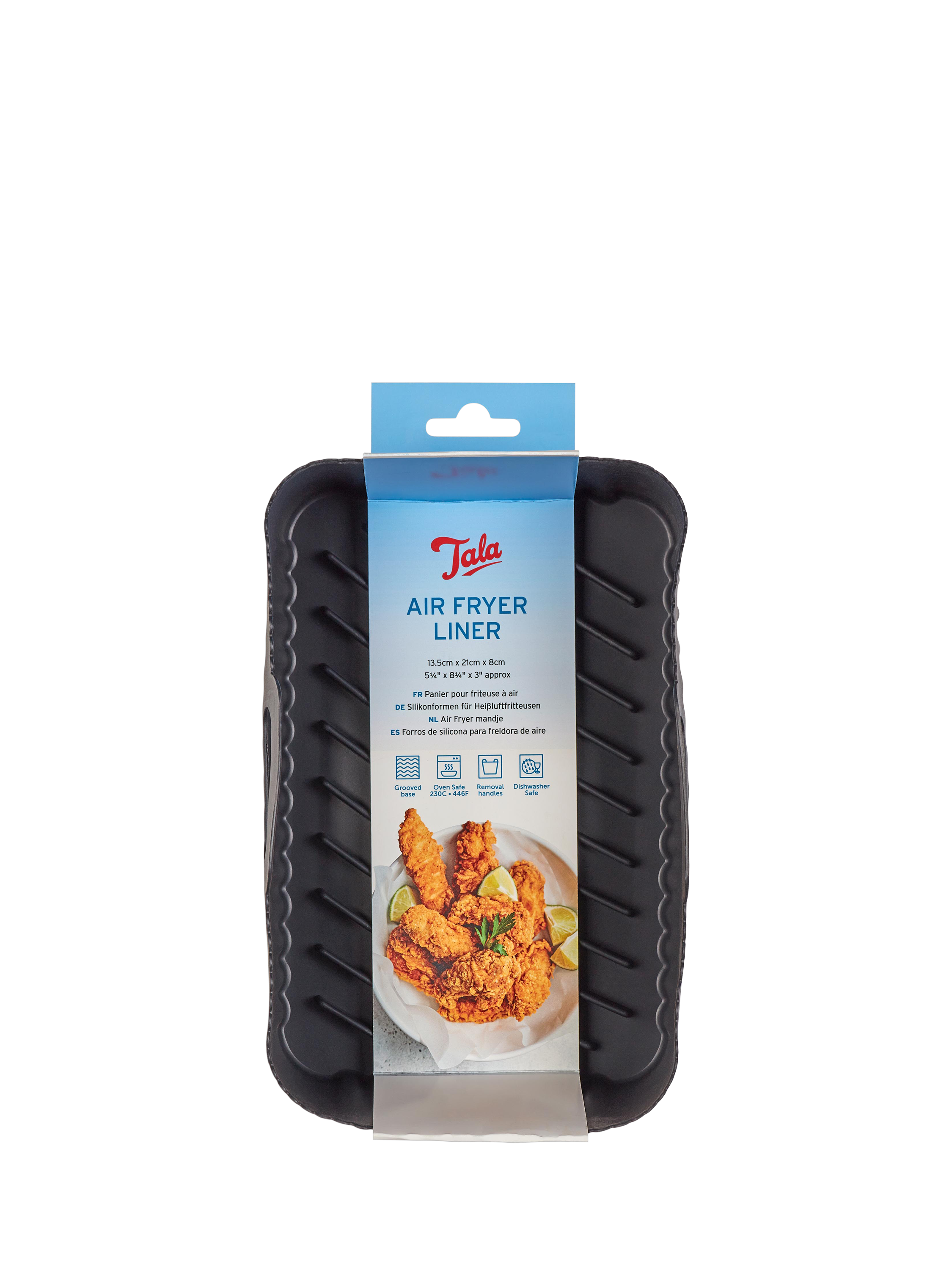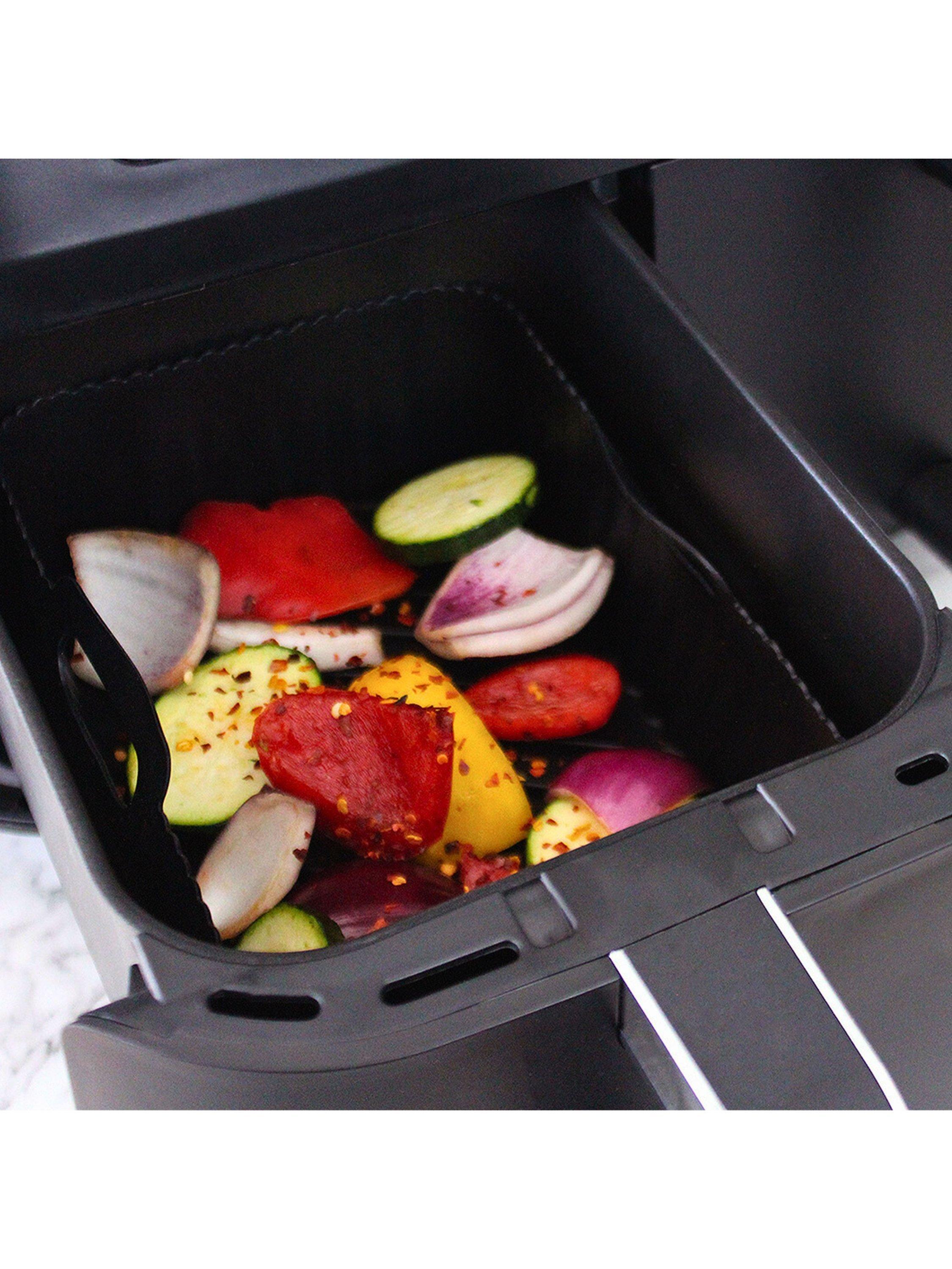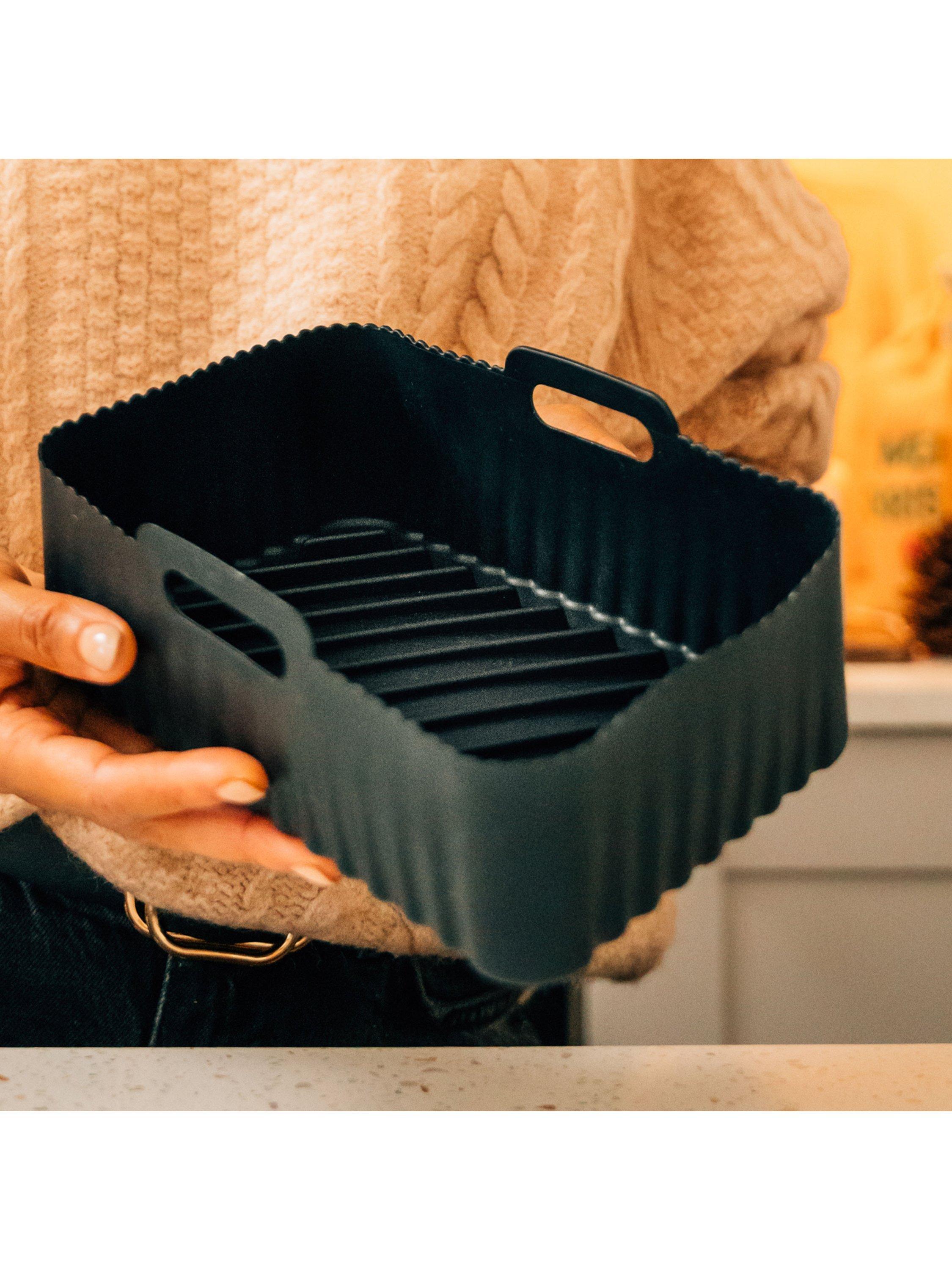 Reusable and flexible silicone liner for your air fryer. A grooved base boosts airflow and prevents food from cooking in excess oil, promoting healthier eating. Great for achieving crisper foods. The liner basket sits within your air fryer tray. Includes handles for easy removal. Dishwasher-safe for easy cleaning.