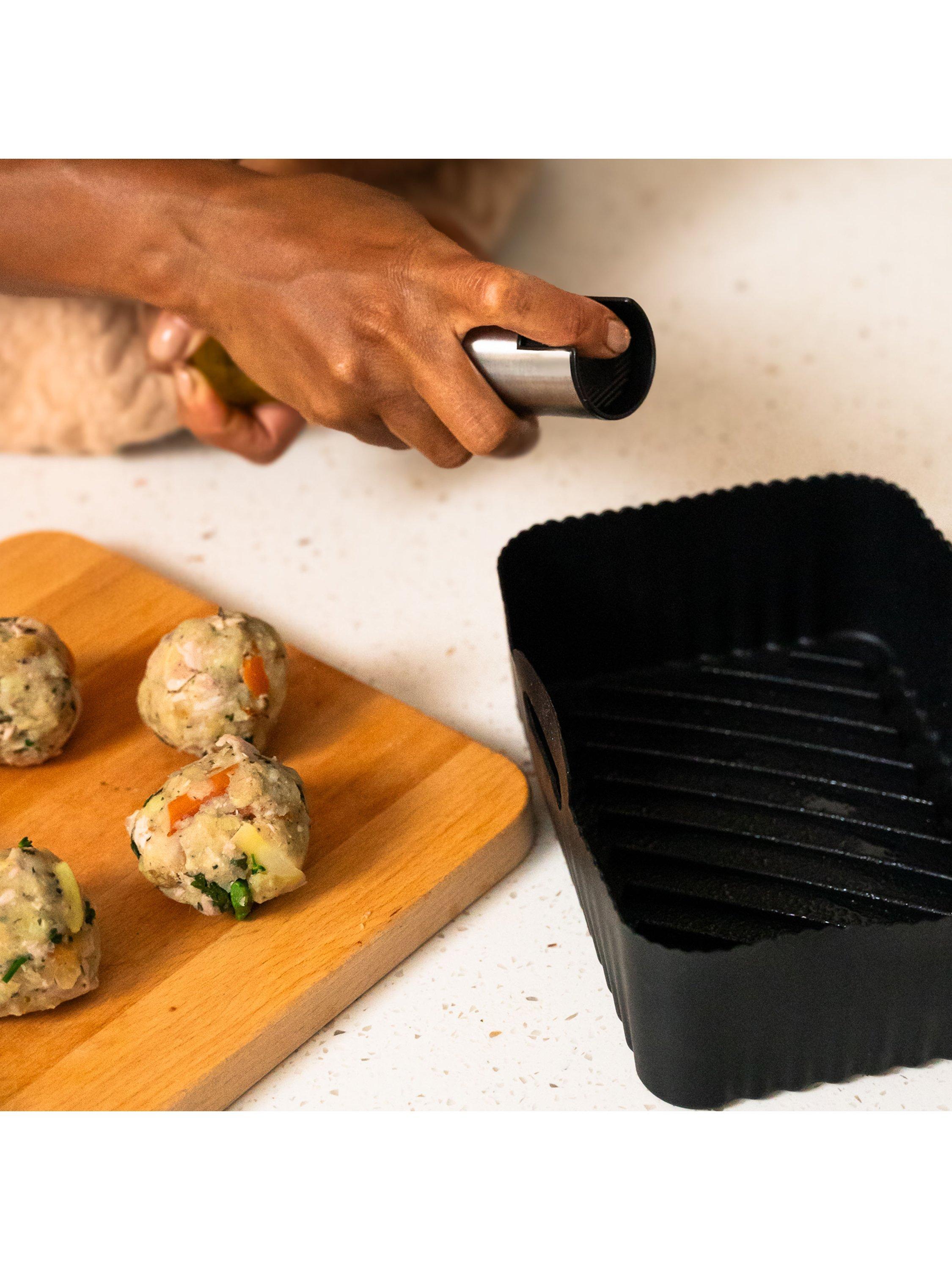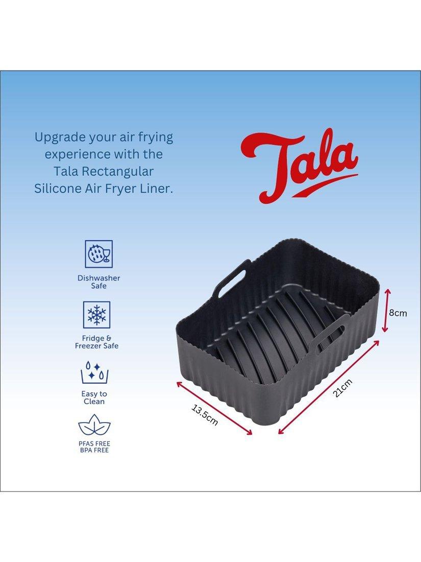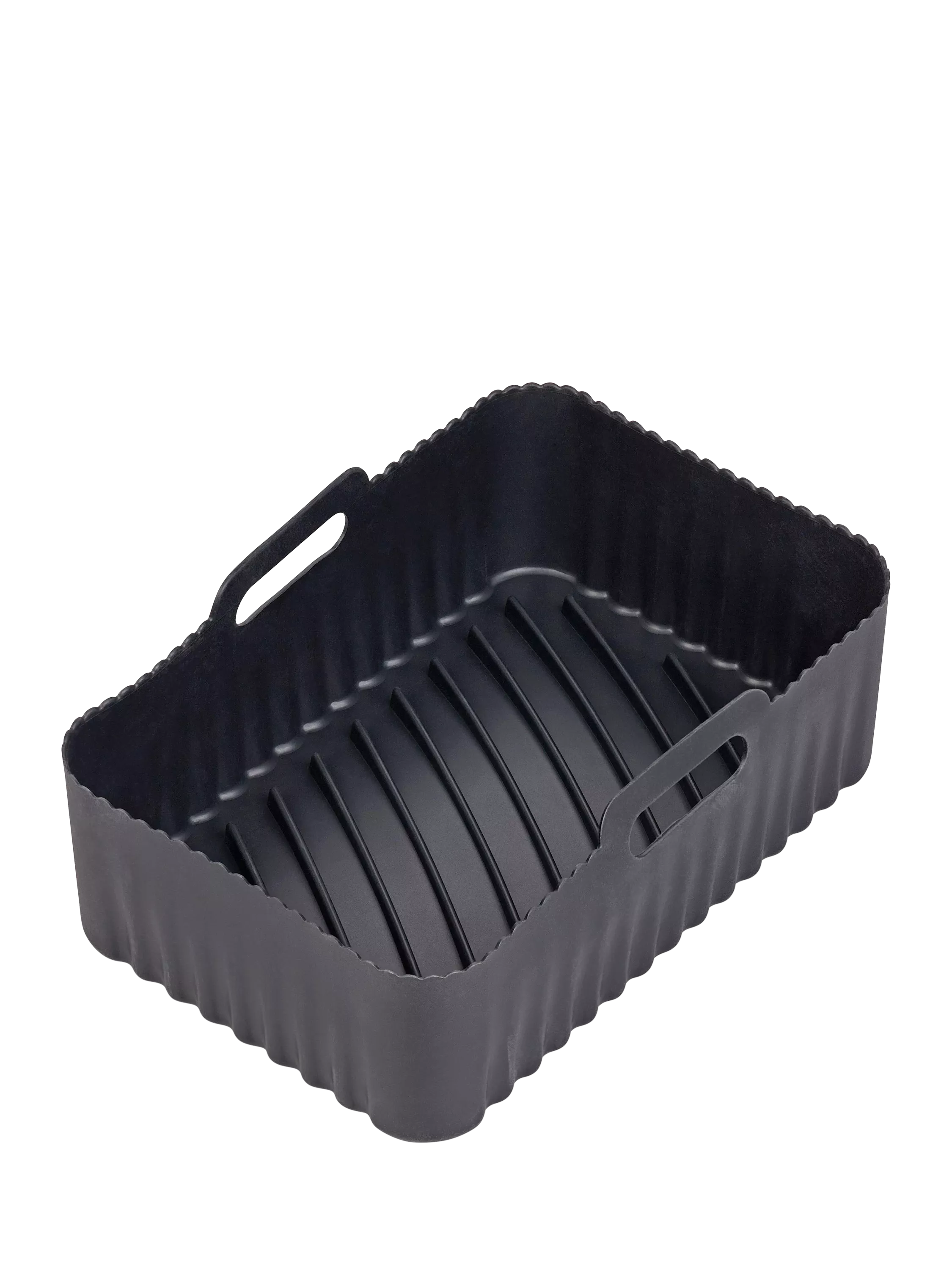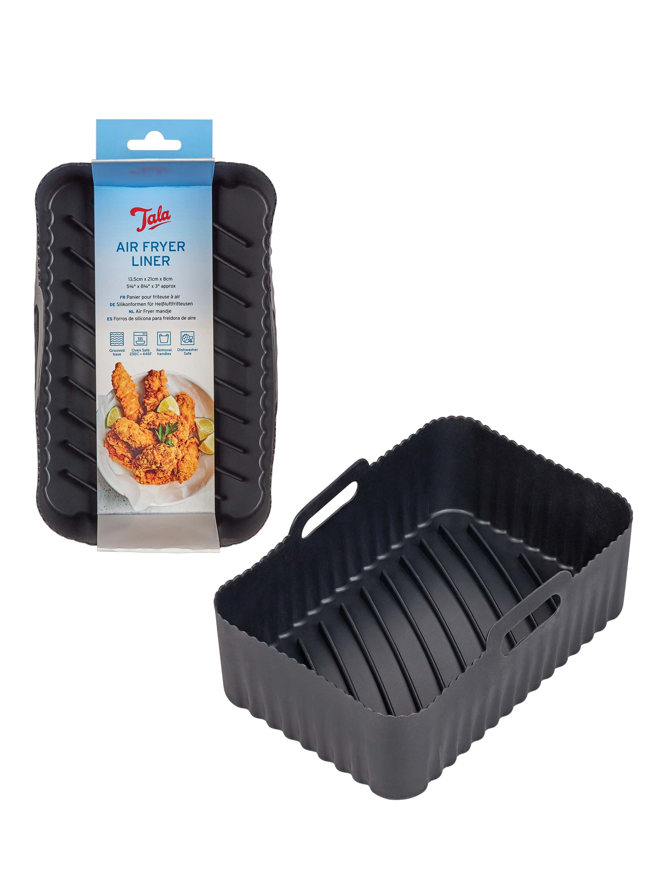 Reusable and flexible silicone liner for your air fryer. A grooved base boosts airflow and prevents food from cooking in excess oil, promoting healthier eating. Great for achieving crisper foods. The liner basket sits within your air fryer tray. Includes handles for easy removal. Dishwasher-safe for easy cleaning.