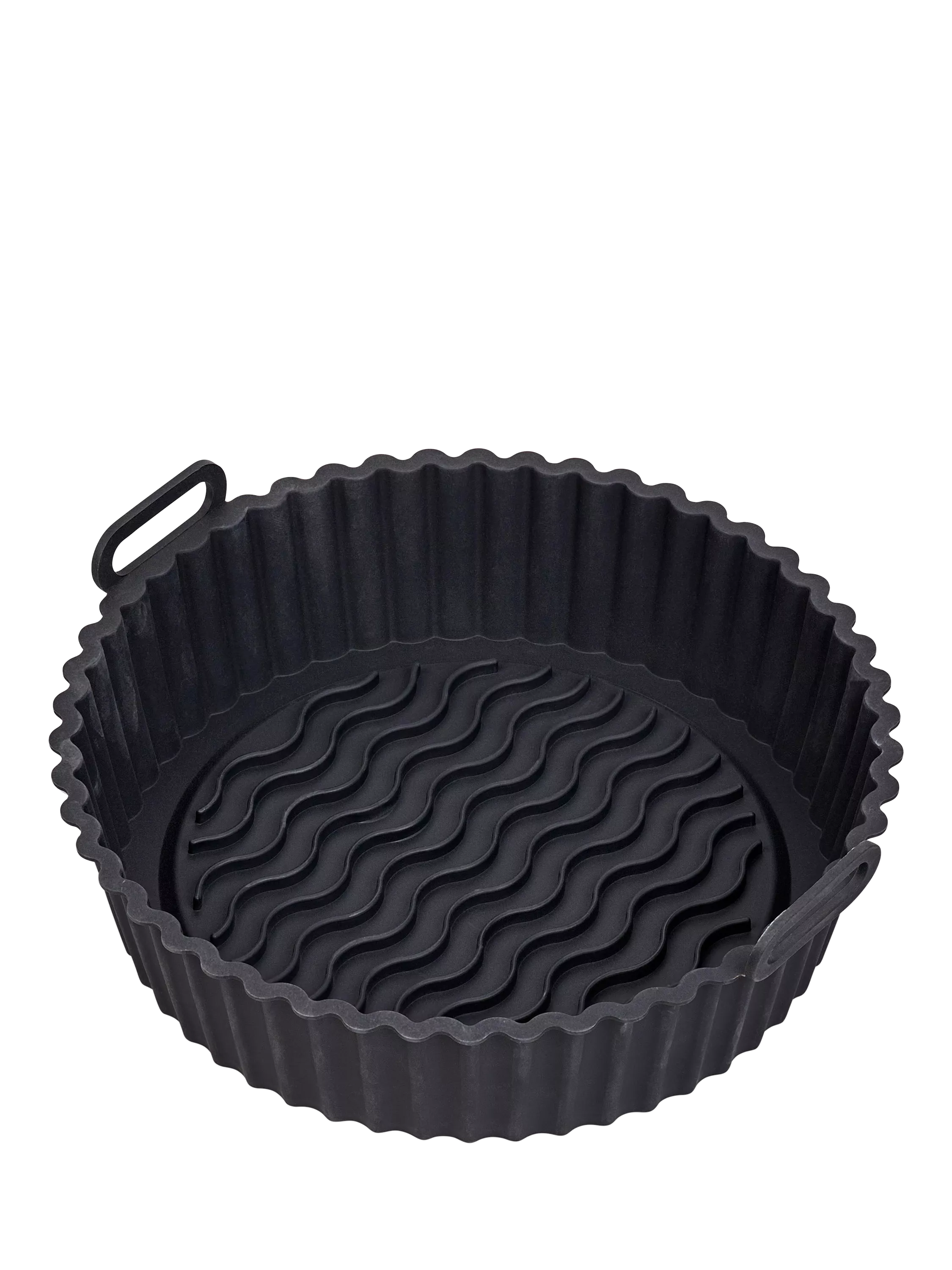 Reusable and flexible silicone liner for your air fryer. A grooved base boosts airflow and prevents food from cooking in excess oil, promoting healthier eating. Great for achieving crisper foods. The liner basket sits within your air fryer tray. Includes handles for easy removal. Dishwasher-safe for easy cleaning.