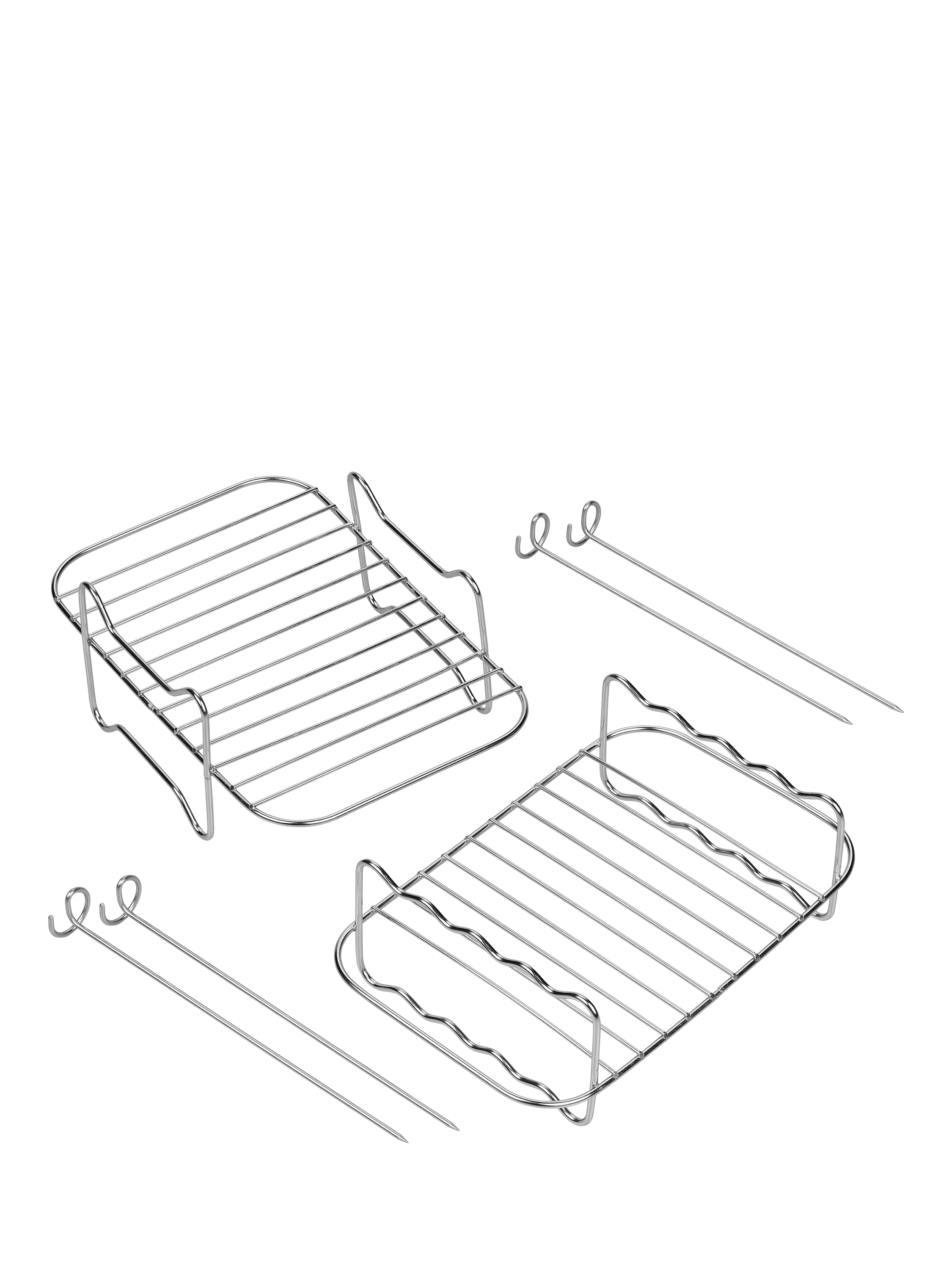 Two-tier rack for use with air fryers to increase tray capacity. Includes four skewers for making kebabs. Made of stainless steel and dishwasher-safe for easy cleaning.