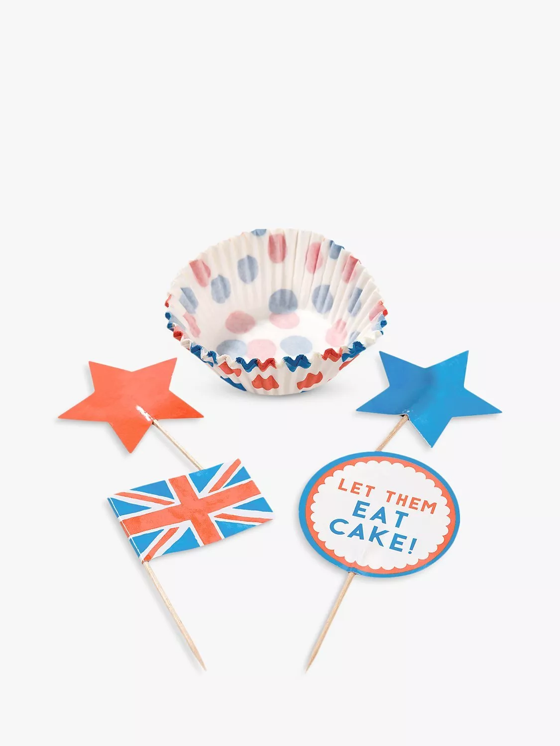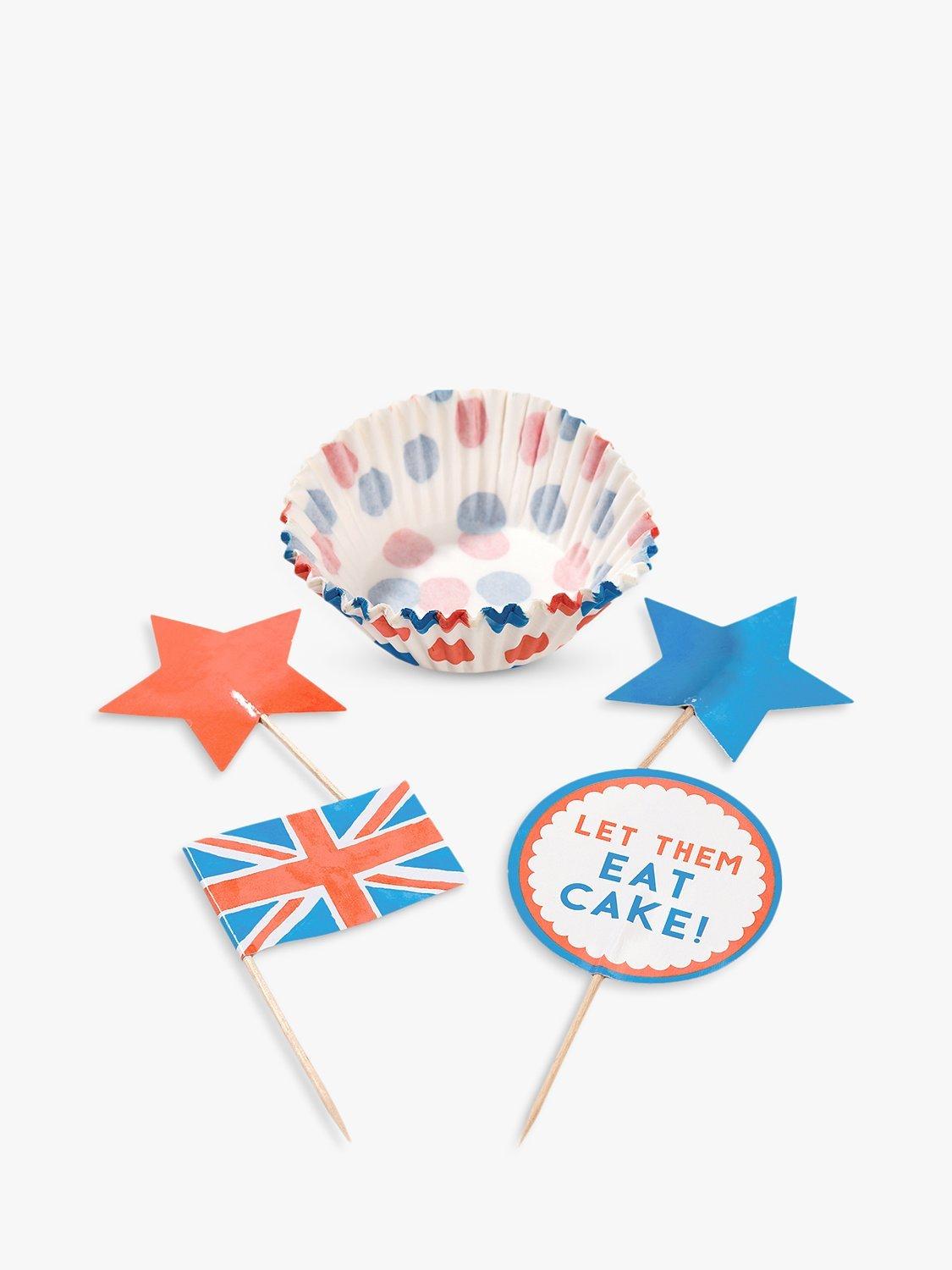 This set includes 30 cupcake cases, 30 cake toppers (10 x Union FLag, 5 x red star, 5 x blue star & 5 x Let them eat cake)