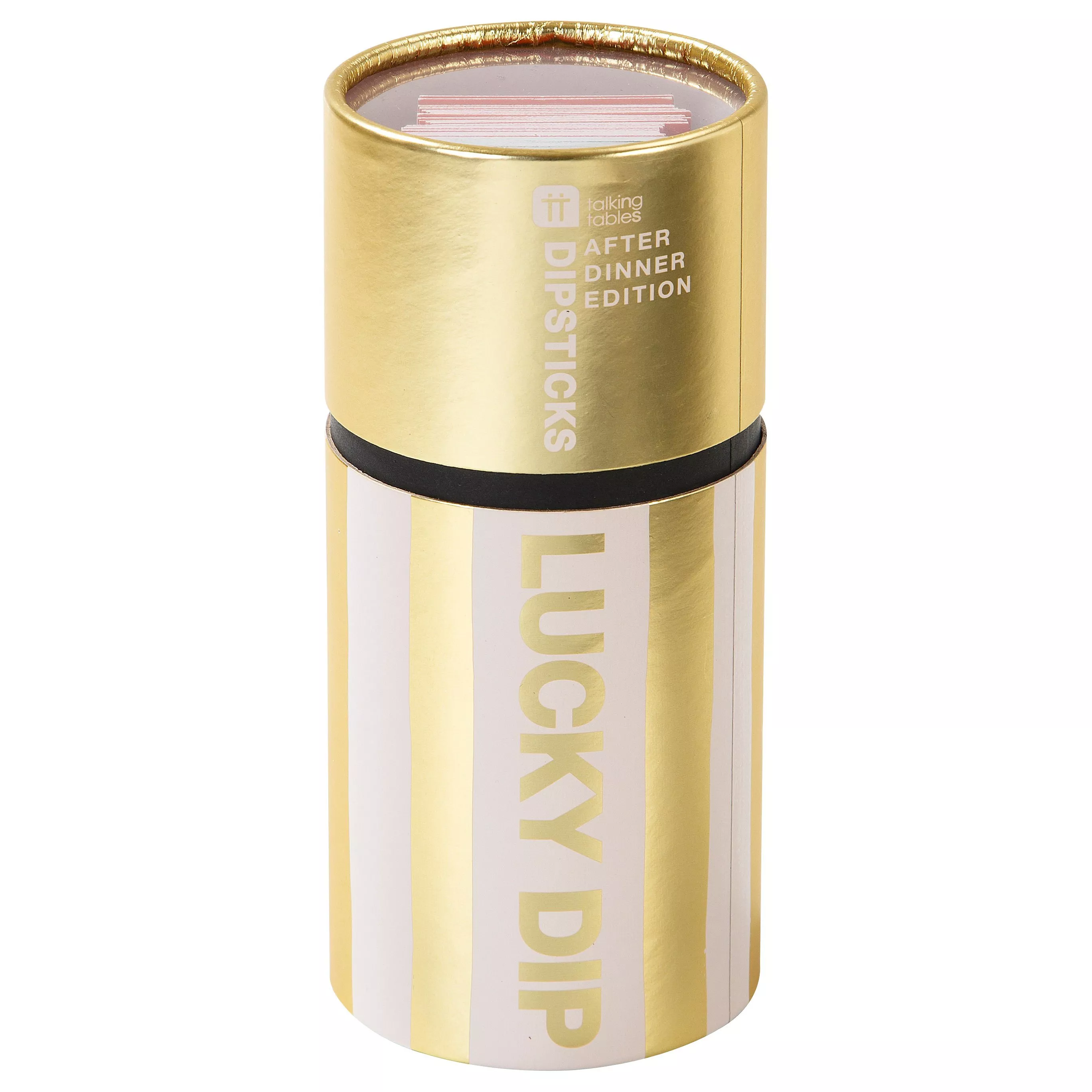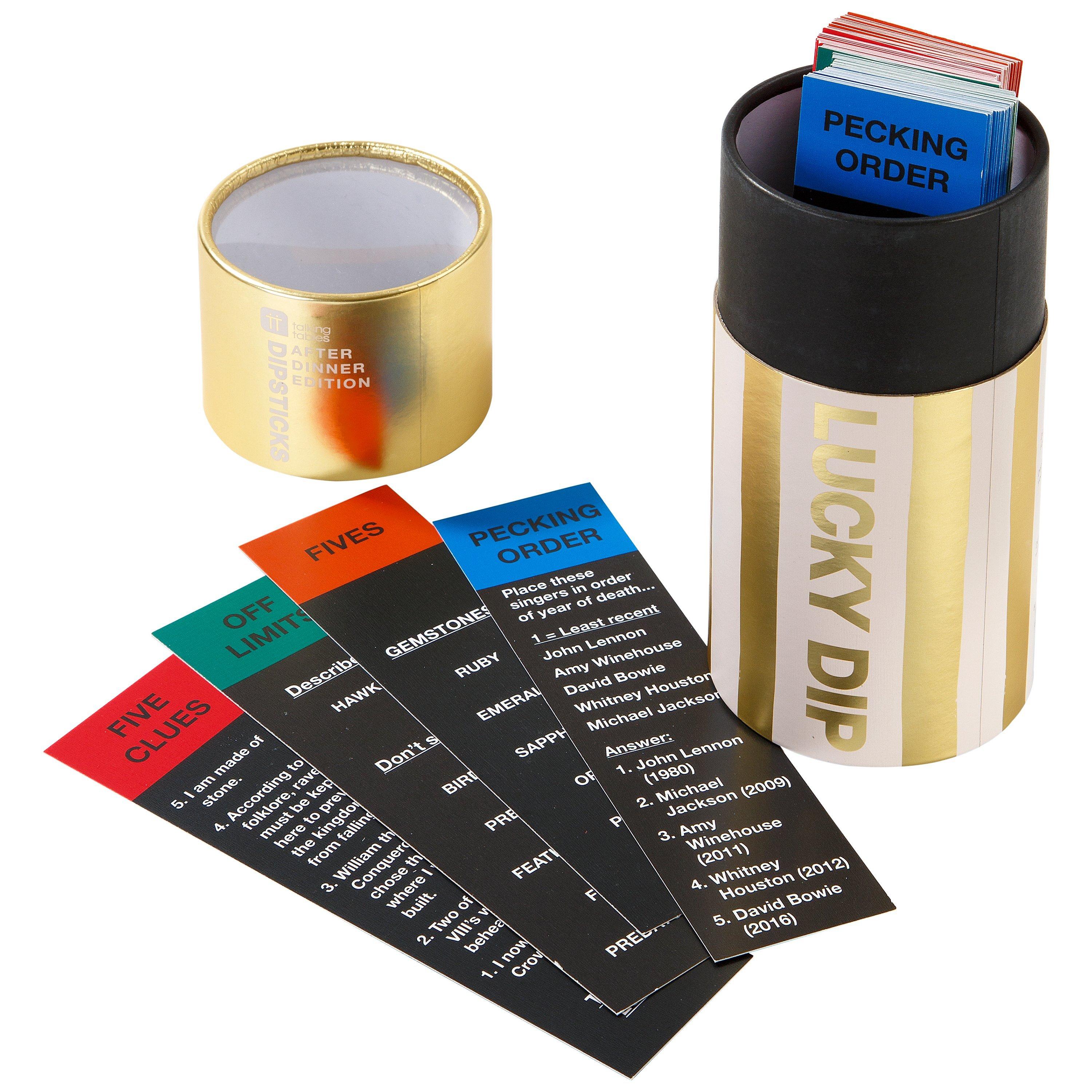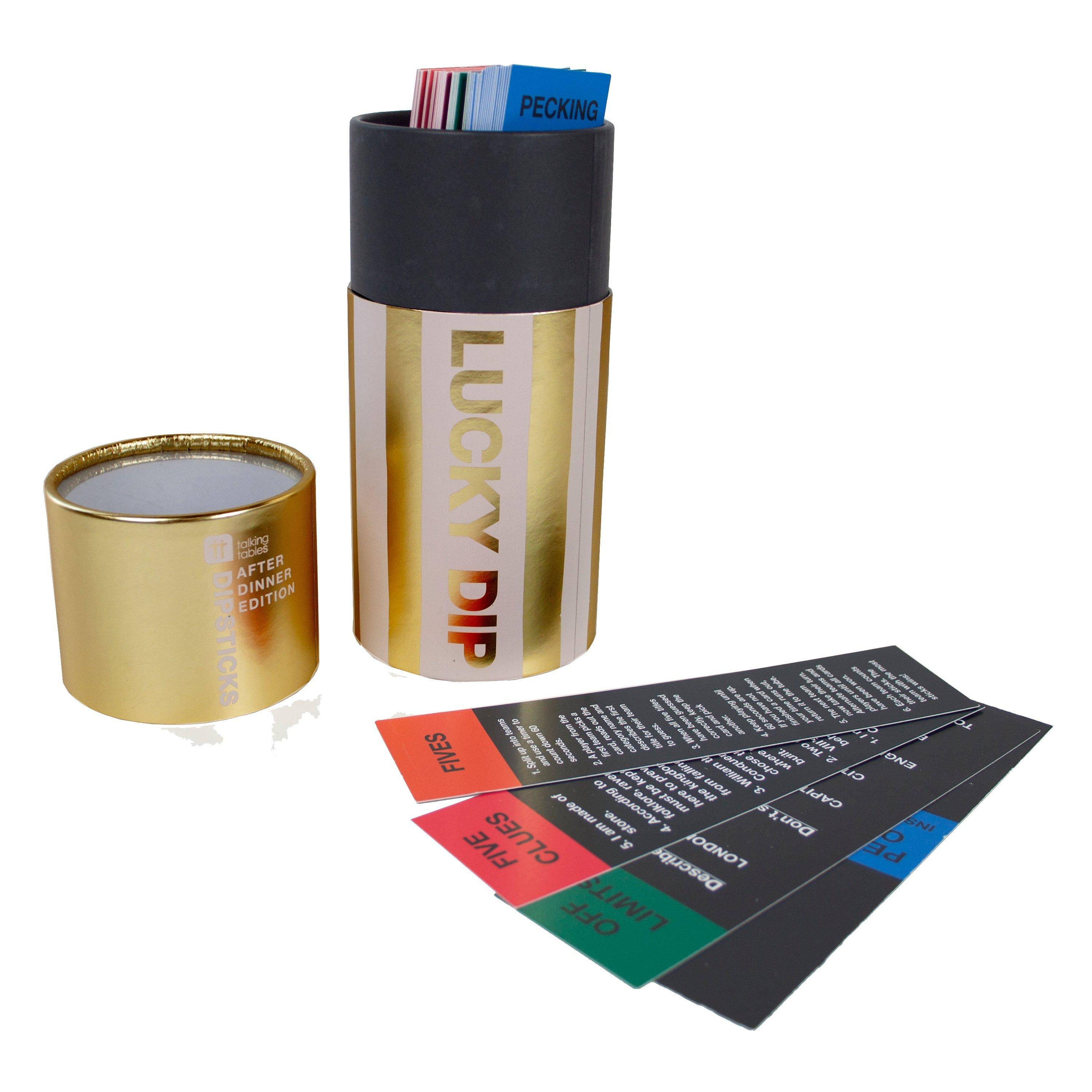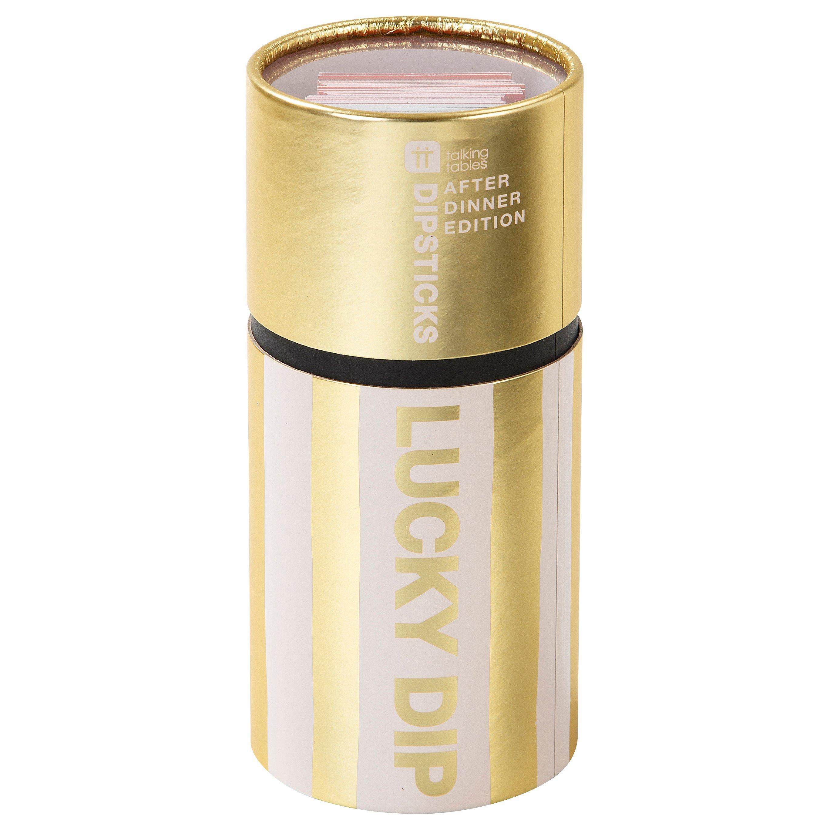 It's bigger, it's better, it's back and this time it's gold! It's the after dinner edition of Lucky Dip by Talking Tables, recommended for ages 7+. An ideal fun and simple game to get friends and family together around the table.