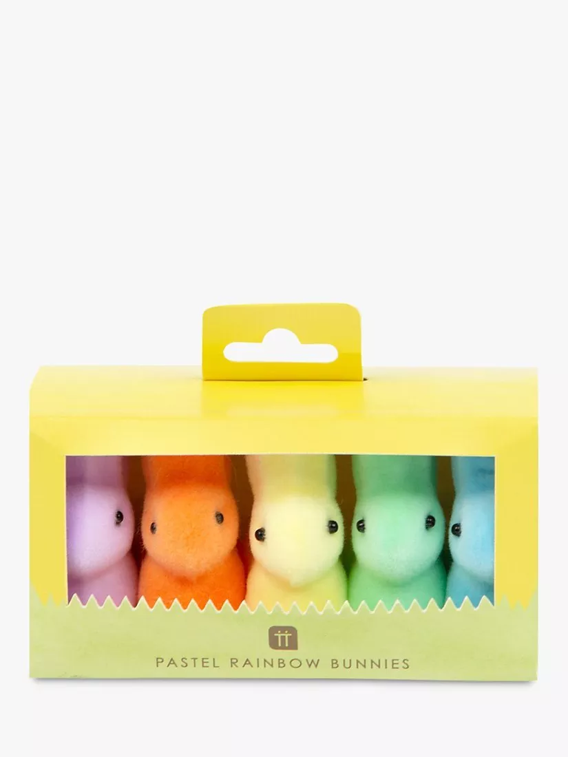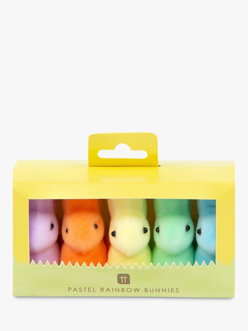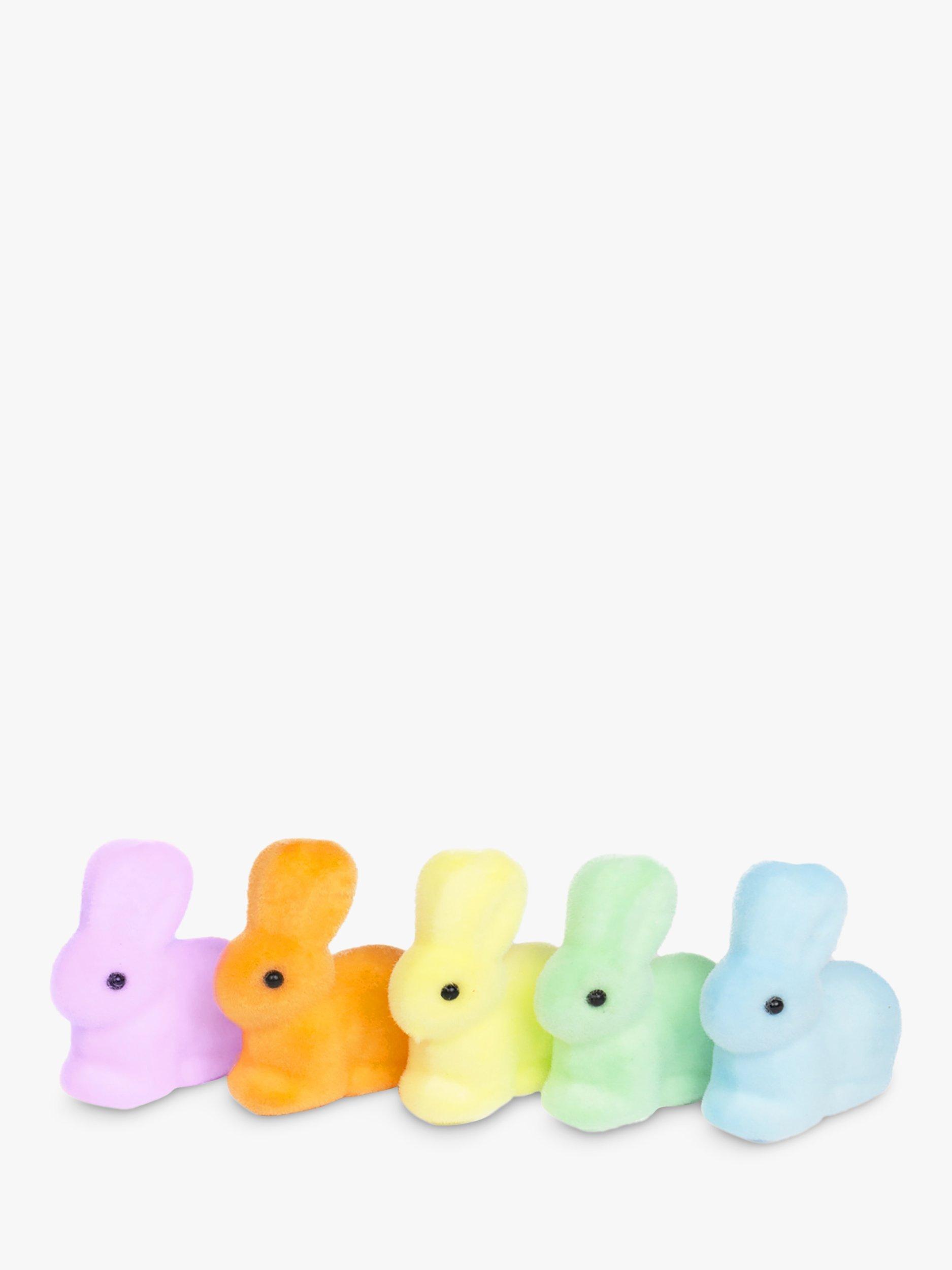 5 rainbow-coloured bunnies, covered in fuzzy flock for you to add to your Easter tablescape.