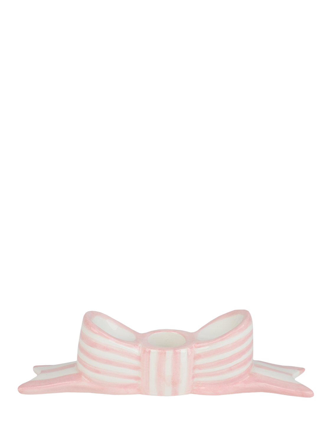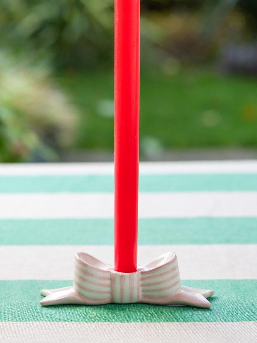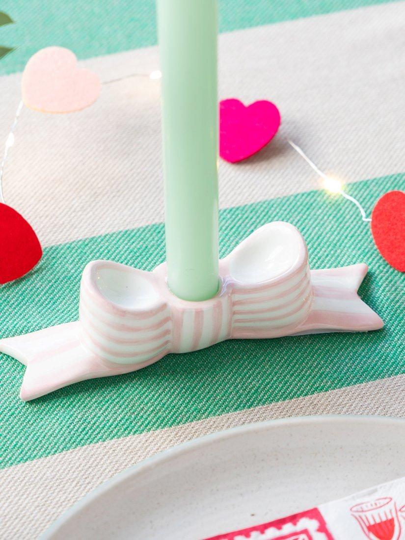 Inspired by classic ribbon detailing and celebratory decor, this candle holder brings charm and a soft touch of colour to any table setting. Crafted from high-quality glazed ceramic, it features hand-painted stripes with a glossy finish that catches the light beautifully. Each holder is moulded and hand-finished to capture the folds and curves of a bow, combining craftsmanship with a sculptural, modern design. Durable and easy to clean, it’s designed to be reused for countless occasions.