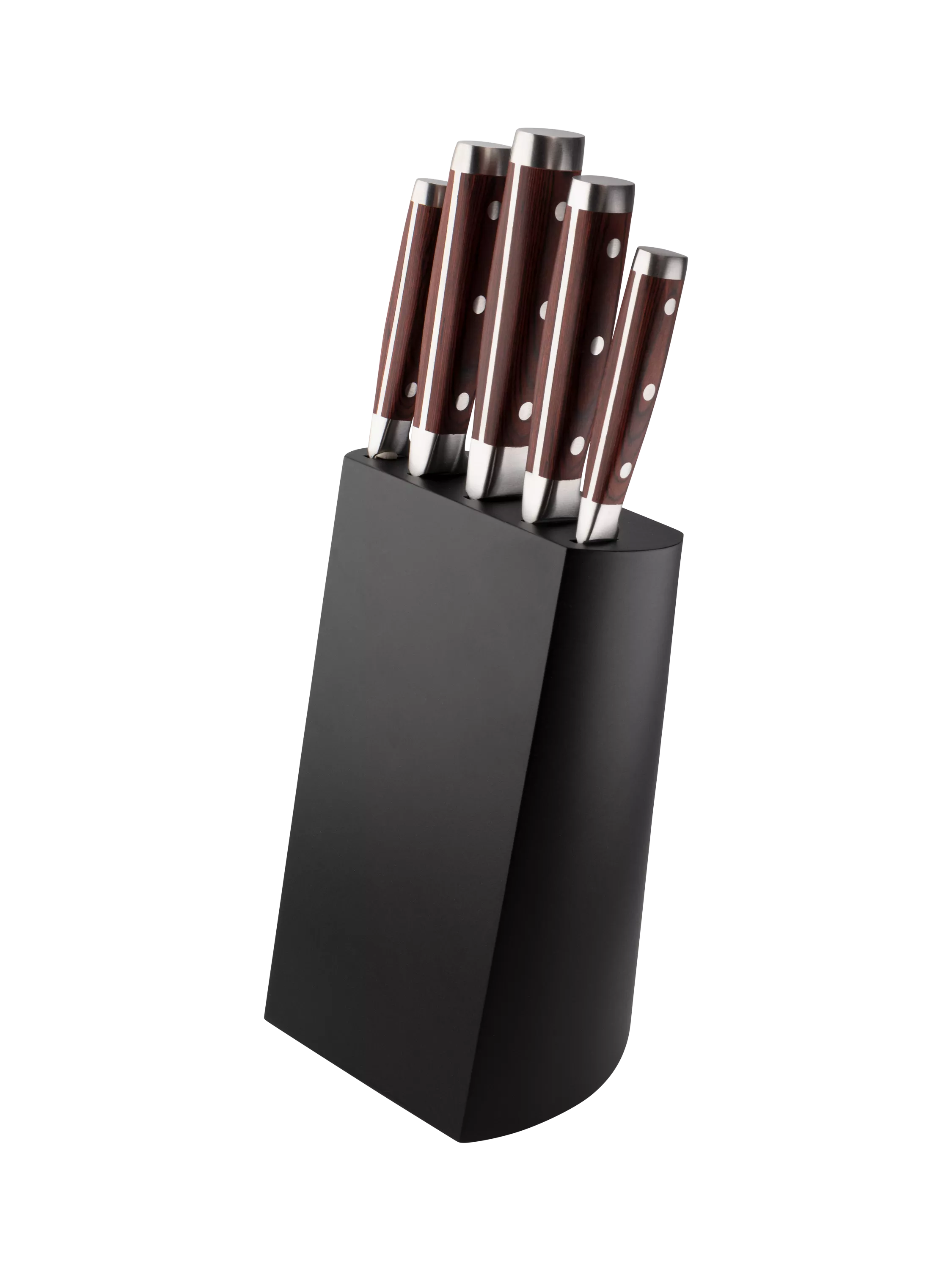 All your food prep needs taken care of in one block. Kept together in a stylish rubber wood, painted knife block, this set includes five kitchen knives with Pakkawood handles secured by three stainless steel rivets and stainless steel bolsters and end stops.