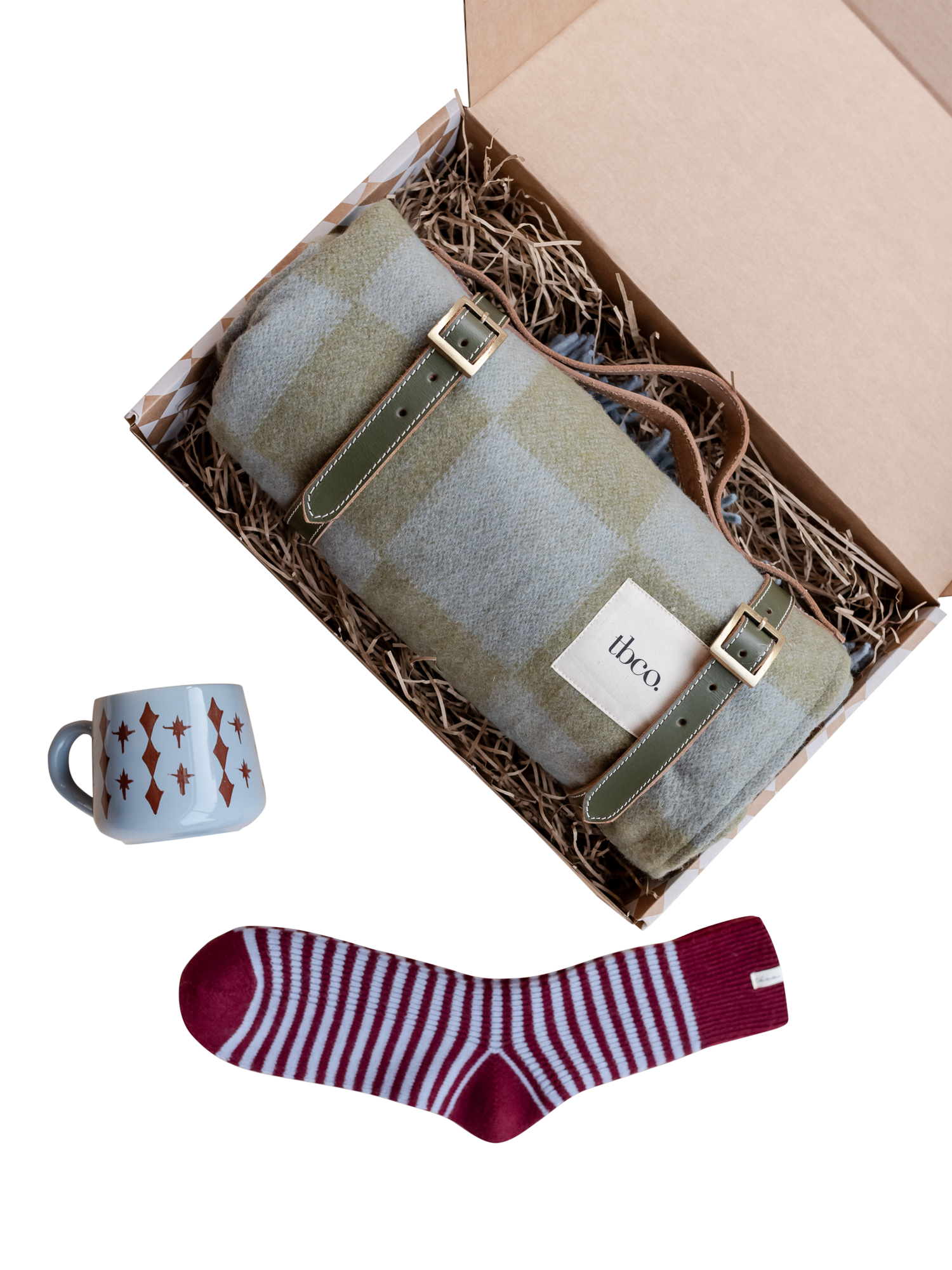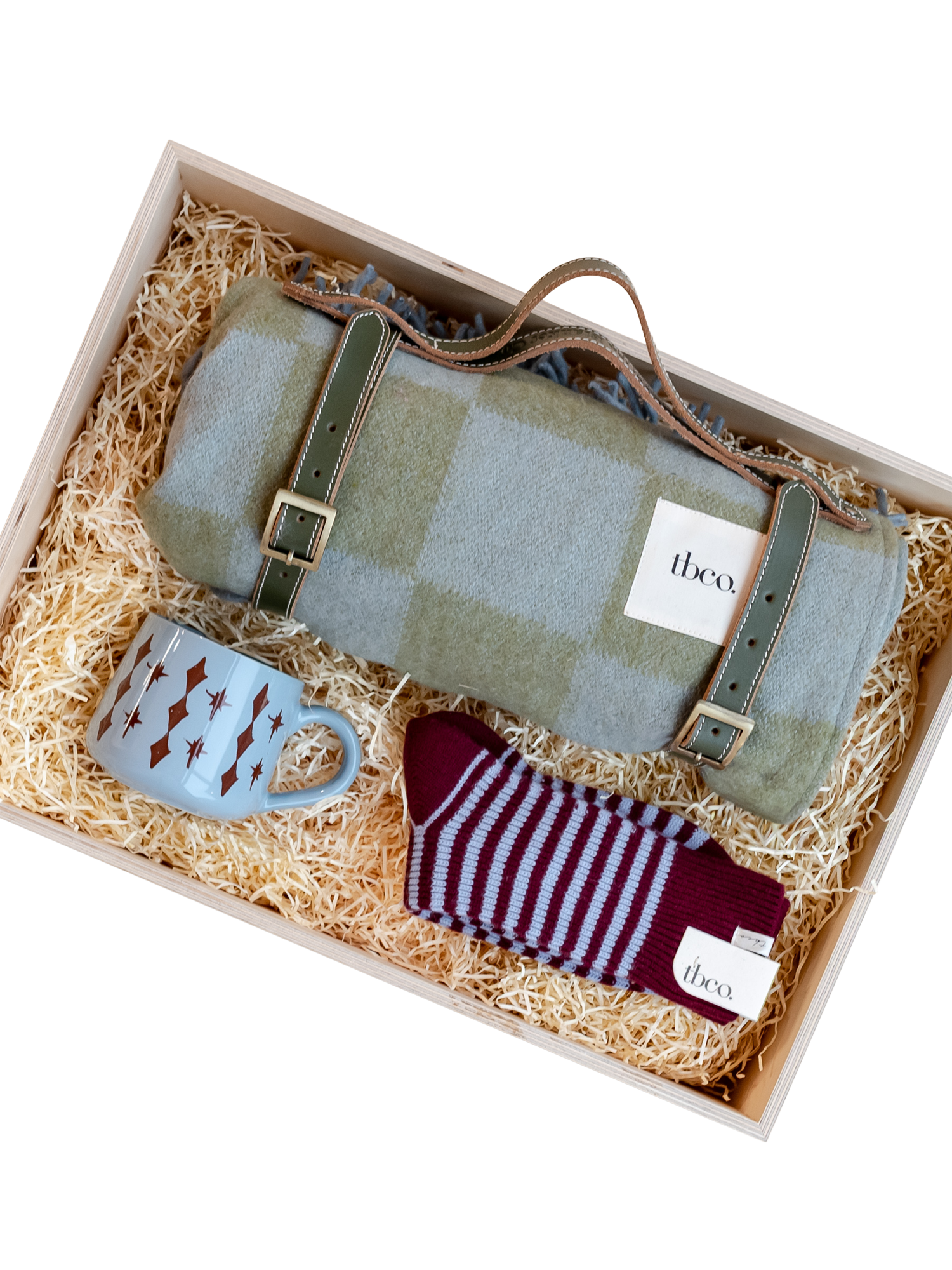 Surprise & delight with a TBCo ready-made gift box. Curated for the perfect cosy day, this gift box contains a wool picnic blanket with water-resistant backing, striped merino wool socks and a hand-painted mug. Thoughtful gifting made easy.