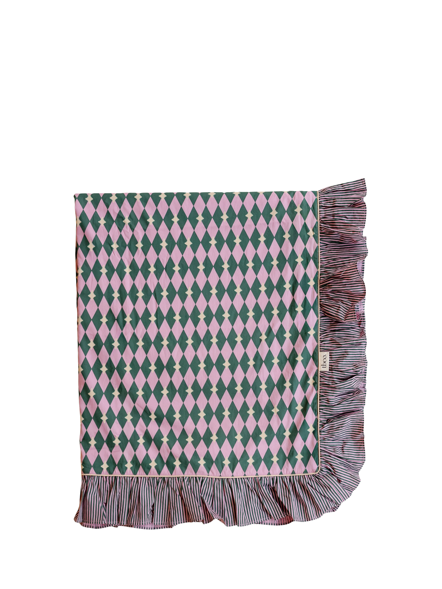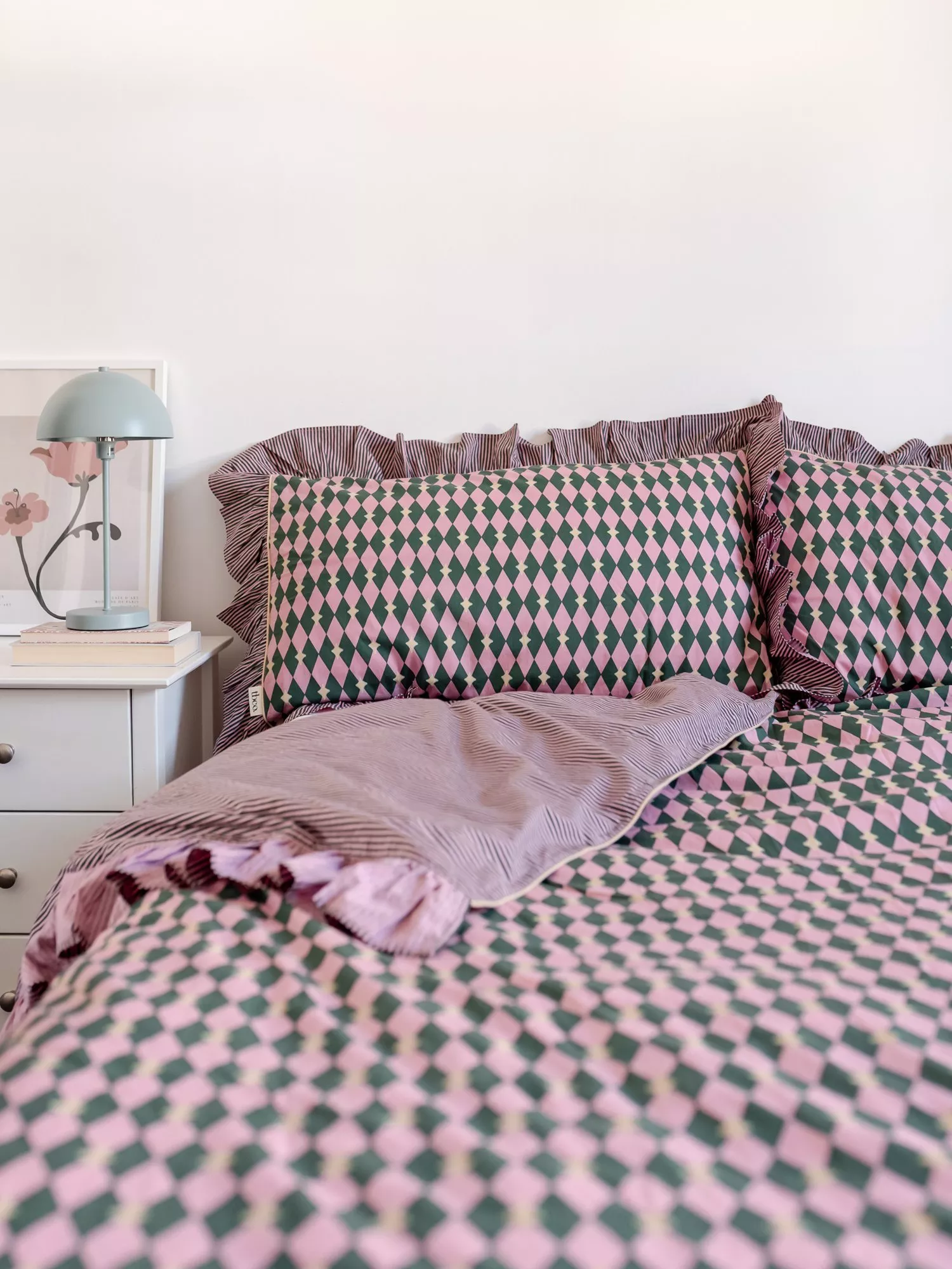 Woven in crisp 100% cotton poplin and finished with a delicate ruffled edge, this bed linen is soft and breathable for a comfortable night's sleep. The reversible design with harlequin pattern on the front and contrasting stripes on the back offers endless styling possibilities.