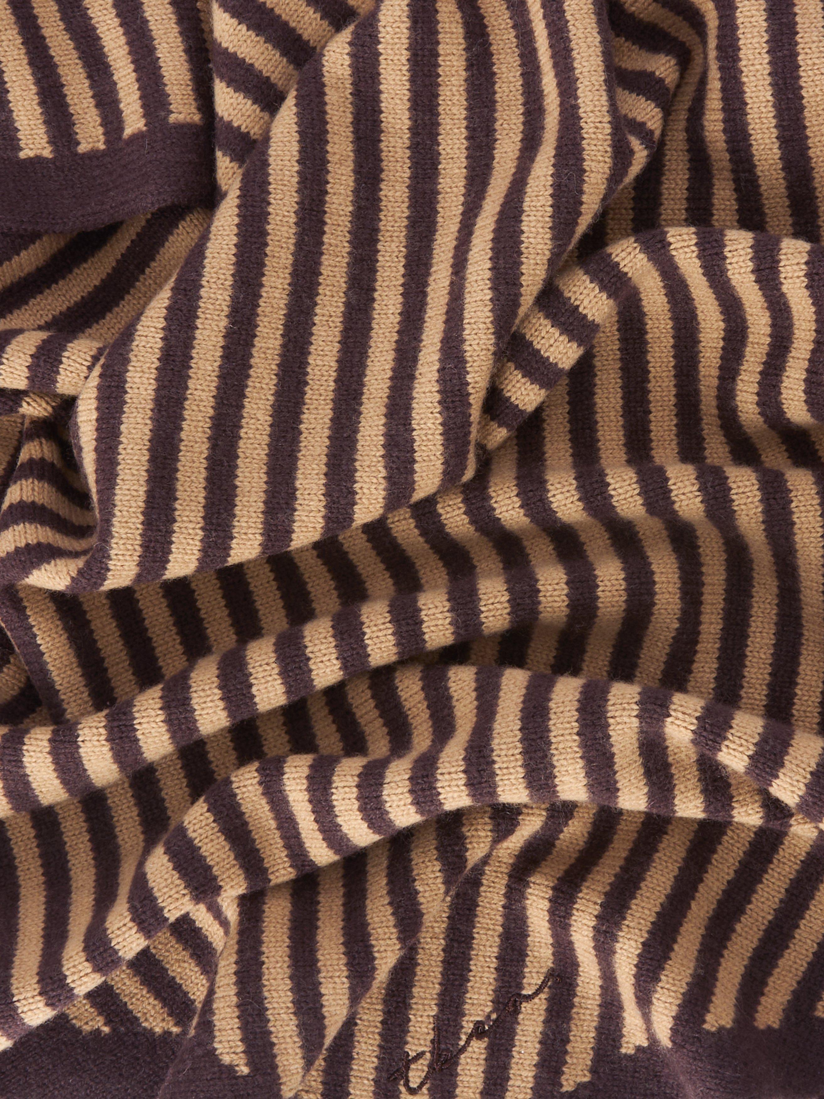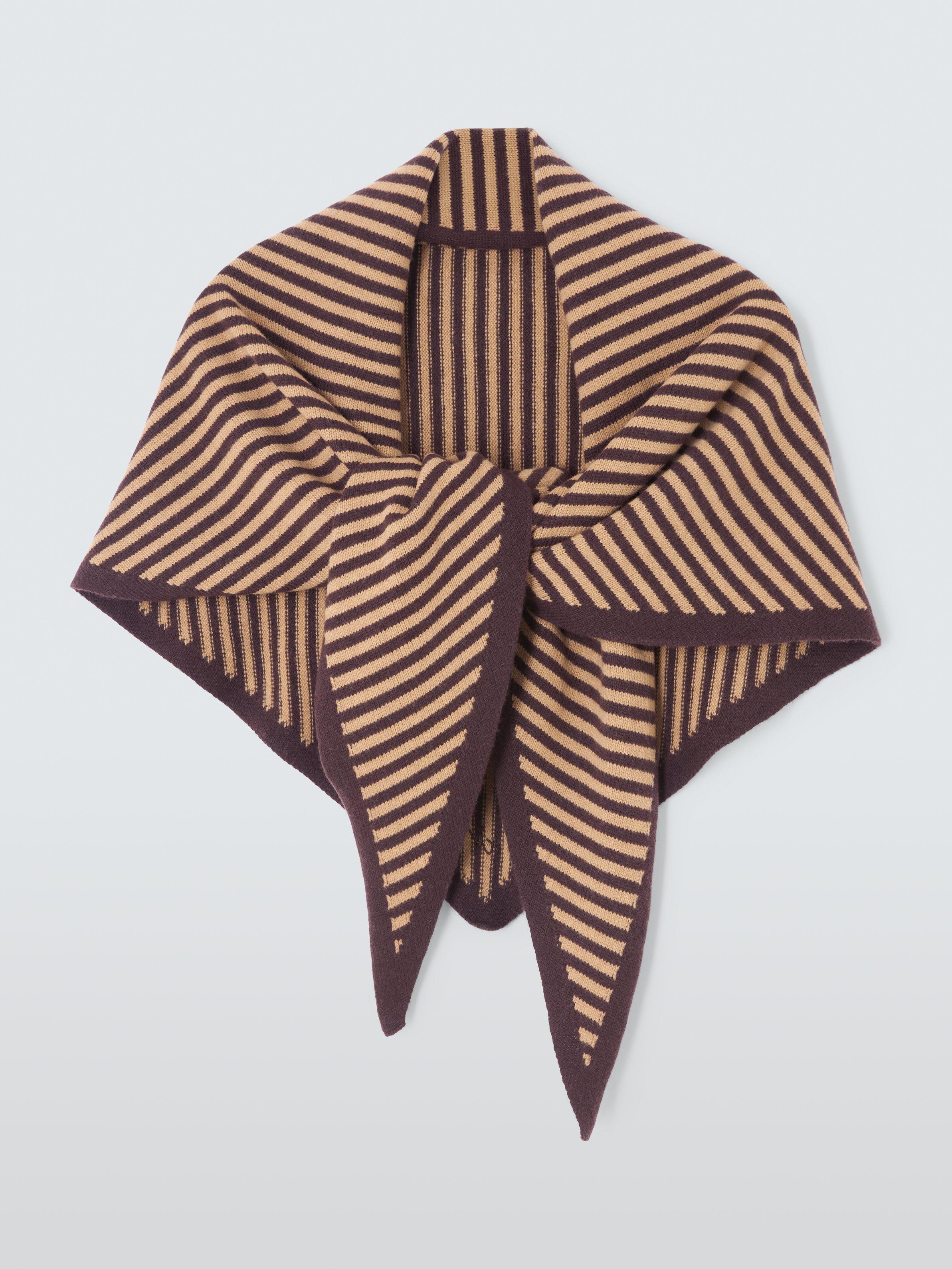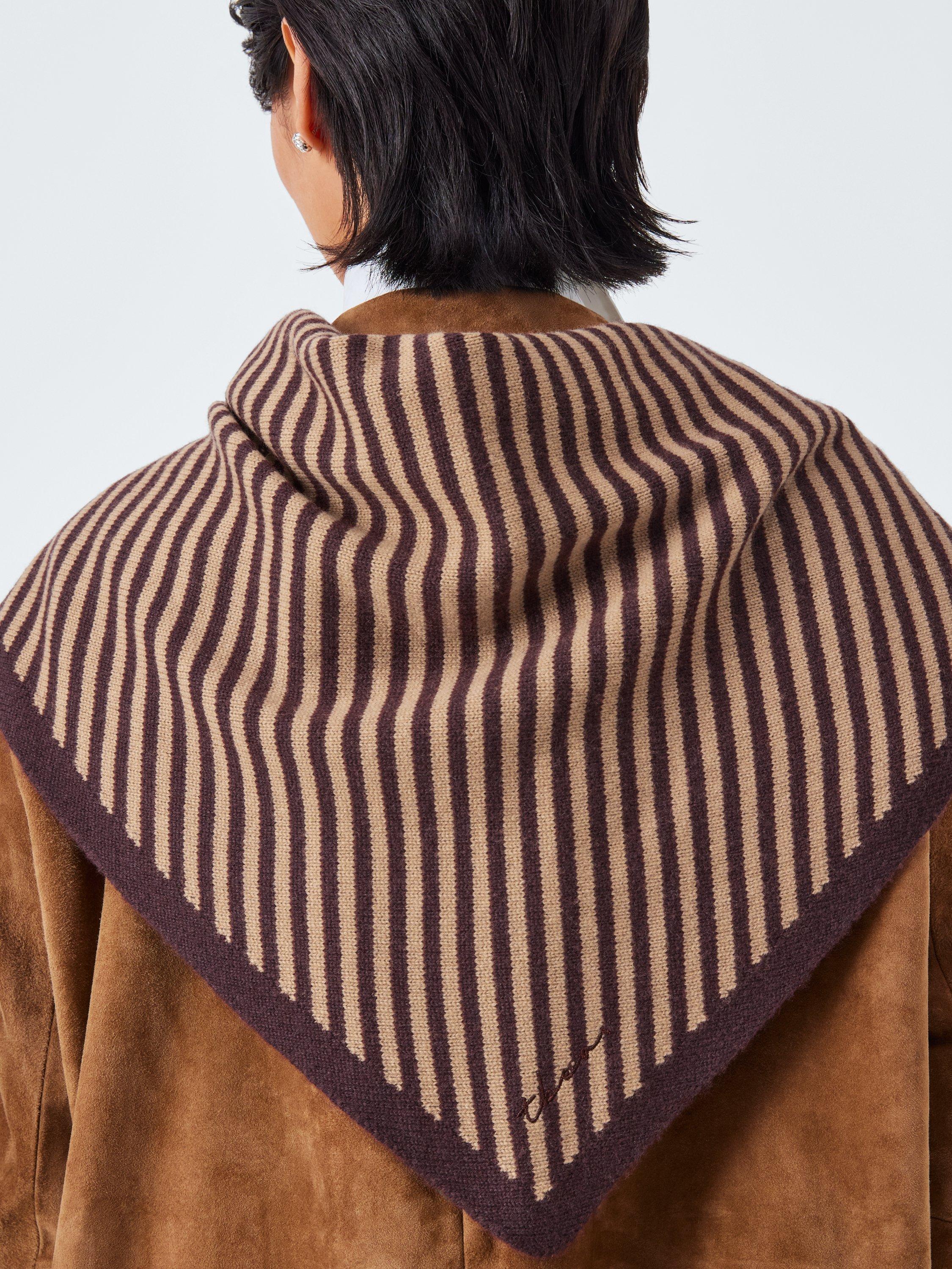 A two-toned, large triangle scarf featuring a classic brown and camel stripe and embroidered TBCo logo. It's knitted from soft and warm merino wool and can be tied in multiple ways for endless styling options.