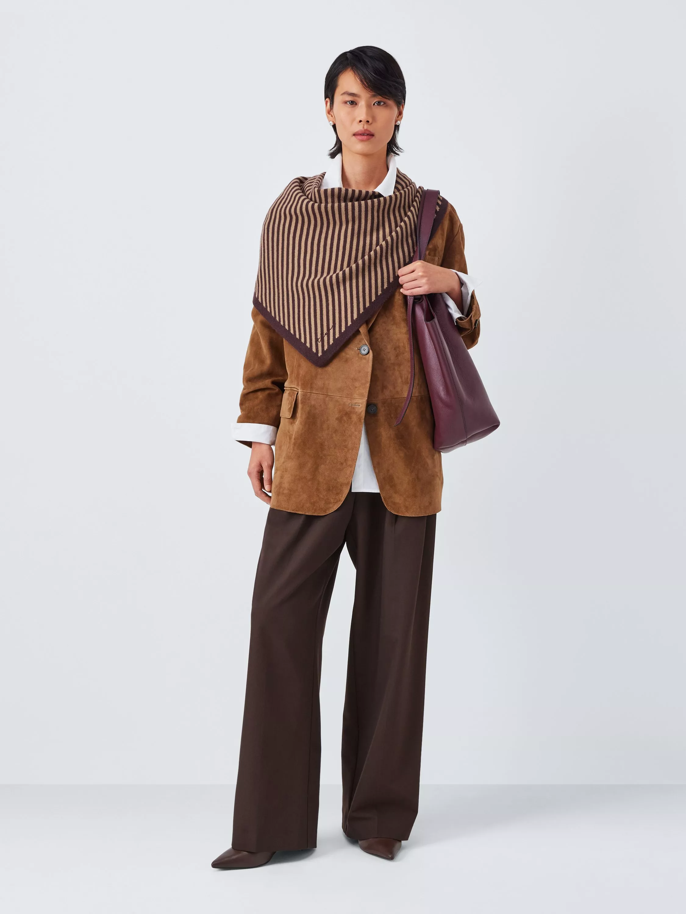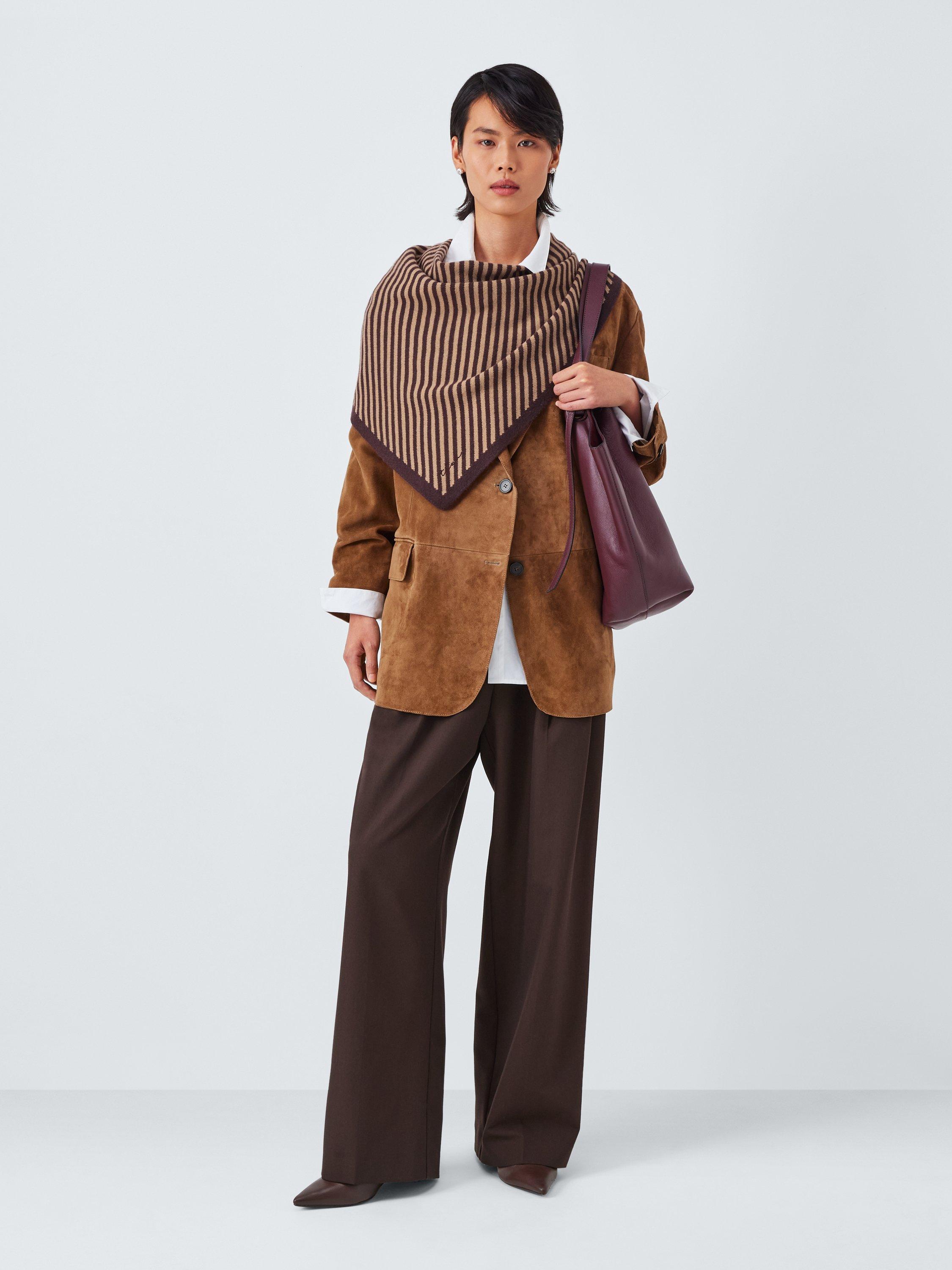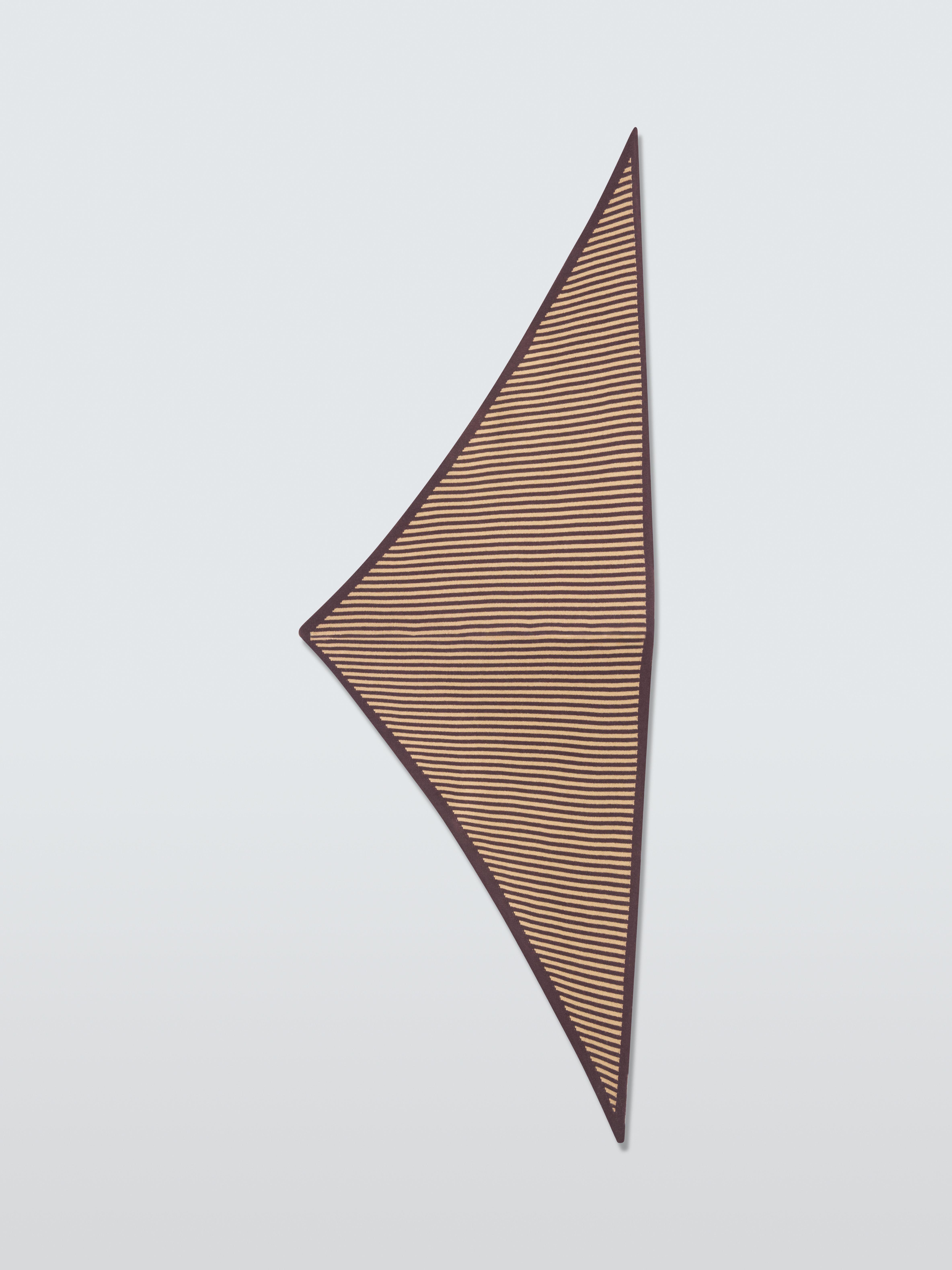 A two-toned, large triangle scarf featuring a classic brown and camel stripe and embroidered TBCo logo. It's knitted from soft and warm merino wool and can be tied in multiple ways for endless styling options.
