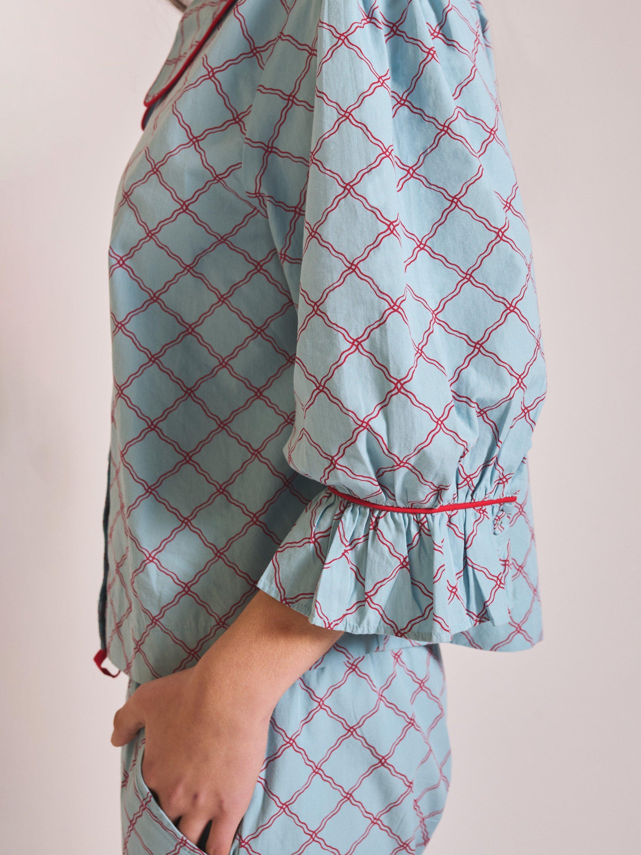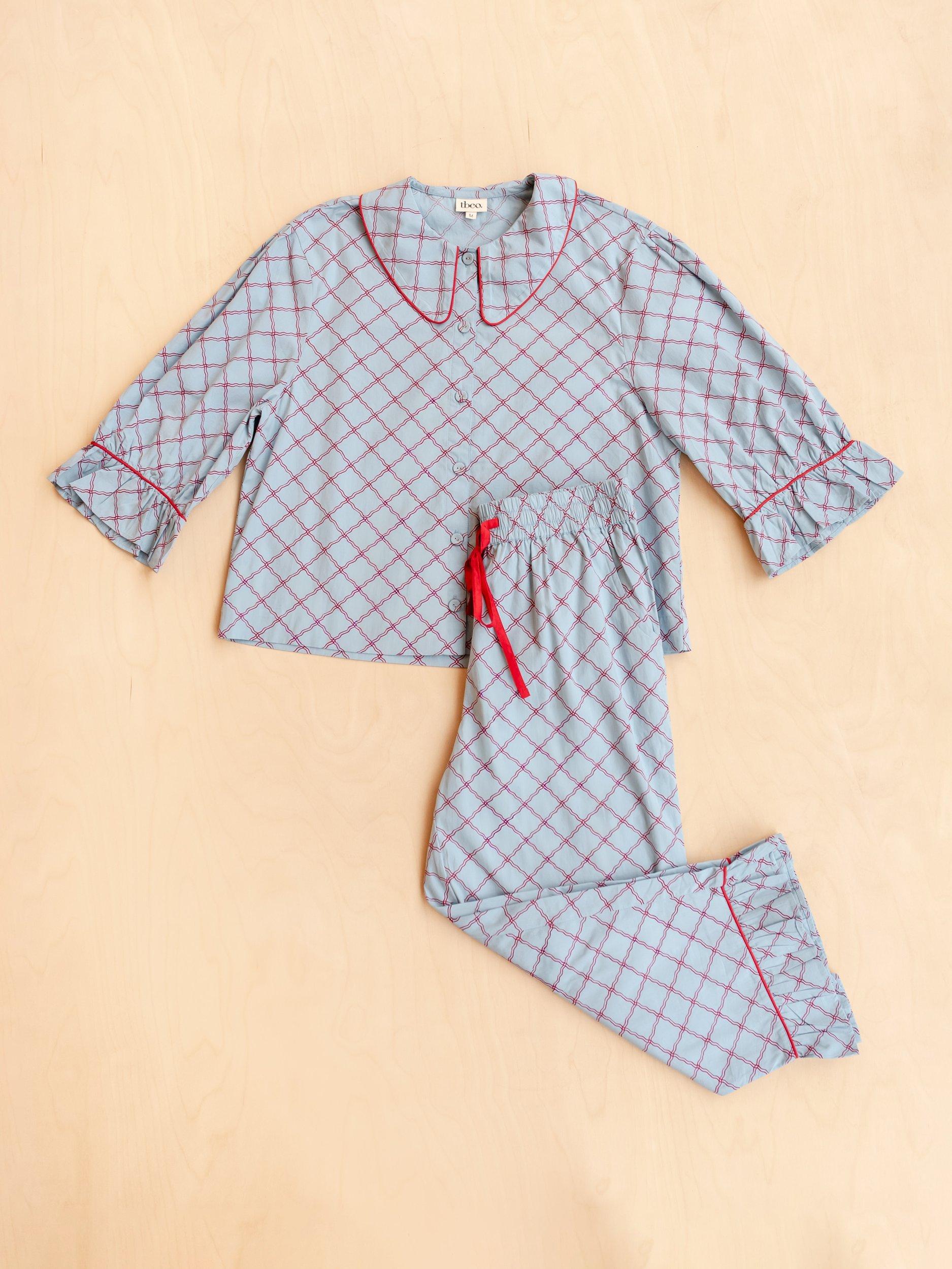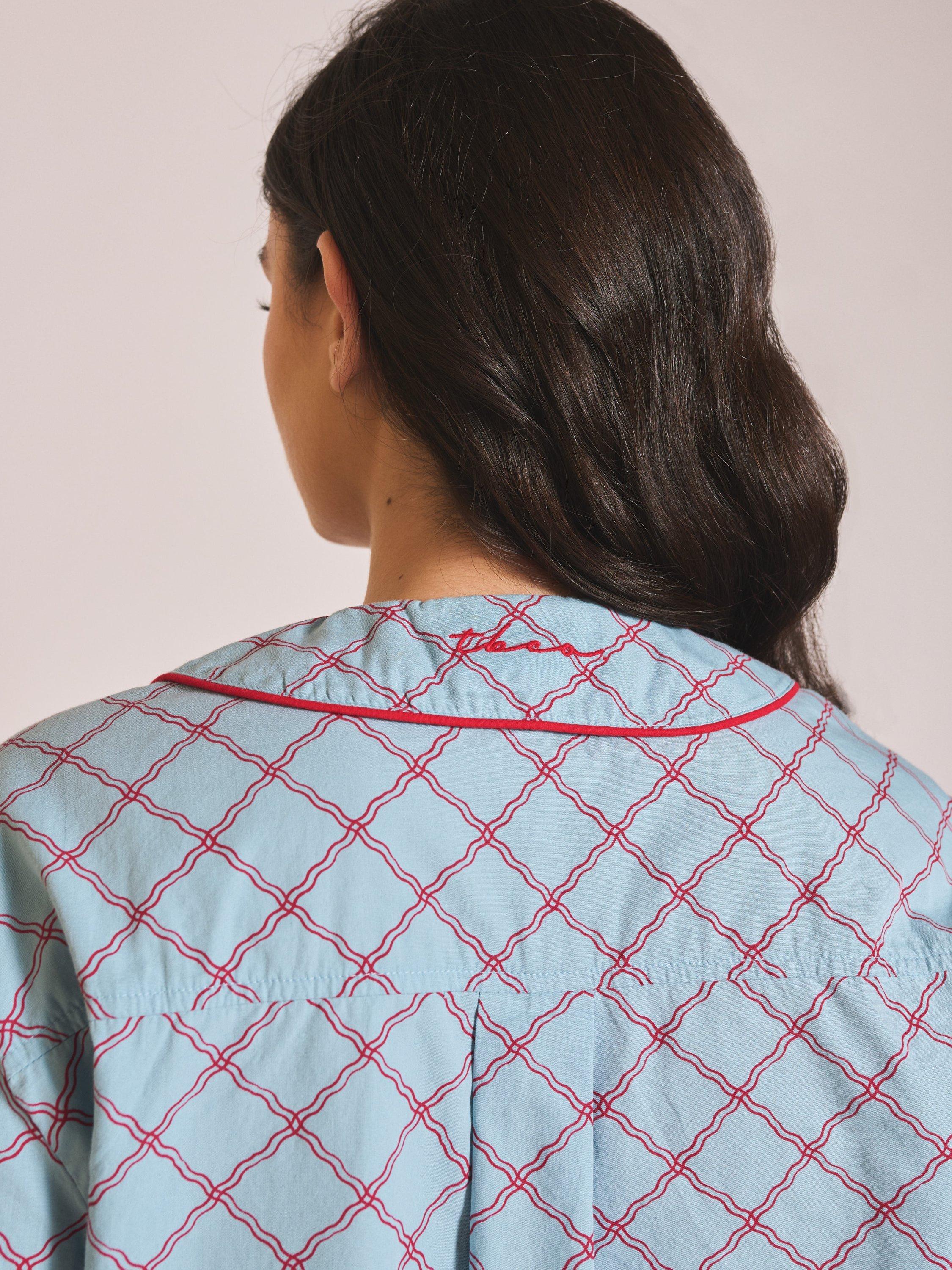 Designed to blur the lines between sleep, lounge and leisure, these pyjamas feel as good at breakfast as they do in bed. Crafted from 100% cotton poplin, this comfortable trouser set features a playful lattice pattern with contrasting piping, oversized collar and delicate frilled cuffs. The soft fabric and elastic waistband ensure a comfortable night's sleep, while the relaxed fit makes them perfect for both lounging and sleeping. And because we all love pockets, there are two on the bottoms.