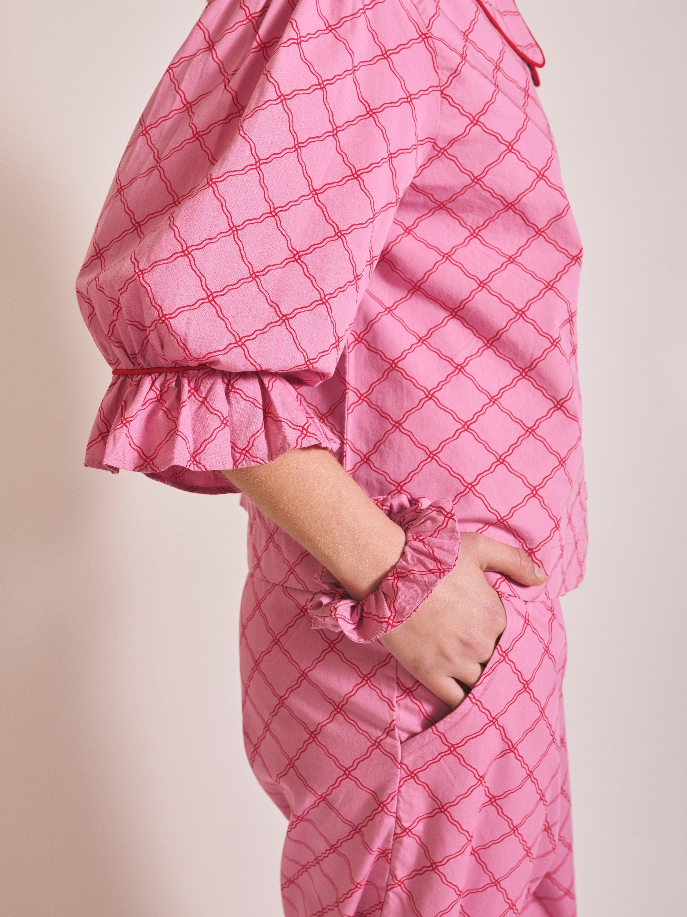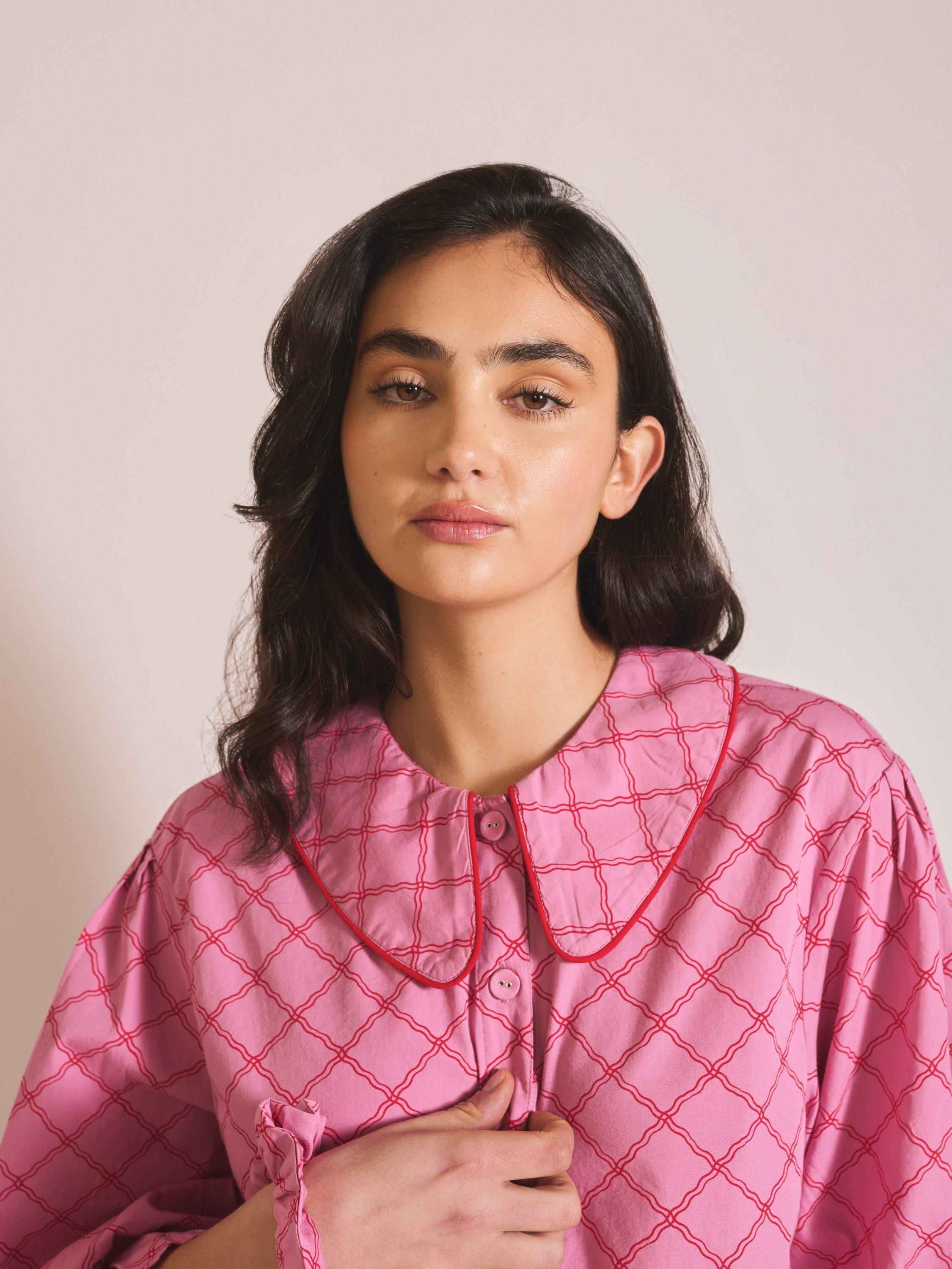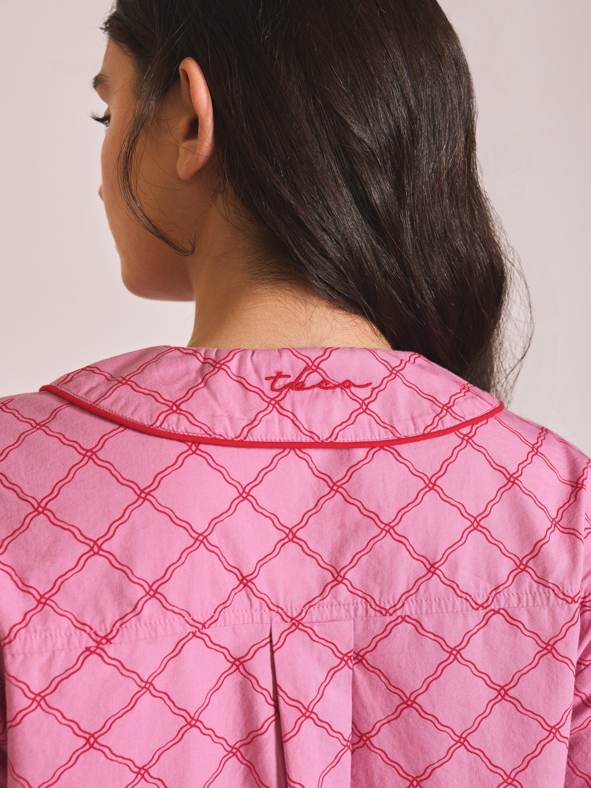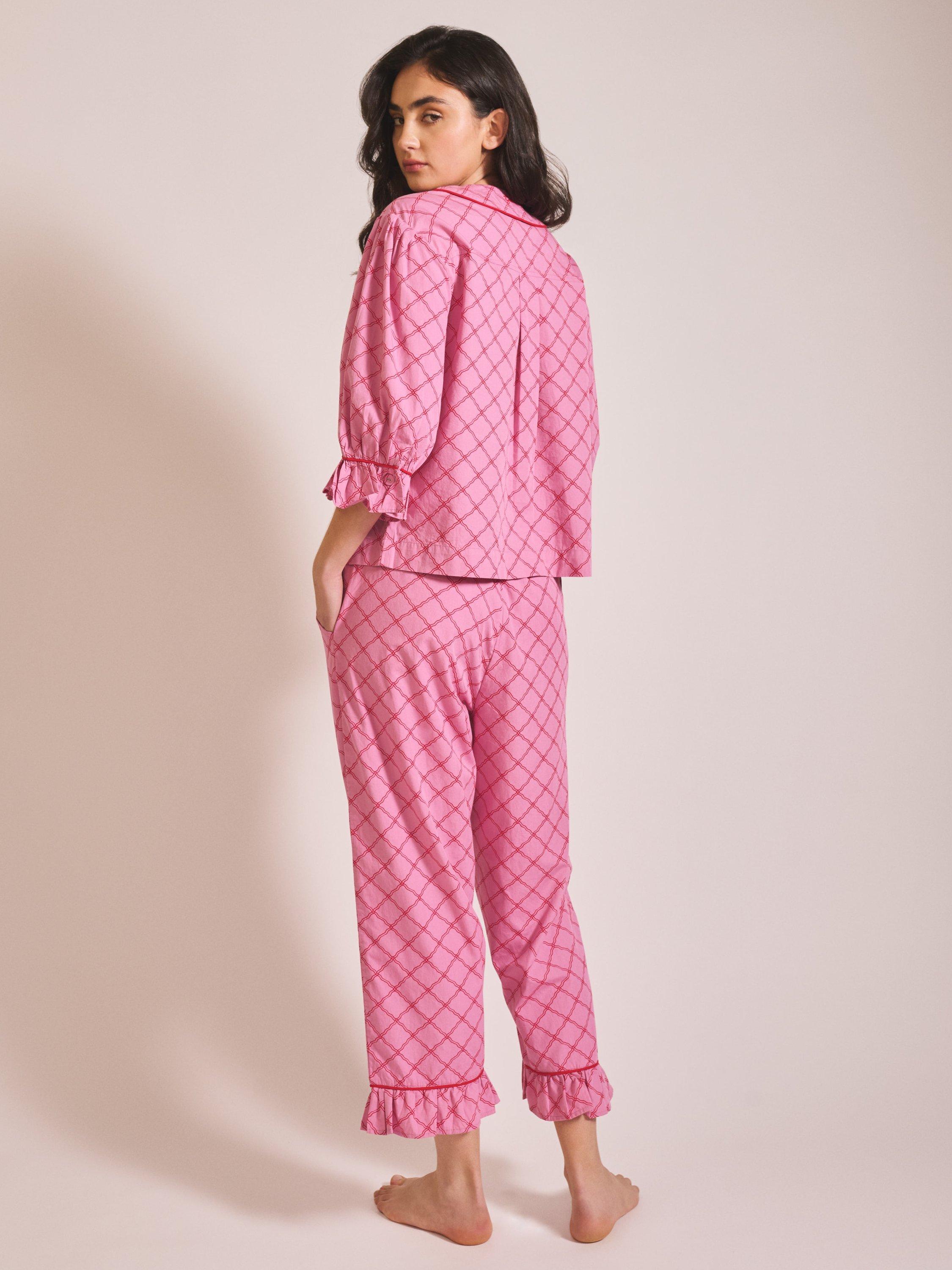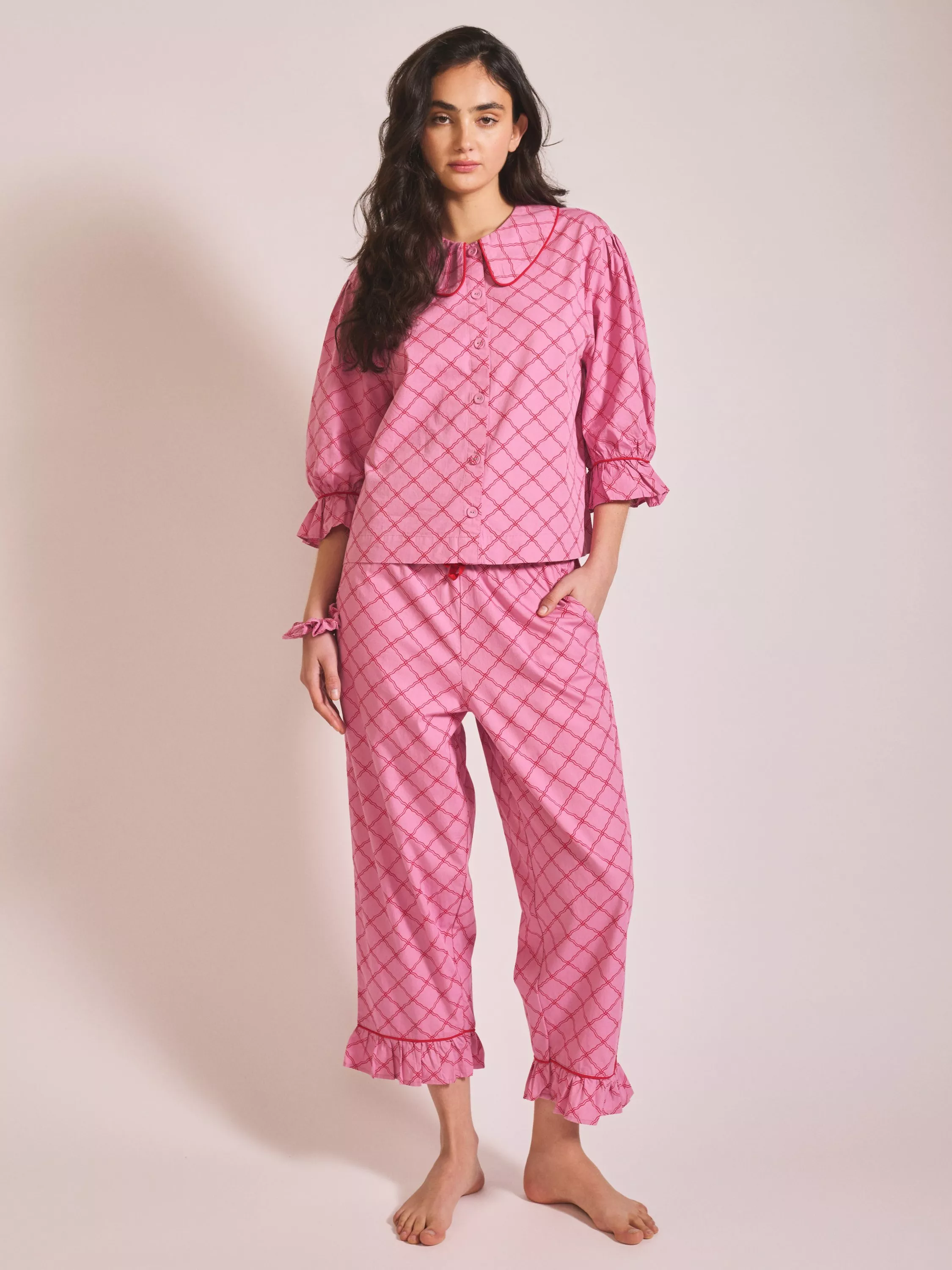 Designed to blur the lines between sleep, lounge and leisure, these pyjamas feel as good at breakfast as they do in bed. Crafted from 100% cotton poplin, this comfortable trouser set features a playful lattice pattern with contrasting piping, oversized collar and delicate frilled cuffs. The soft fabric and elastic waistband ensure a comfortable night's sleep, while the relaxed fit makes them perfect for both lounging and sleeping. And because we all love pockets, there are two on the bottoms.