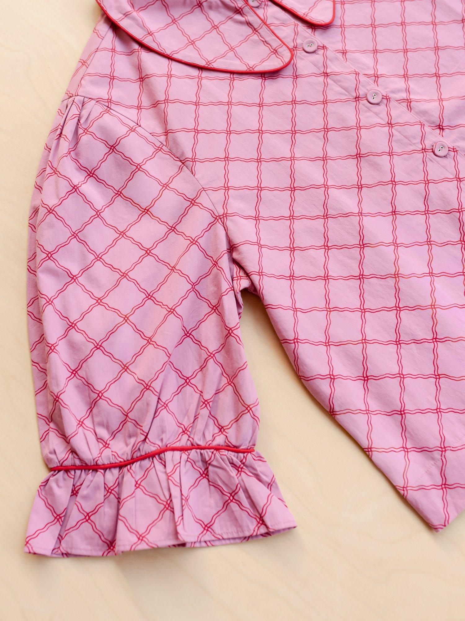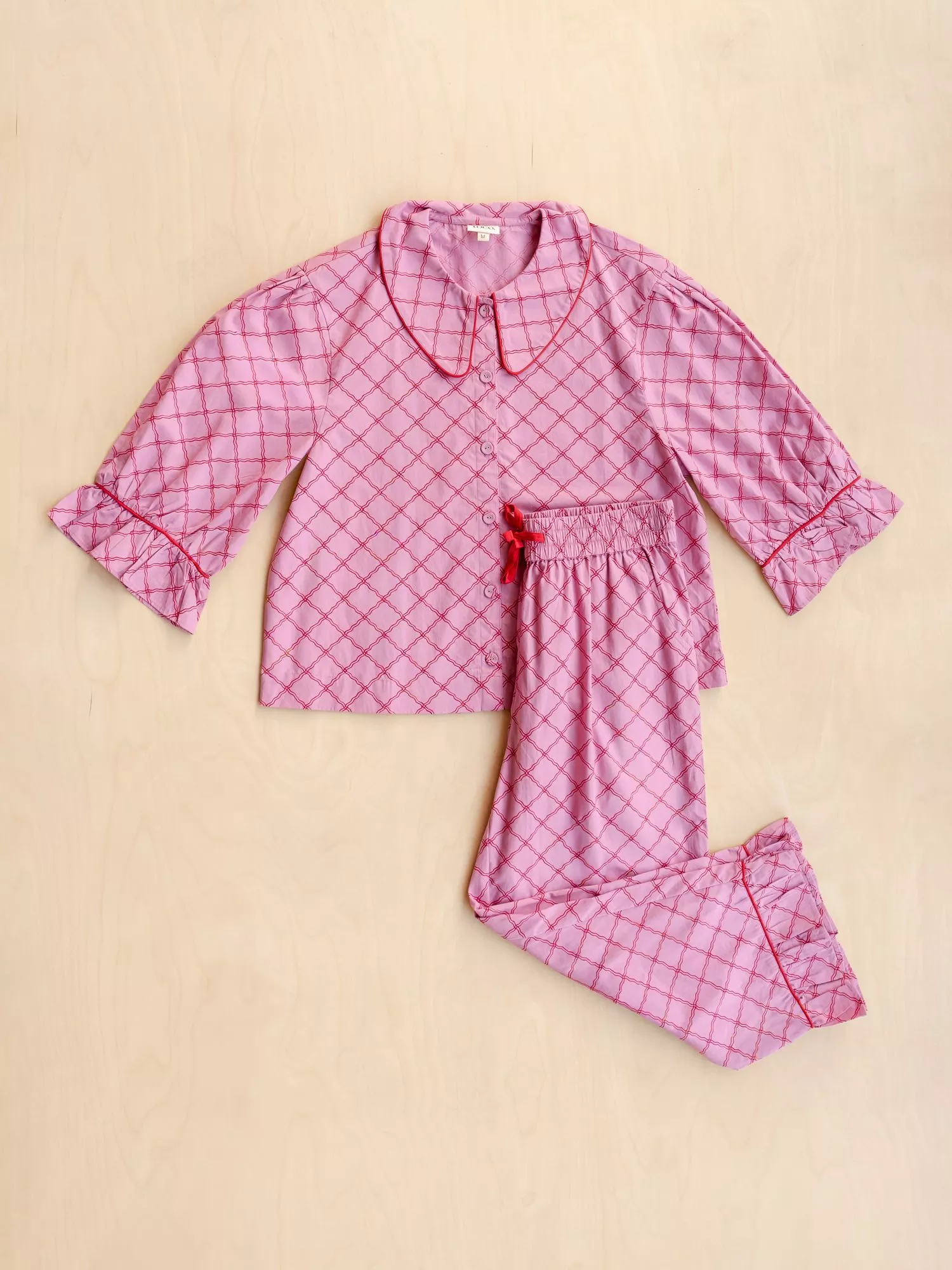 Designed to blur the lines between sleep, lounge and leisure, these pyjamas feel as good at breakfast as they do in bed. Crafted from 100% cotton poplin, this comfortable trouser set features a playful lattice pattern with contrasting piping, oversized collar and delicate frilled cuffs. The soft fabric and elastic waistband ensure a comfortable night's sleep, while the relaxed fit makes them perfect for both lounging and sleeping. And because we all love pockets, there are two on the bottoms.