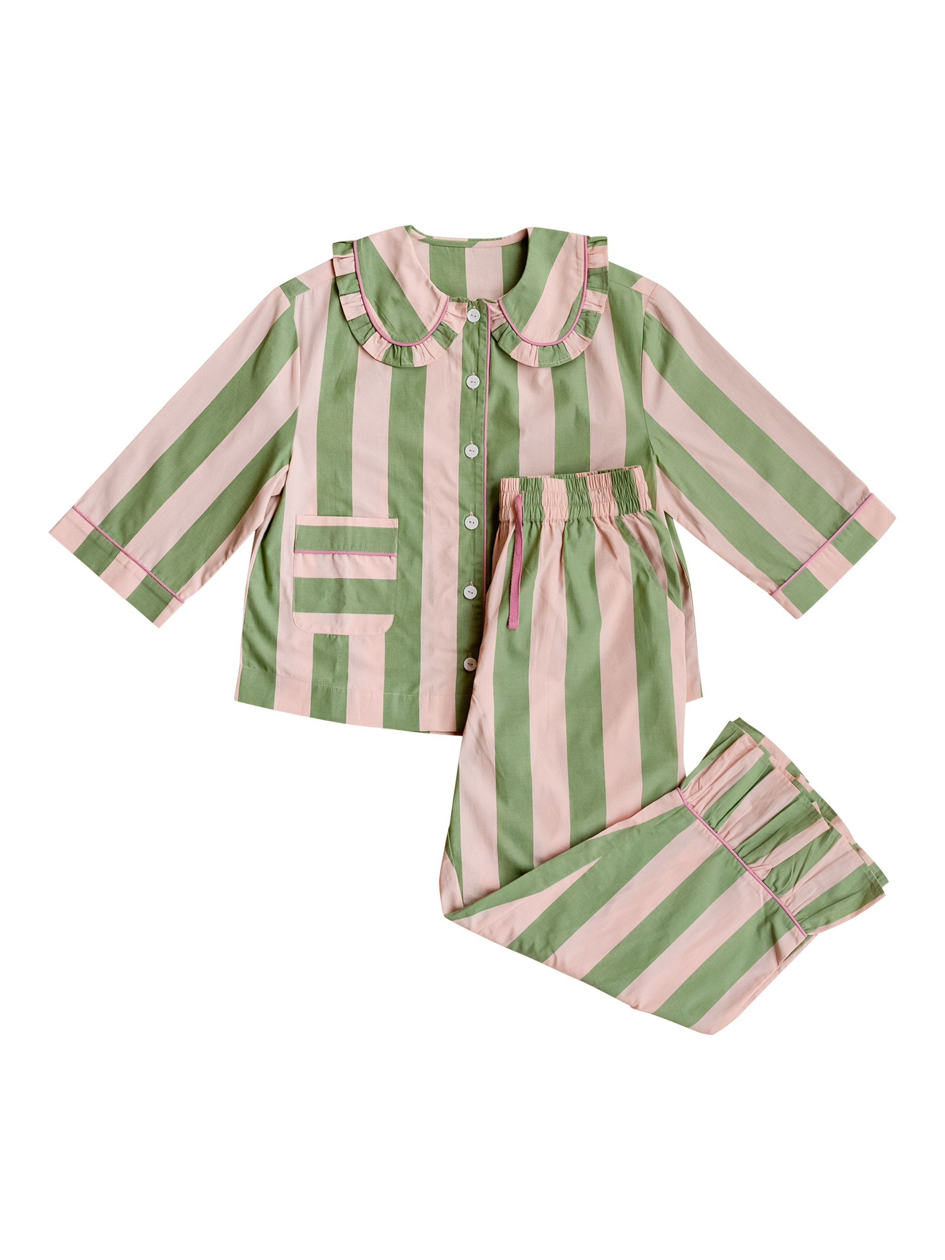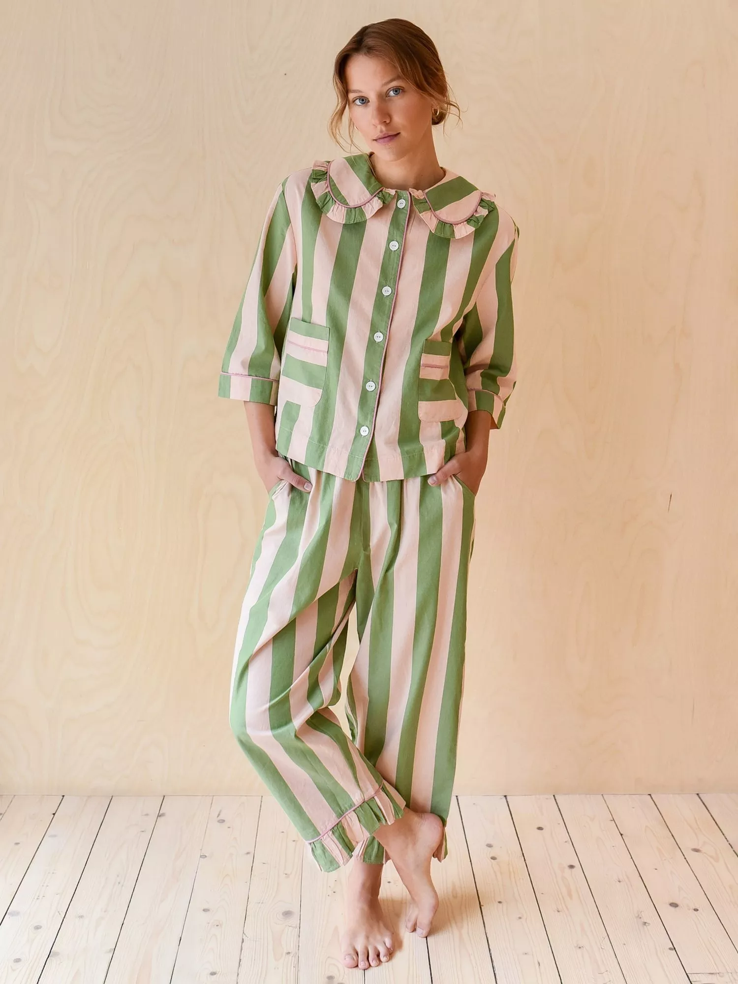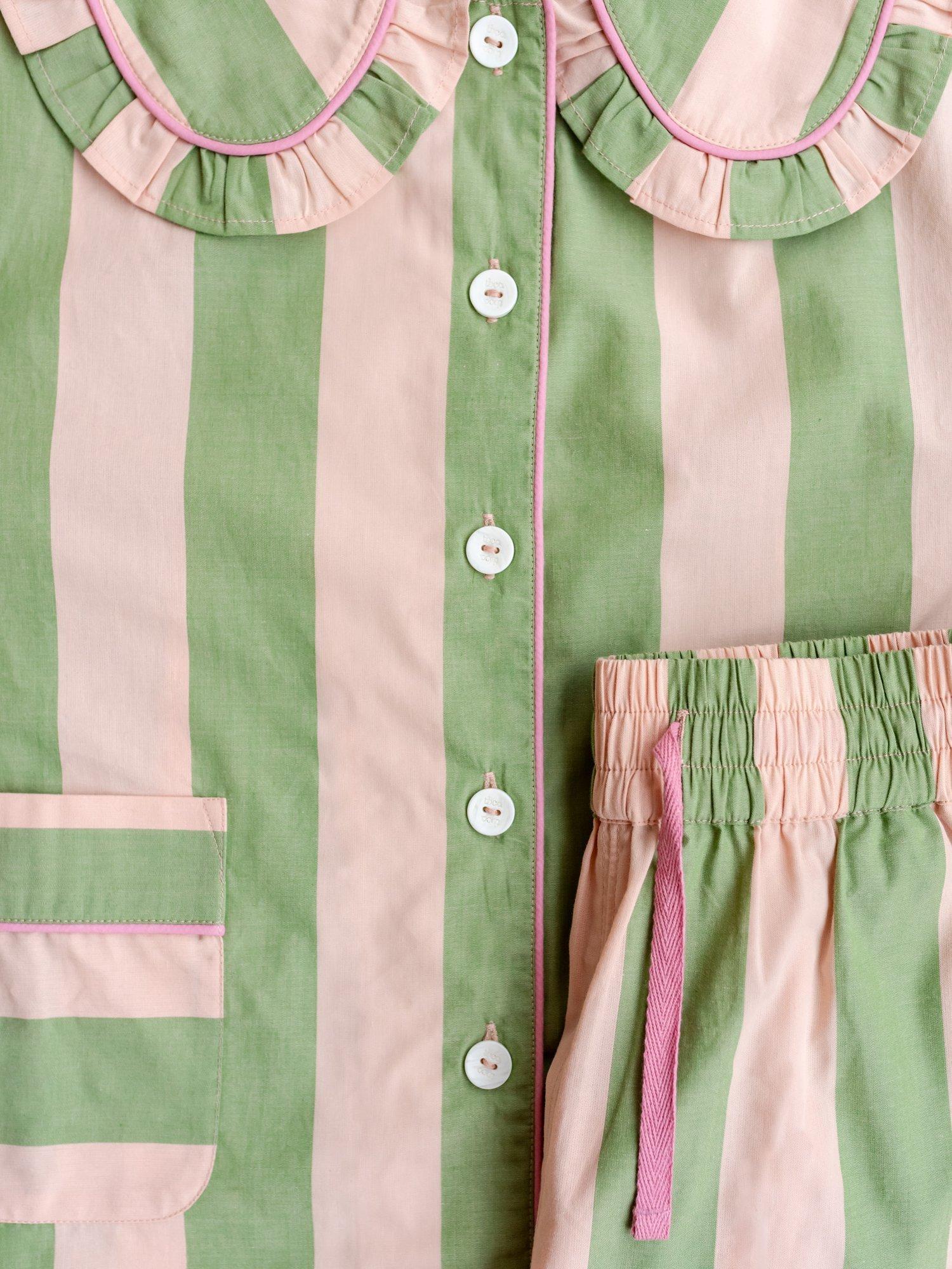 Designed to blur the lines between sleep, lounge and leisure, these pyjamas feel as good at breakfast as they do in bed. Crafted from 100% breathable cotton poplin, this comfortable cropped trouser set features a classic stripe with contrast piping. The drawstring is stitched into the comfortable elastic waist so that you'll never lose it. The ruffled collar and trim look so good, you'll never hide behind the door again when your takeaway arrives. The sleeves are cropped so they won't get wet when you wash your face.