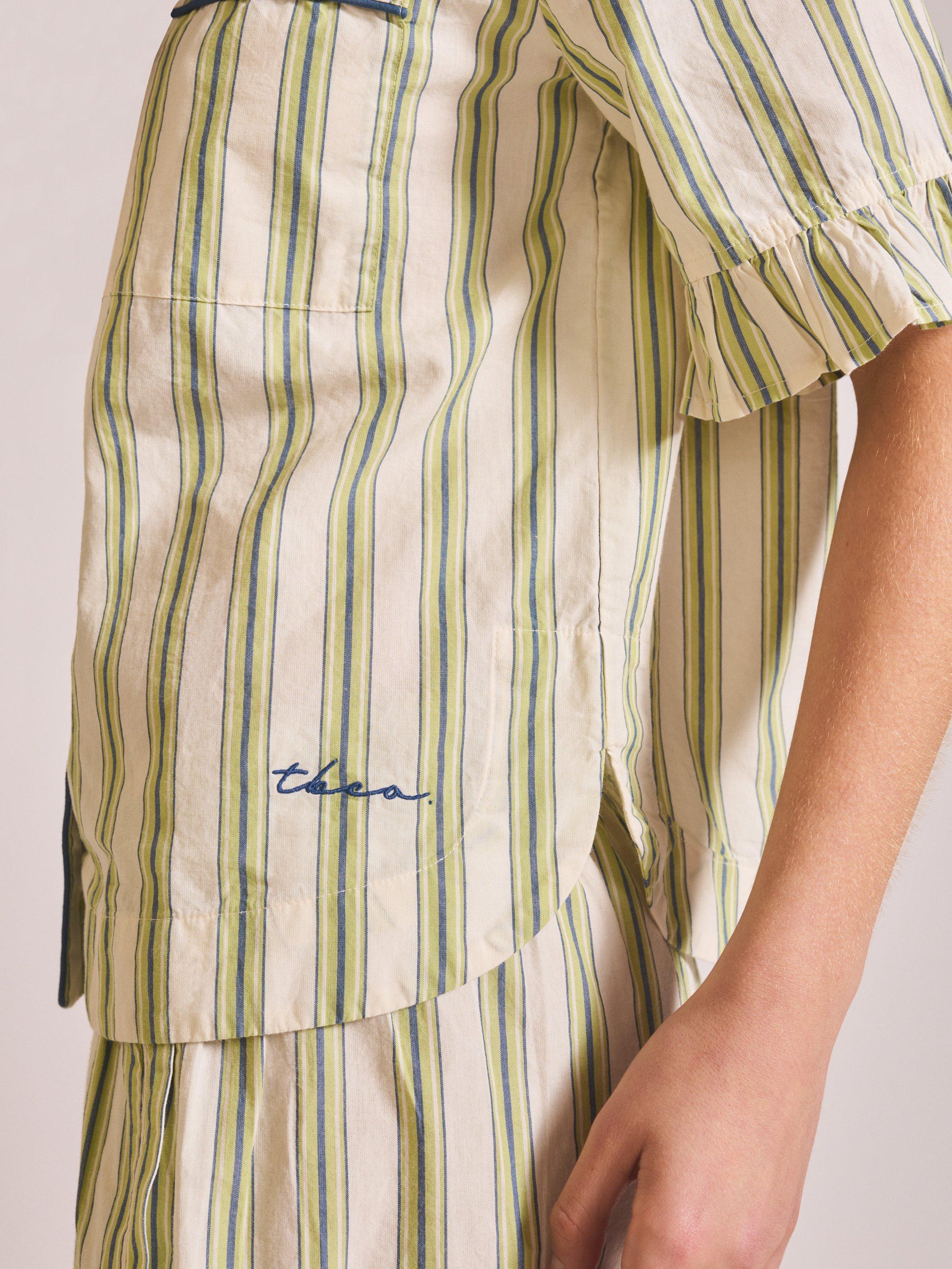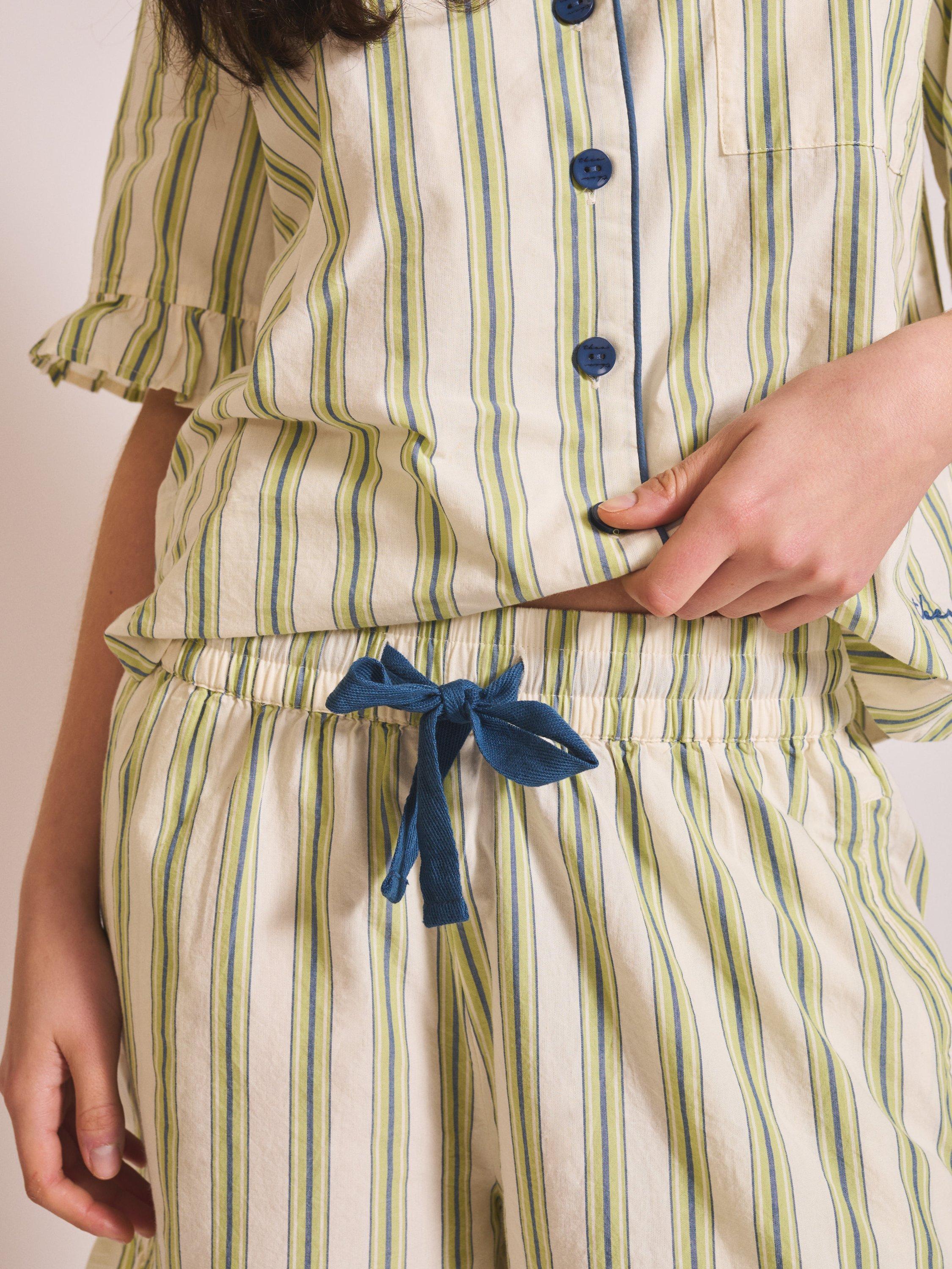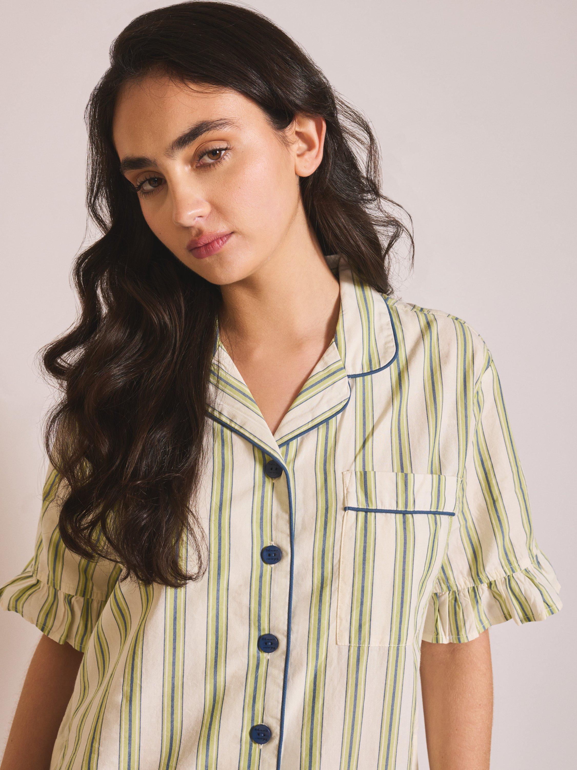 Designed to blur the lines between sleep, lounge and leisure, these pyjamas feel as good at breakfast as they do in bed. Crafted from 100% breathable cotton poplin, this comfortable shorts set features a classic stripe with contrasting piping and playful frilled edges. The drawstring is stitched into the comfortable elastic waist so that you'll never lose it, and the cotton is breathable, keeping you at the perfect temperature while you snooze. And because we all love pockets, there are two on the shorts and one on the top.