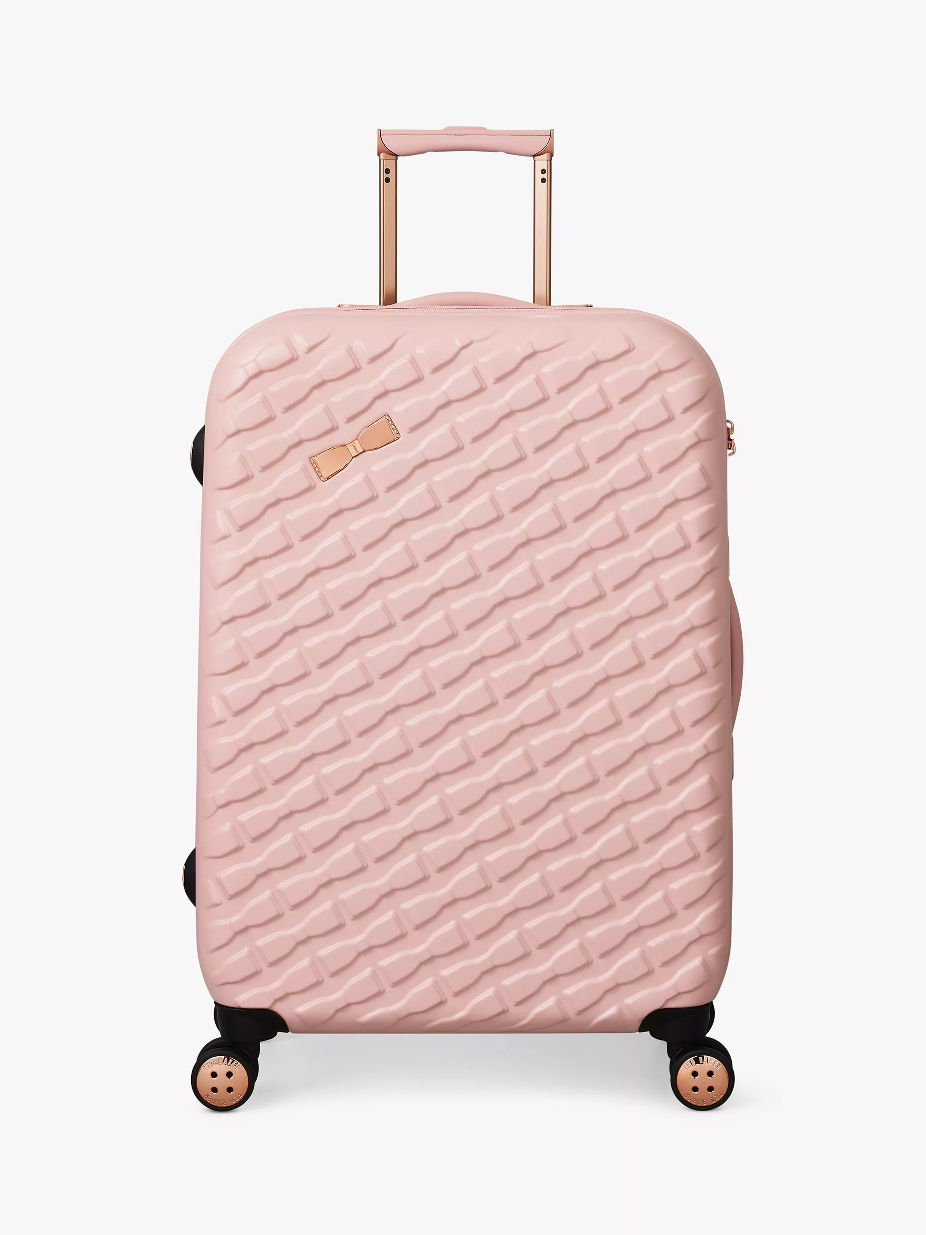 The state of the art aircraft grade aluminium has a lightweight trolley system, with full bespoke Ted Baker hardware in rose gold finish. Four smooth rolling double wheels for ultimate 360 degree manoeuvrability.