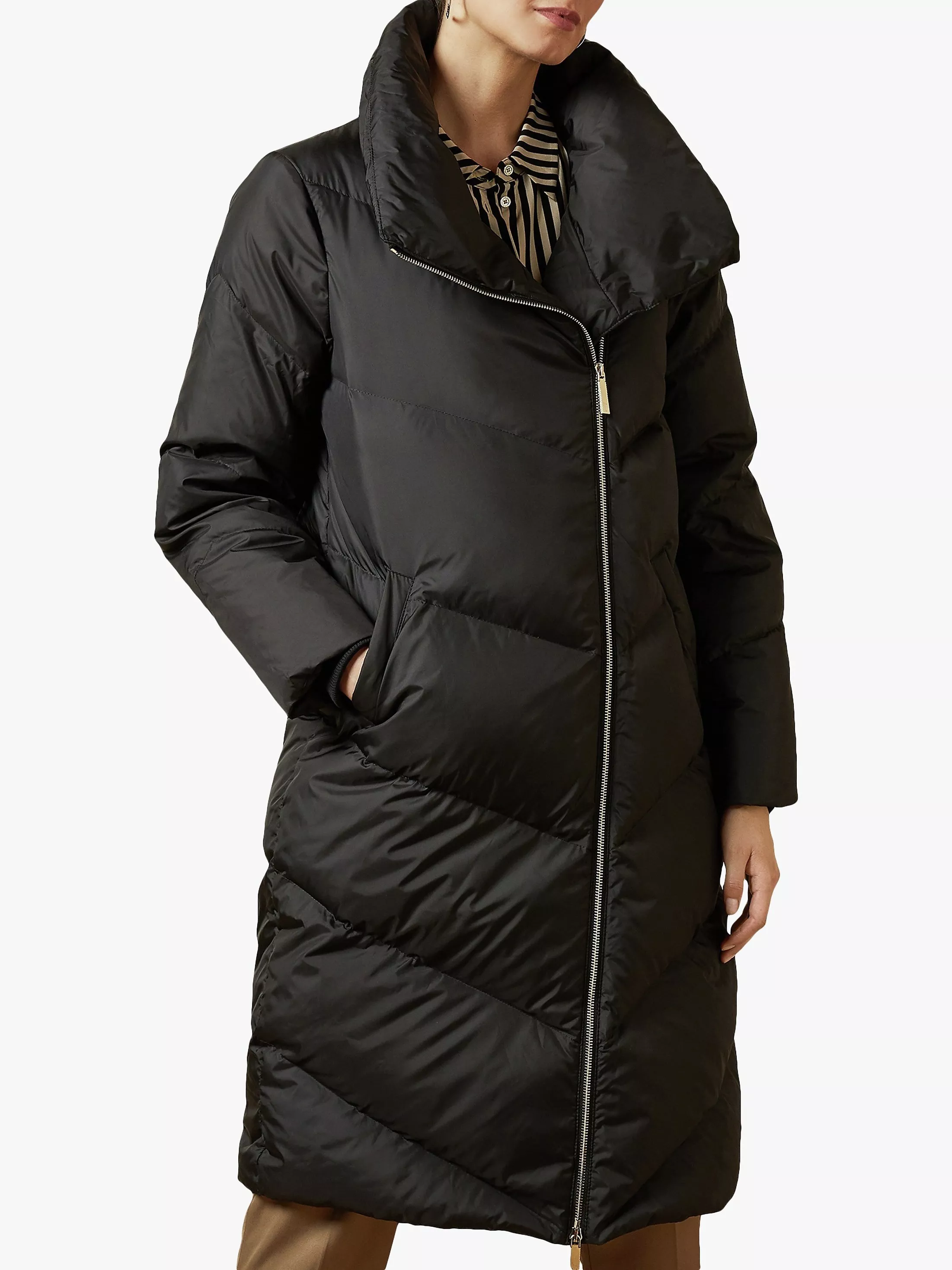 Based on the essential puffer reinspired by contemporary style, the Breiy coat from Ted Baker is cut in a longer length with quilted stitch details, a high-neck collar and a zip front fastening for a clean, sleek shape. Relaxed in fit and ideal for a modern wardrobe, you can easily layer over both formal and casual separates including chunky knits, blazers and dresses.