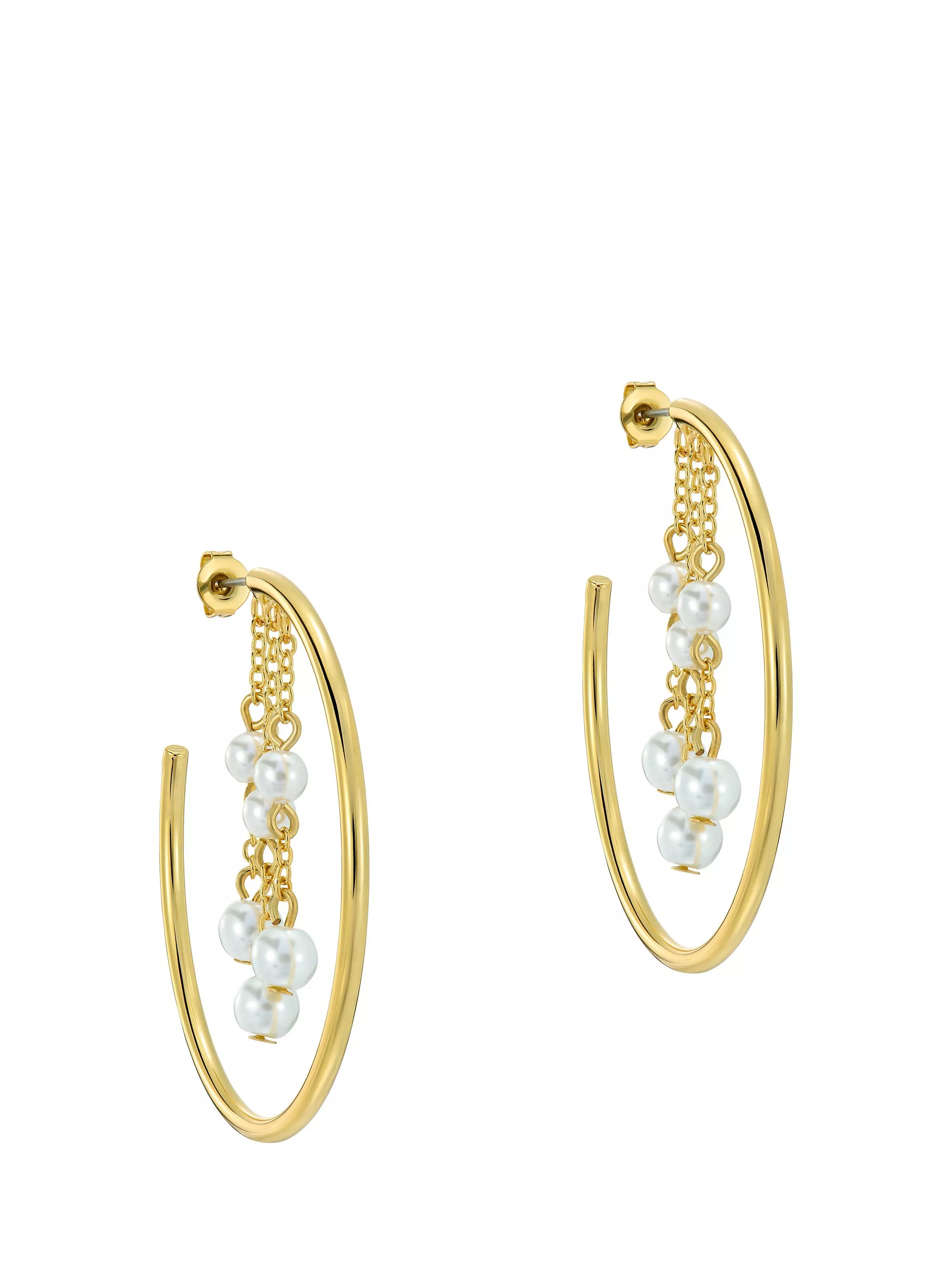 Complete your outfit with Ted Baker's cascade hoop pearl earrings. These unique hoops feature faux pearls suspended on delicate chains from the inner top of the hoops. Finished in a sleek gold tone and designed with hypoallergenic posts for comfortable wear, they come packaged in a Ted Baker branded gift box - perfect for gifting or treating yourself. Suitable for pierced ears only.