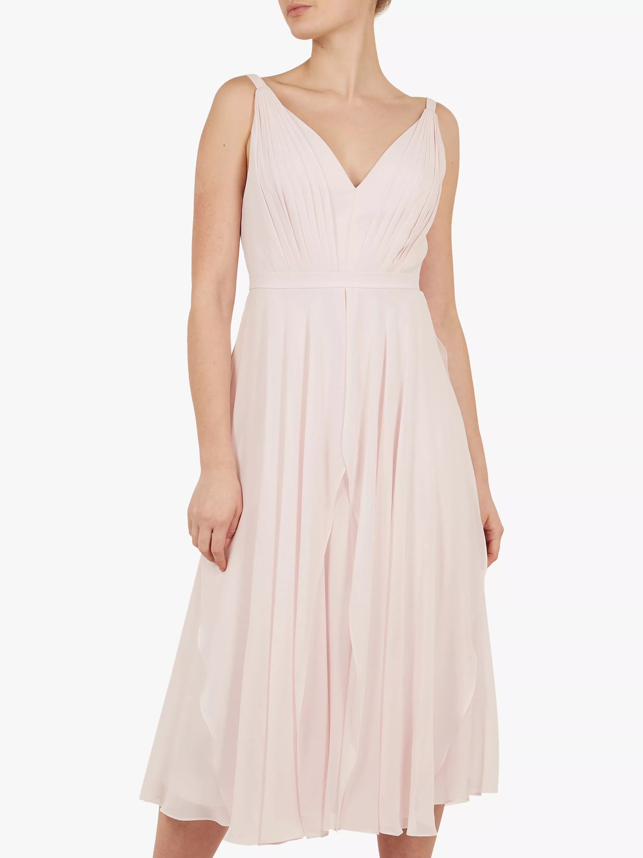 A graceful, simple piece from Ted Baker, this dress is designed in gorgeous, floaty georgette in a flattering V-neck shape with an empire line seam that leads to a full skirt. Draping elegantly over the silhouette, finish with barely-there heels and a metallic clutch.