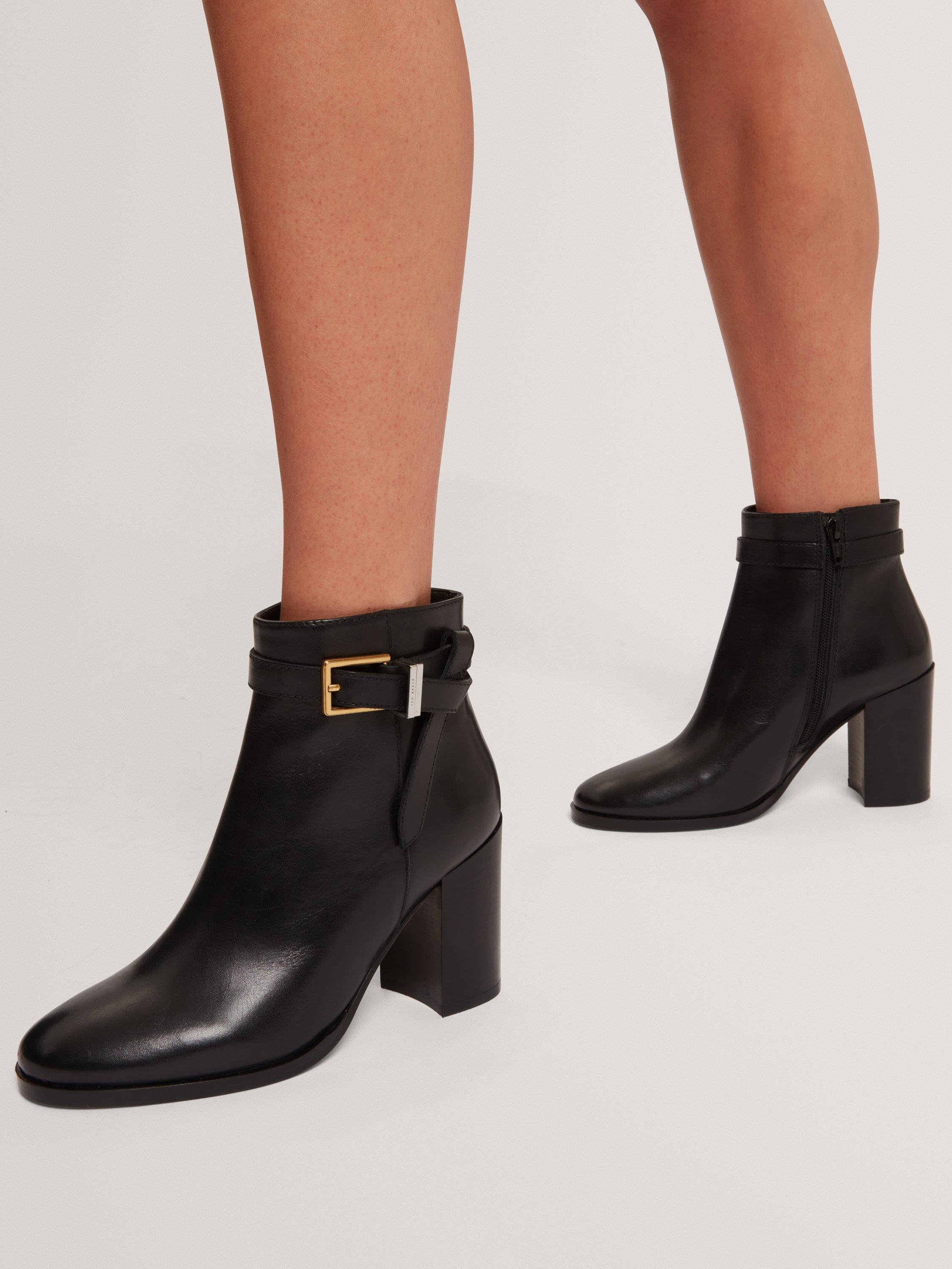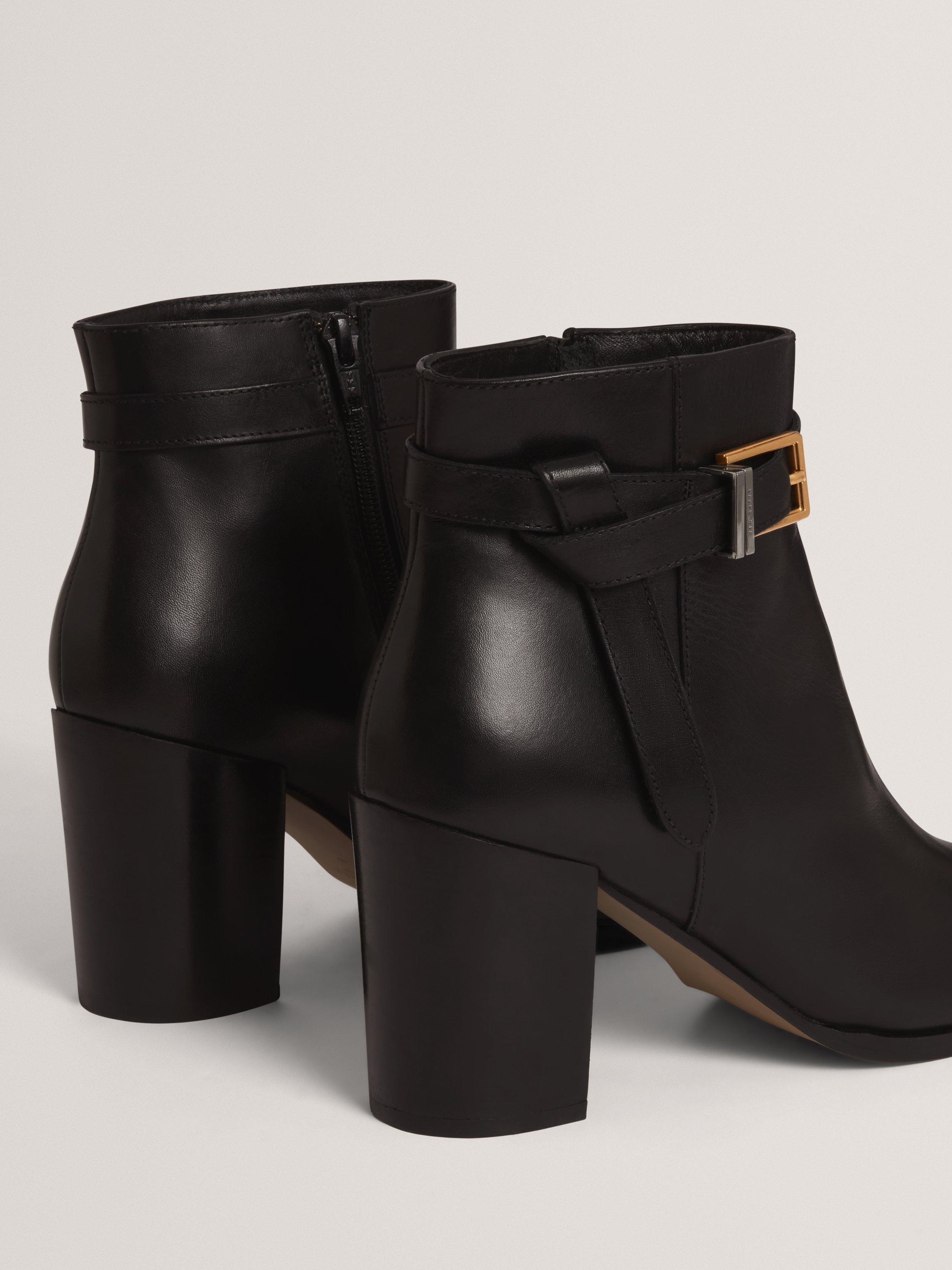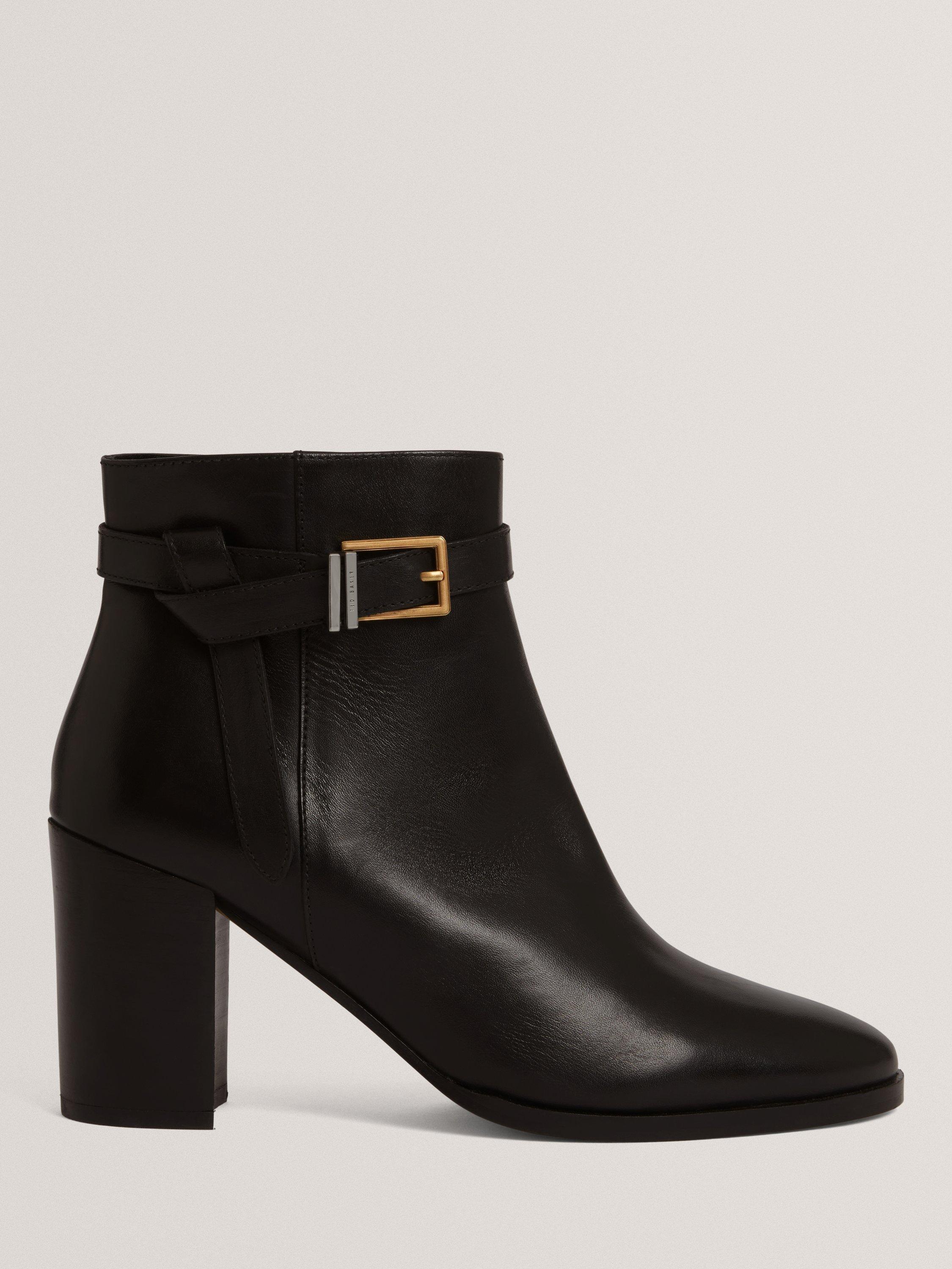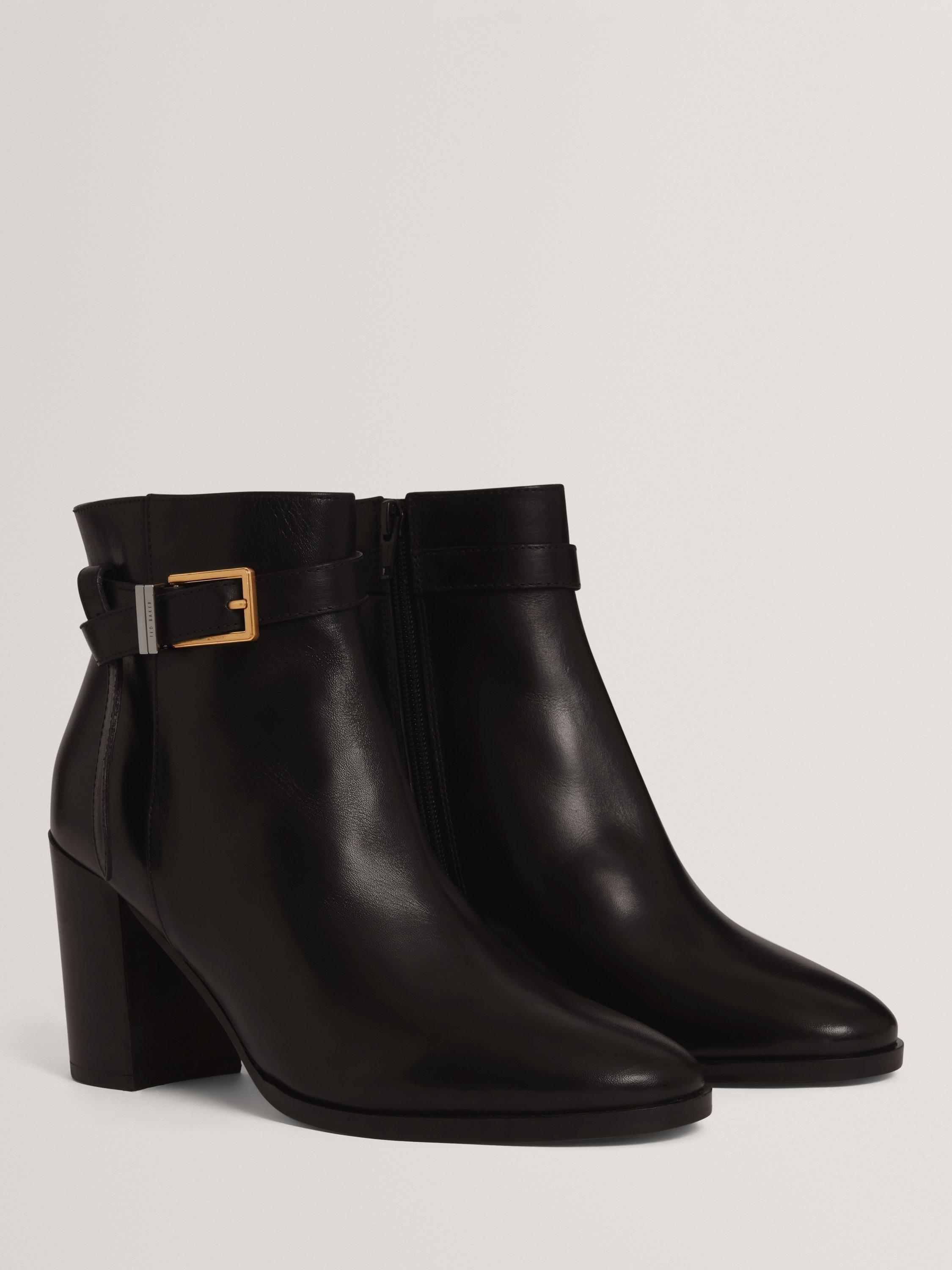 A pair of heeled ankle boots from Ted Baker. Cut from quality leather and resting on a block heel, they are finished with a neat almond-shaped toe and belt details.