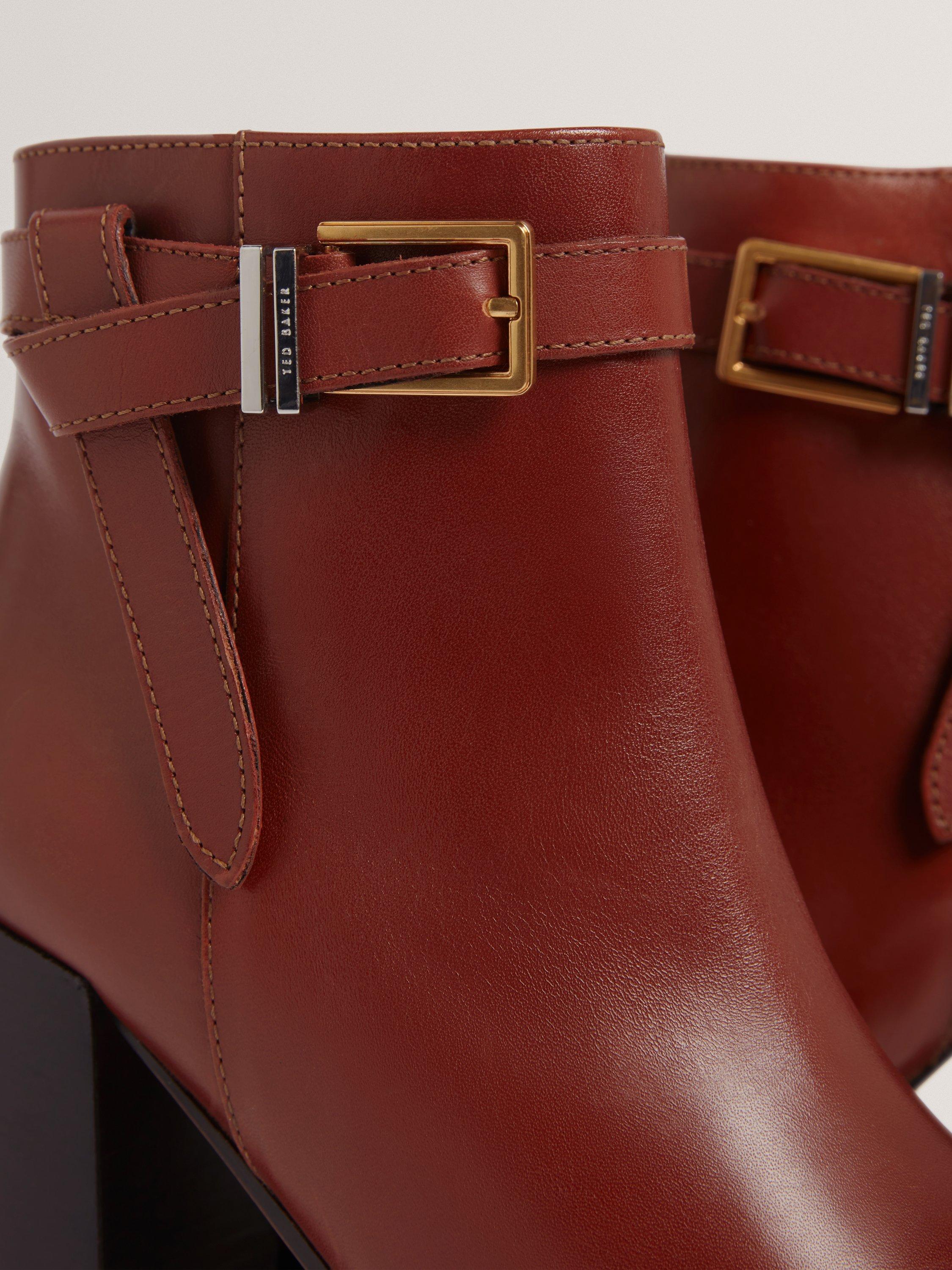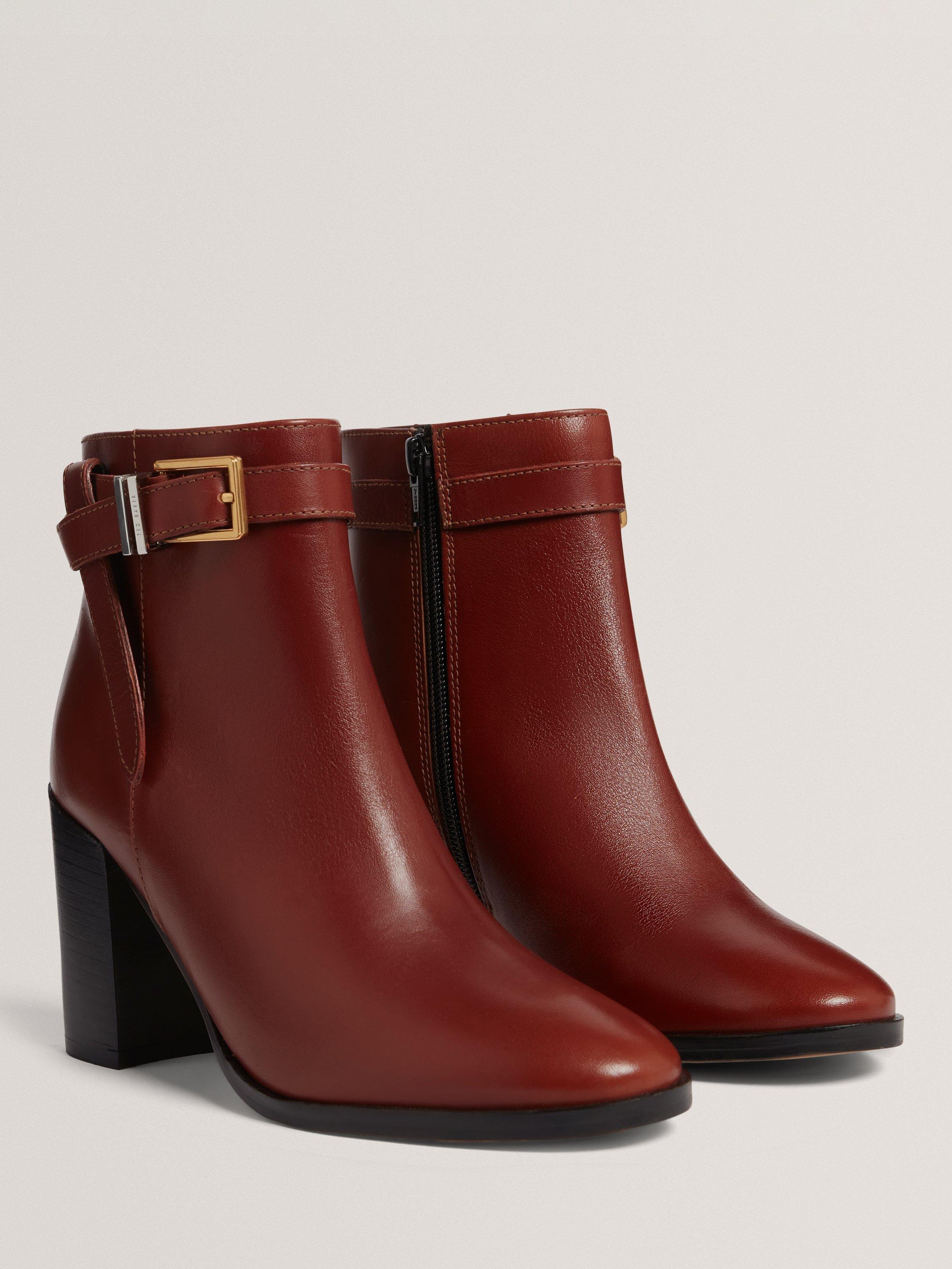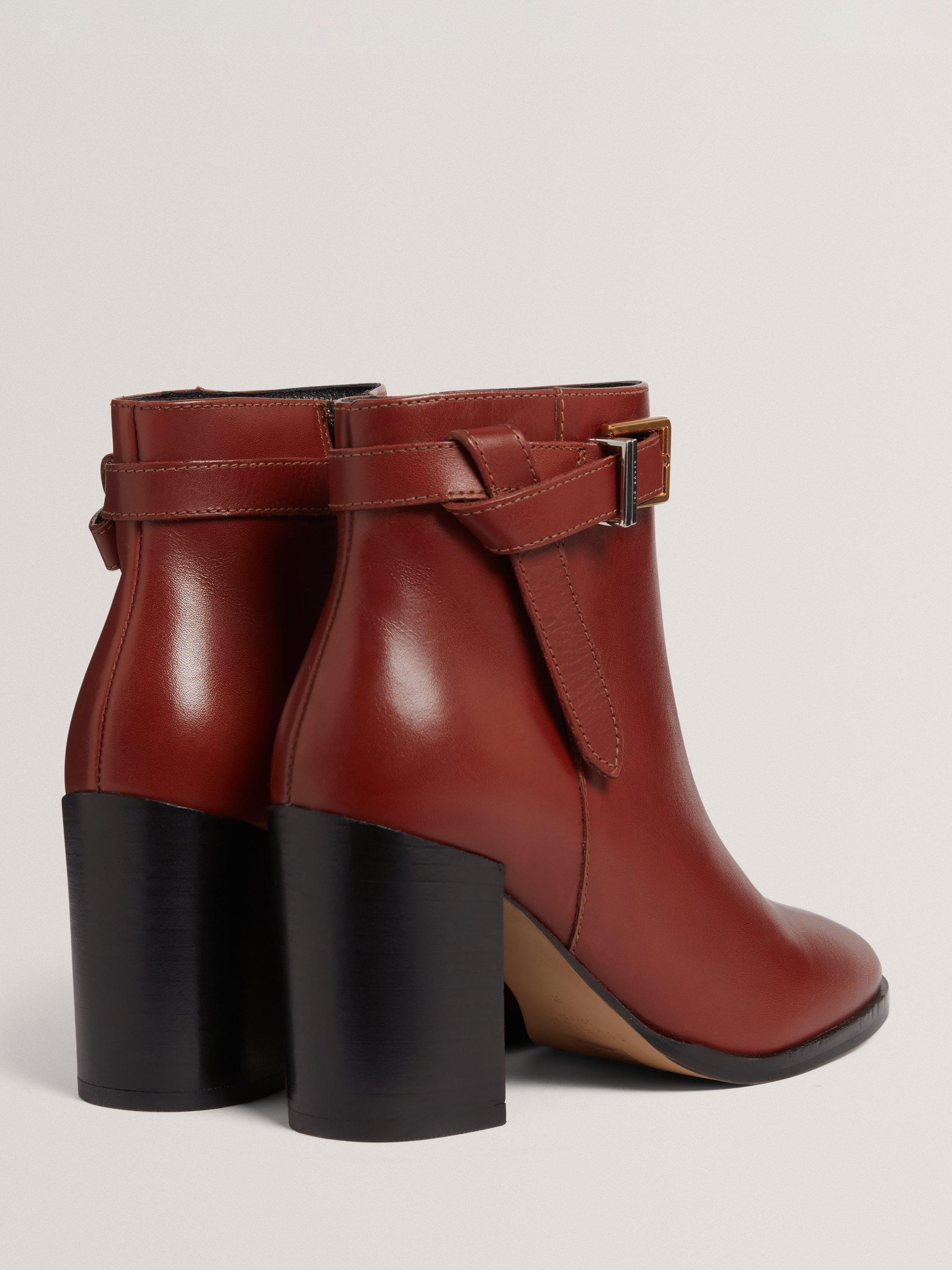 A pair of heeled ankle boots from Ted Baker. Cut from quality leather and resting on a block heel, they are finished with a neat almond-shaped toe and belt details.