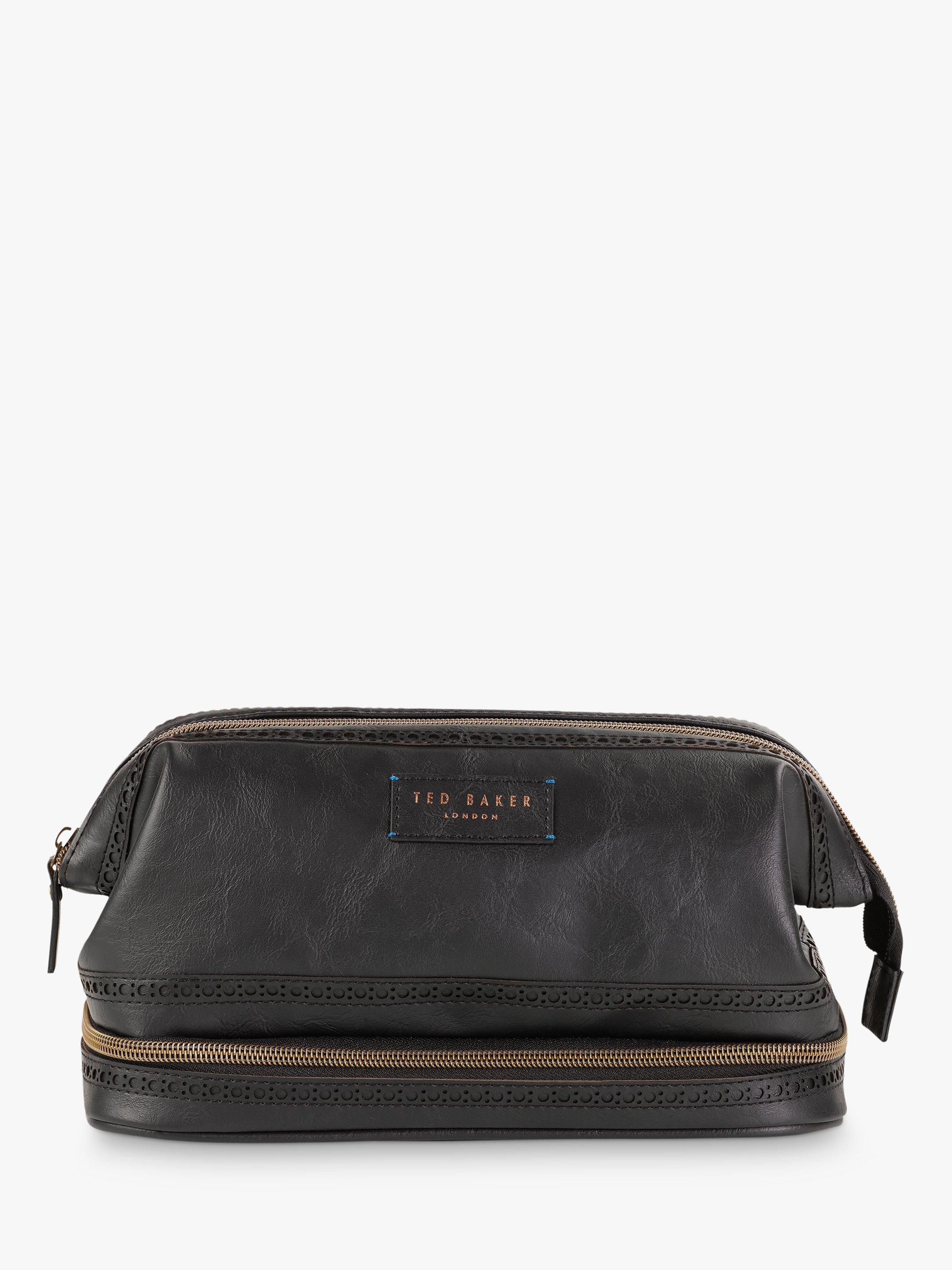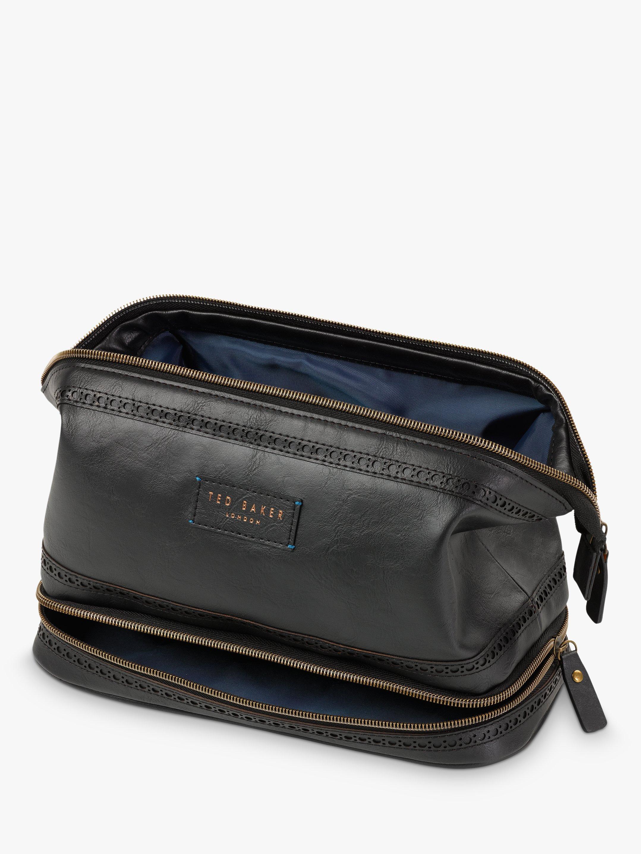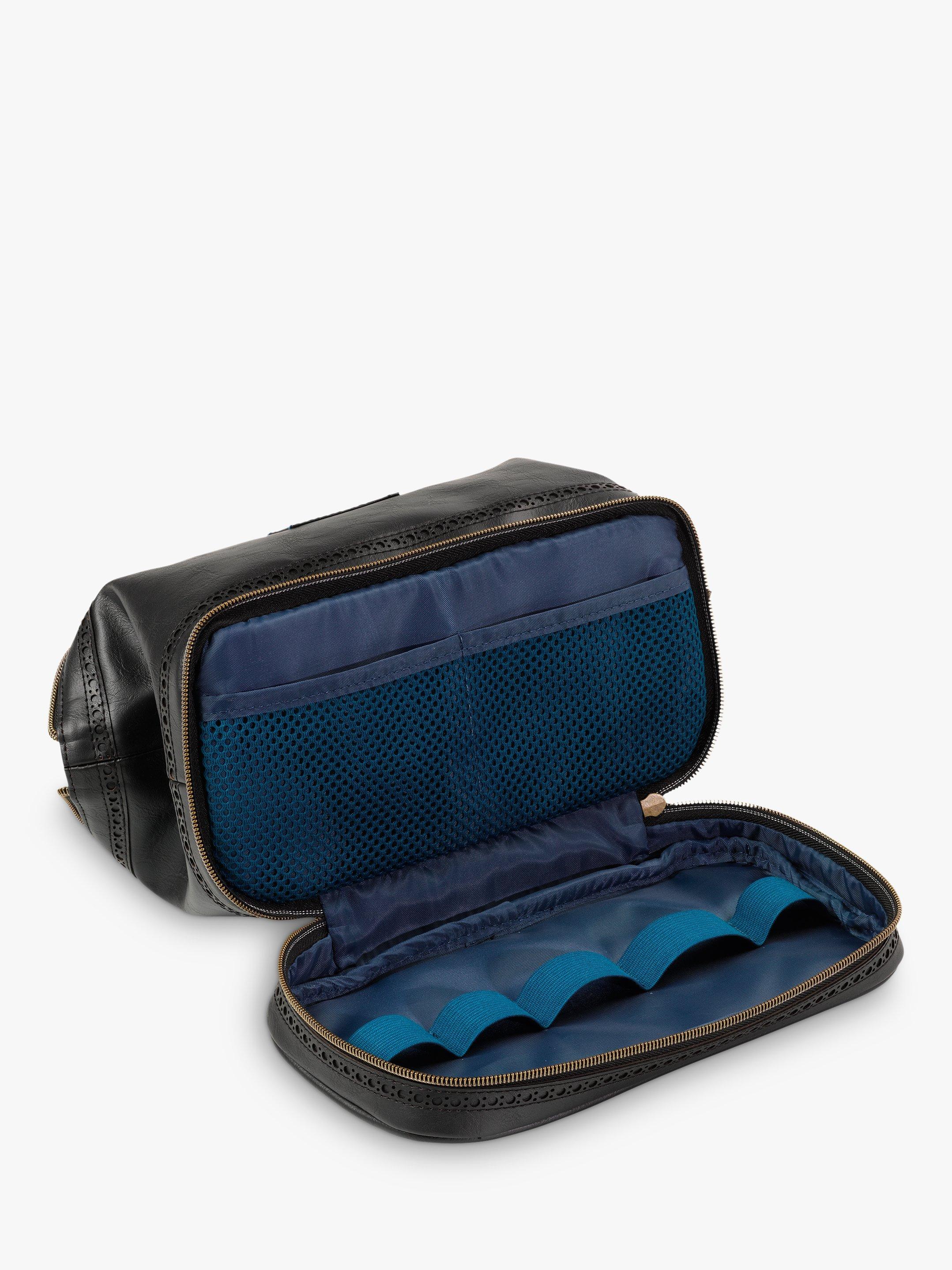This Ted Baker zipped Cobbler leather wash bag allows men to transport their belongings in style, with ample room for toiletries and other essential travel items. There are two rectangular compartments in royal blue, with mesh pockets to securely keep bits on place. With mature-looking black leather tying the piece together, it's a stylish addition to a man's luggage collection.