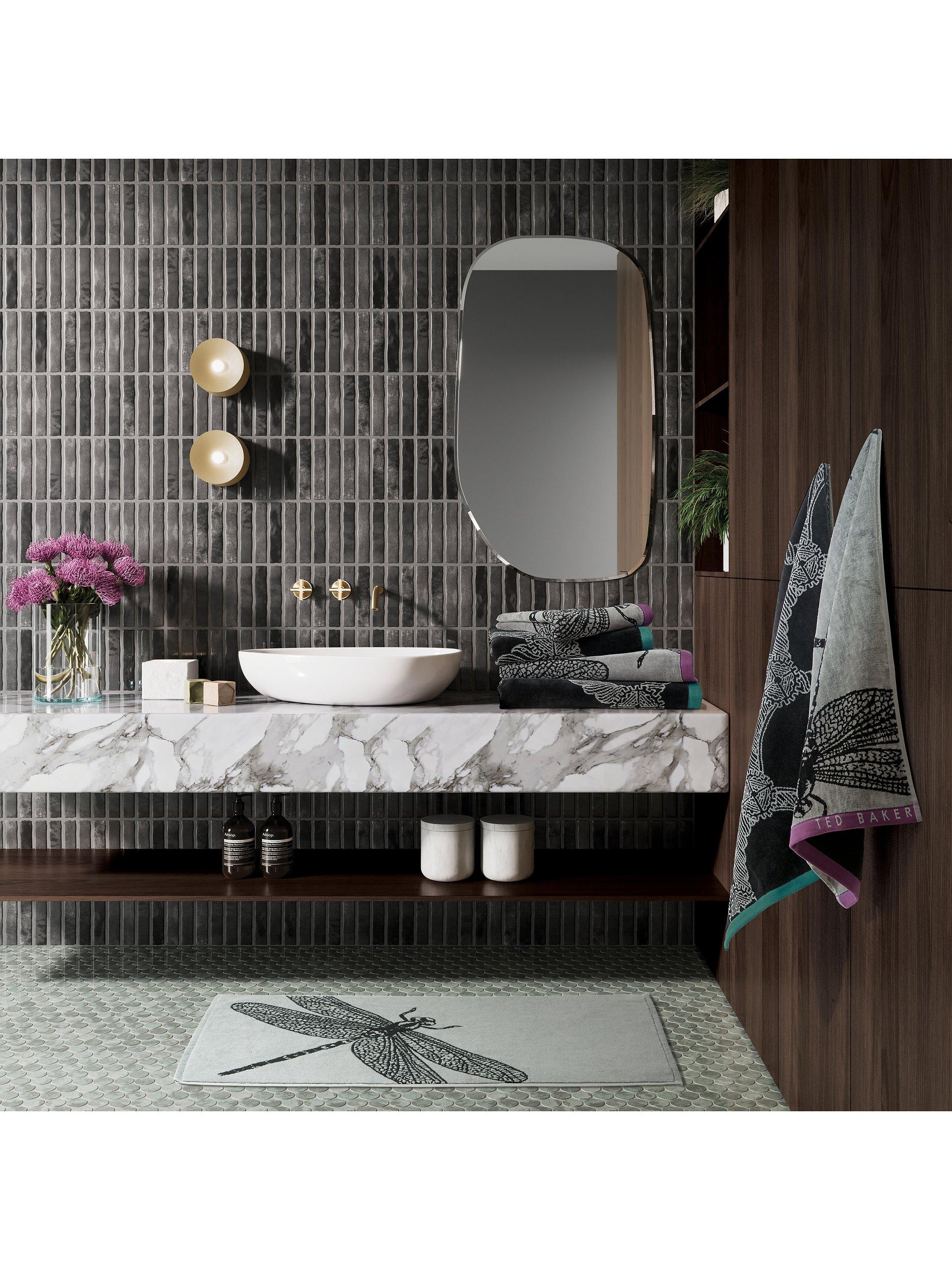 Add edgy modern glamour to your bathtime routine. These eye-catching bath mats feature a scaled-up dragonfly design injected with a modern pop of colour. They're made from soft cotton velour.