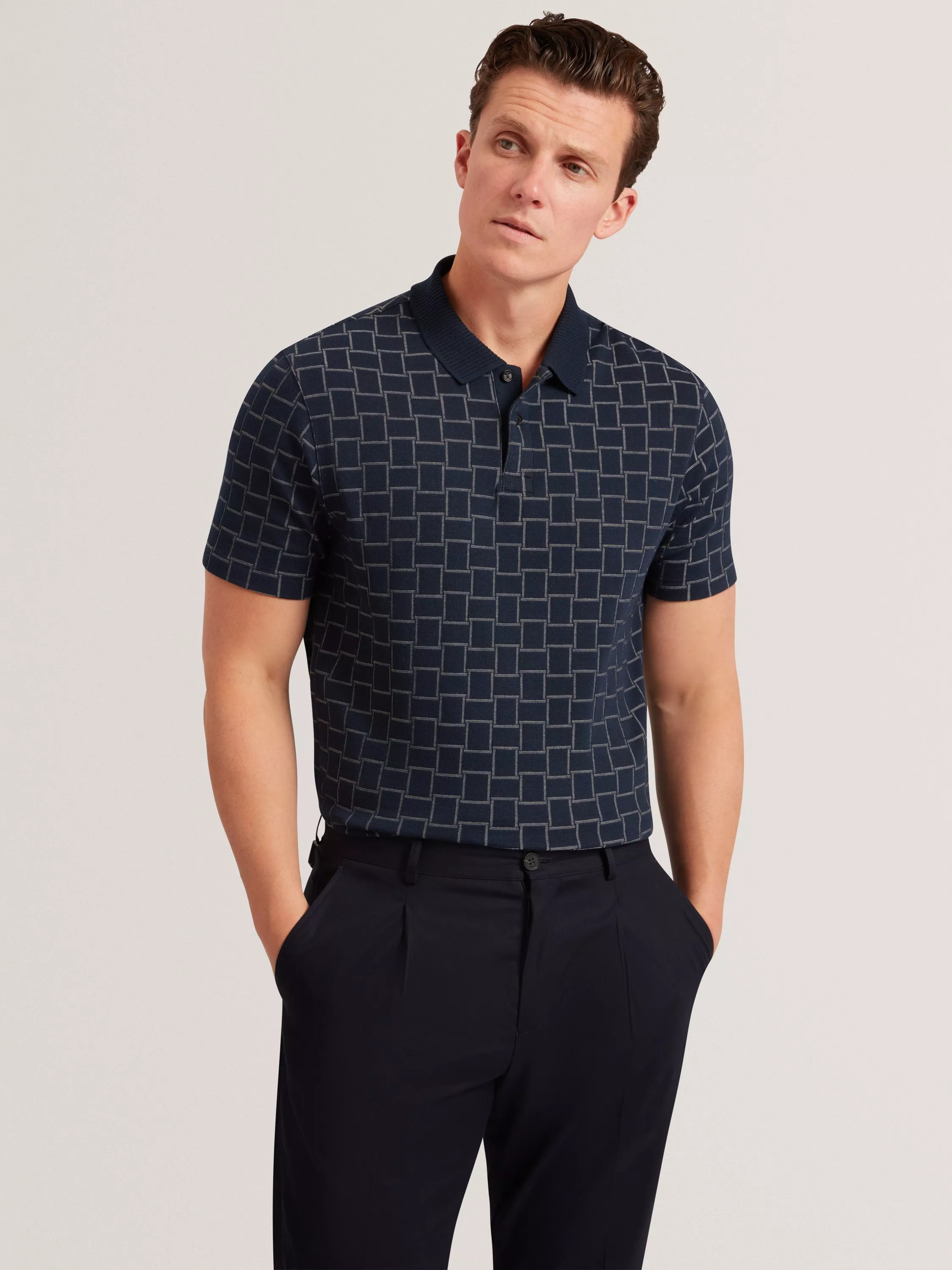 This polo shirt keeps you comfortable from morning meetings to leisurely afternoons. Its geometric pattern adds smart detail, while the collar and regular fit offer easy-going confidence.